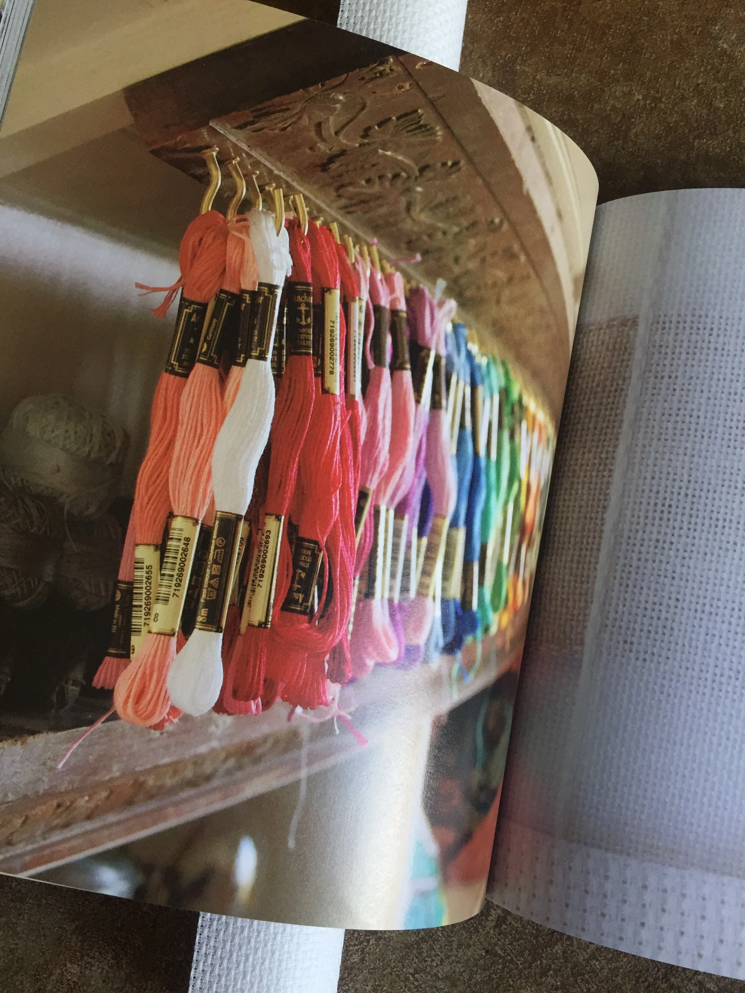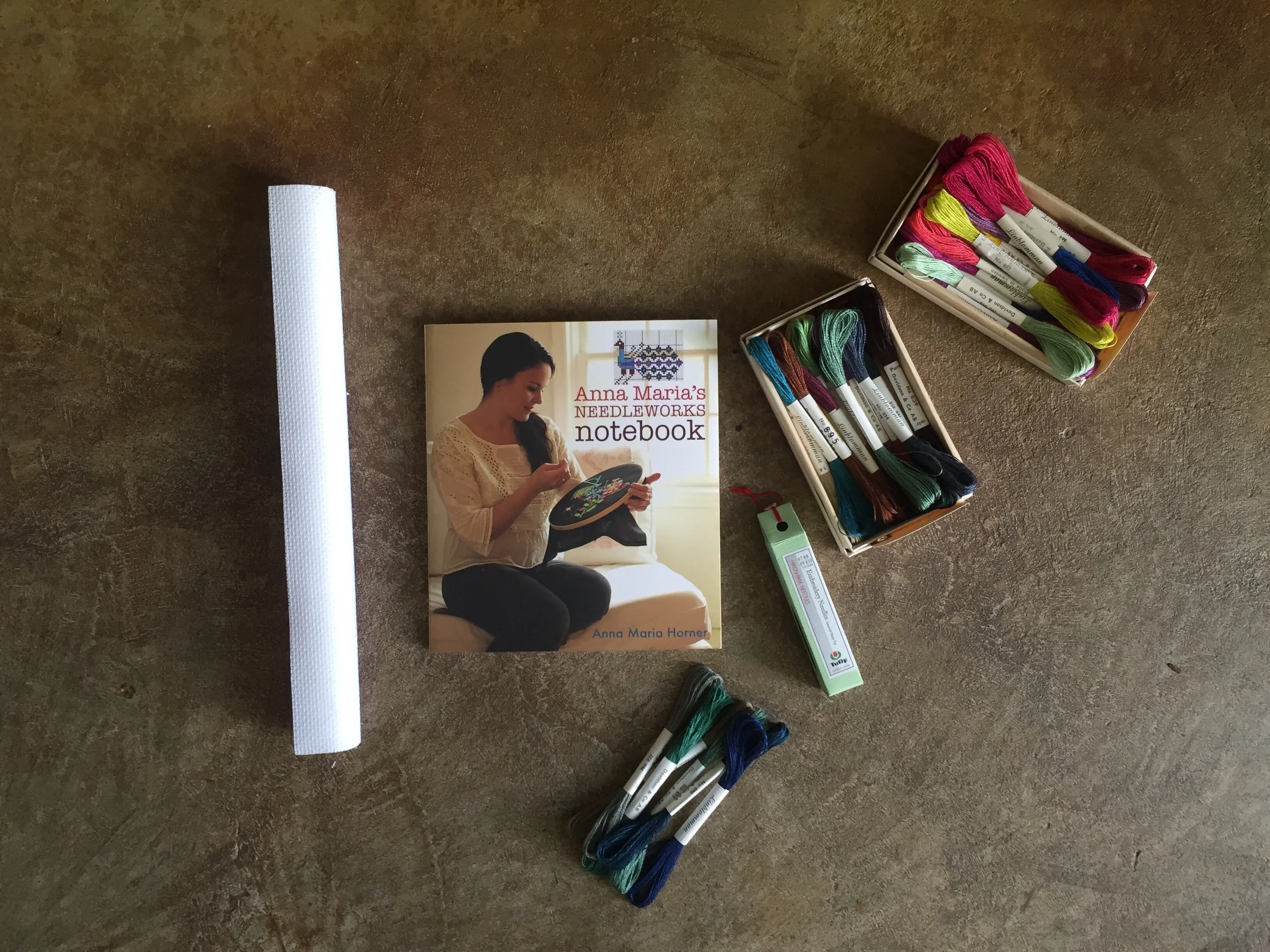 A A A, what begins with A? Anna Maria's Needleworks Notebook, aida cloth, amazing embroidery needles and all these beautiful floss skeins!