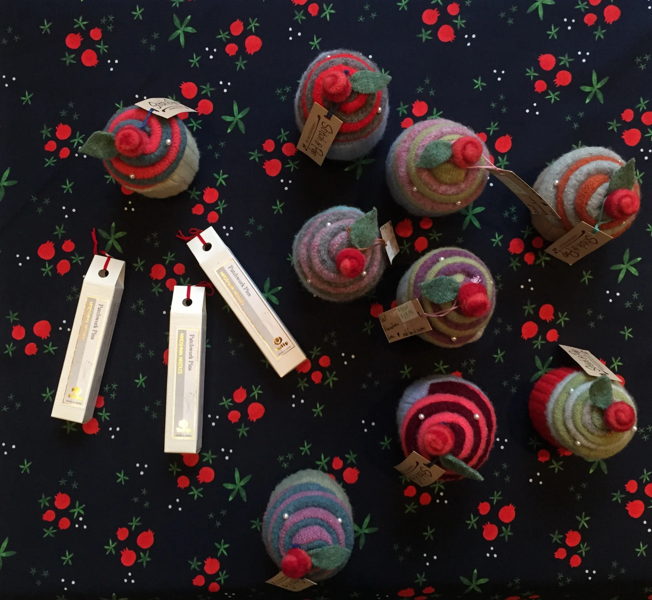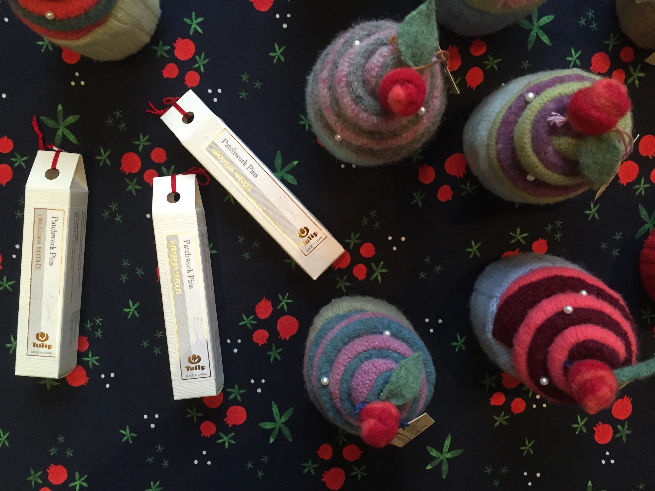 Here's a wonderful gift idea for a beginning stitcher! Local pin cushions handmade by our lovely Sarah accompanied by Tulip brand glass head pins.