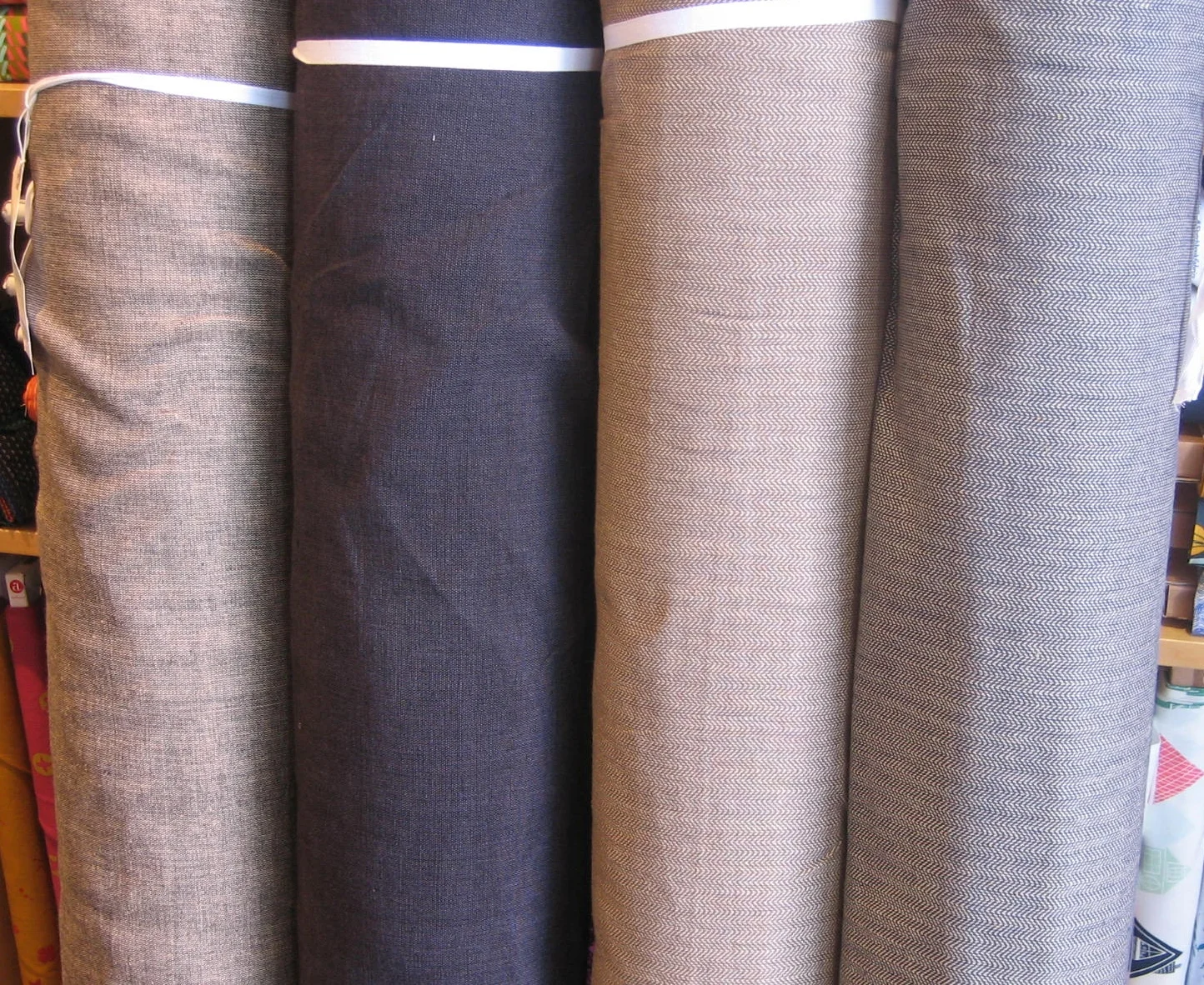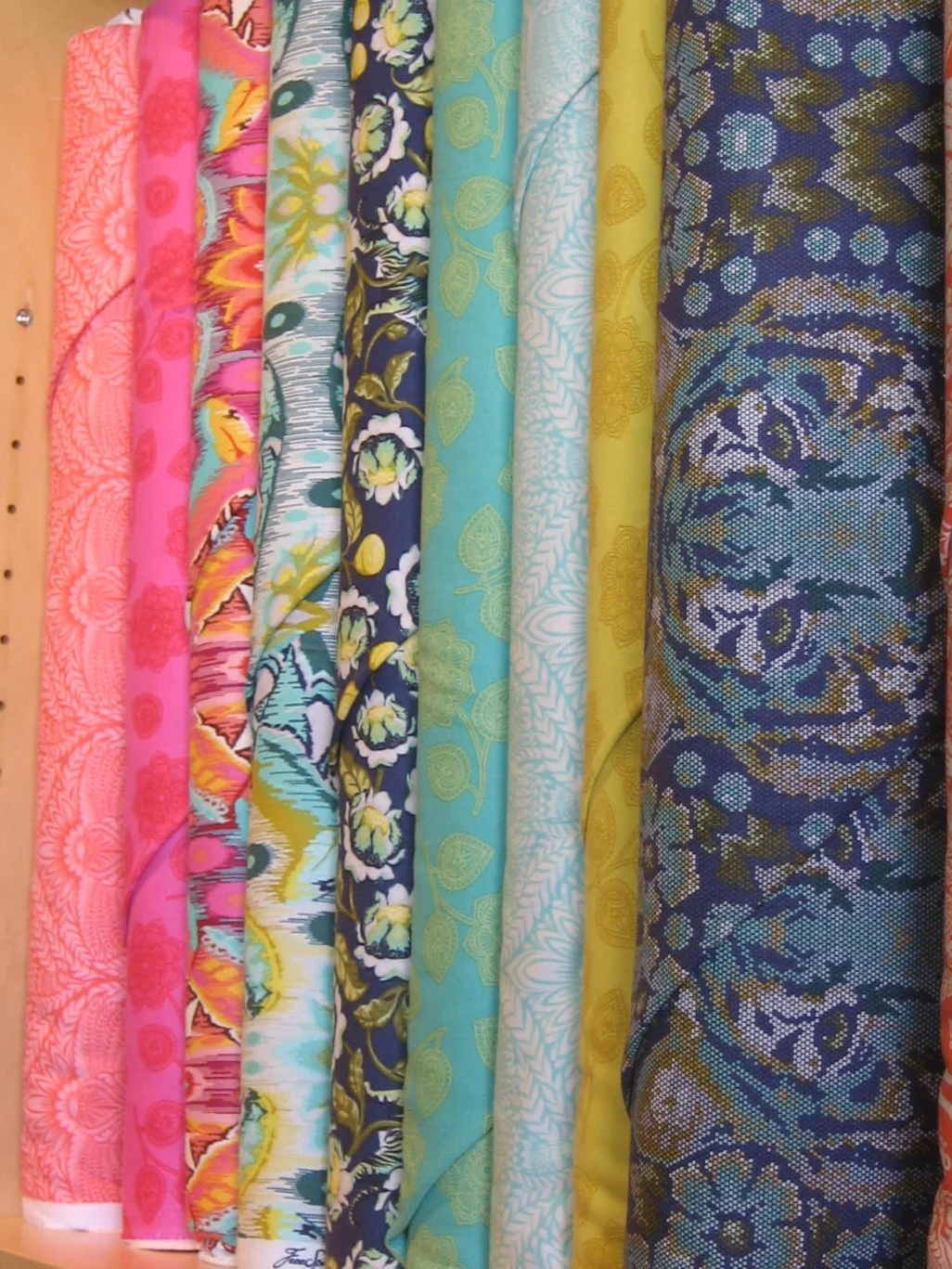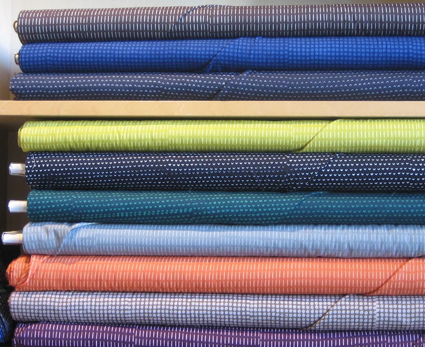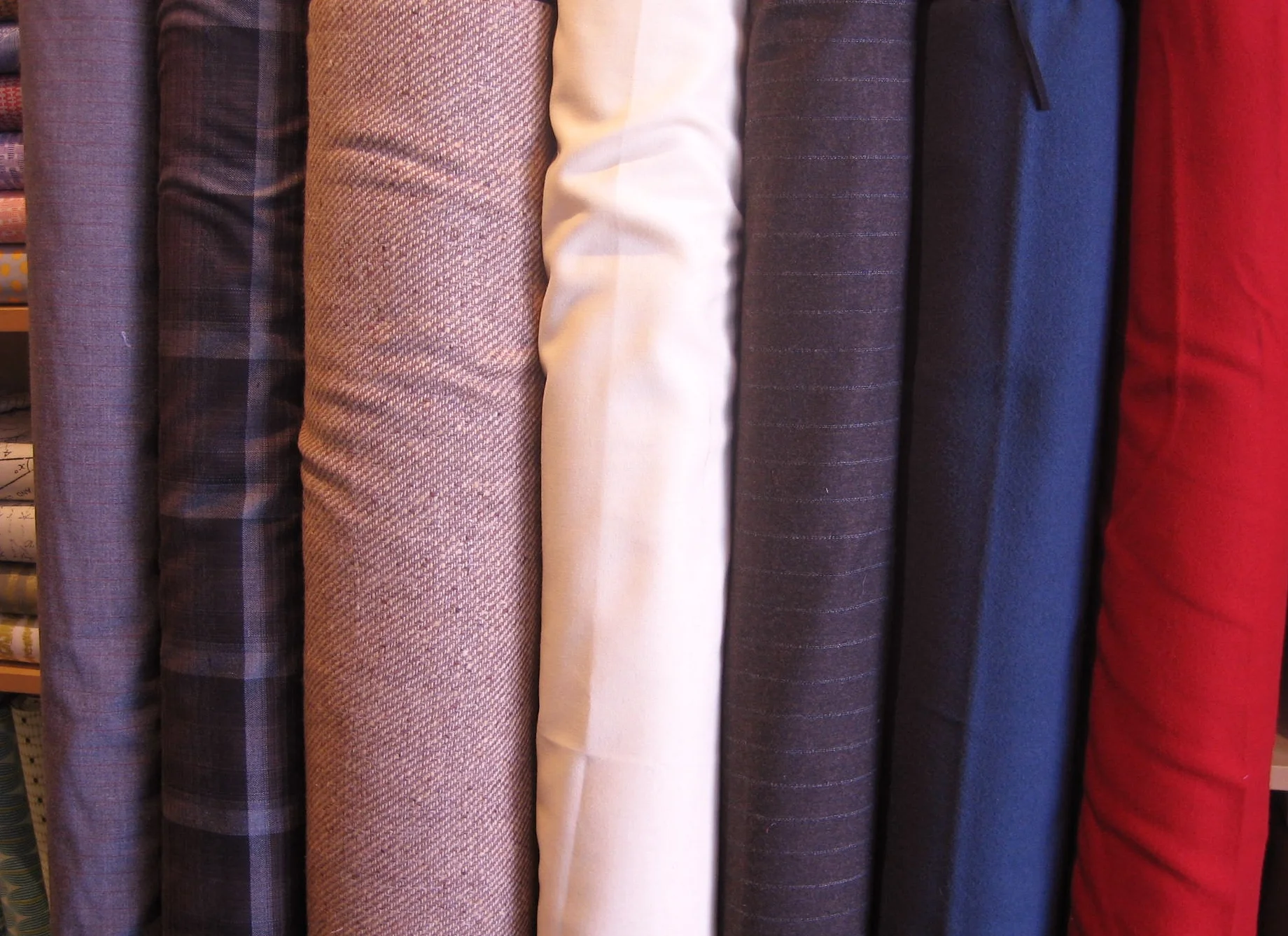 We were busy, busy, busy yesterday receiving a large order of apparel fabrics that includes some gorgeous wools, silks, knits, including some super cozy fleeces. Here's a shot of some of our current wool and wool blends. That lovely crisp autumn air is right around the corner, I imagine....