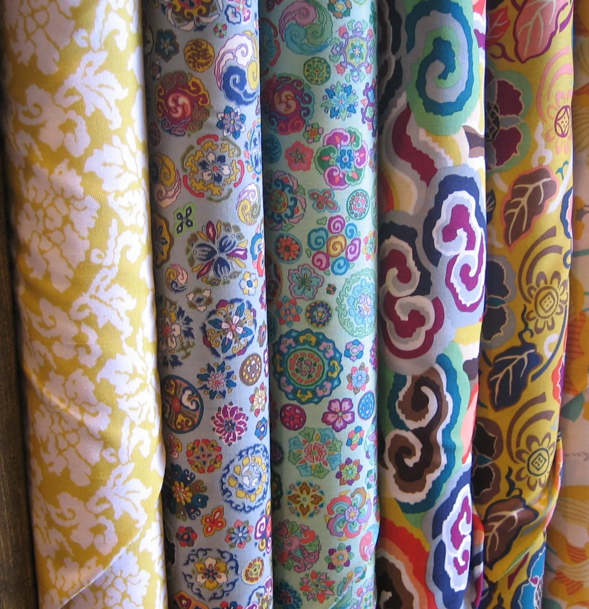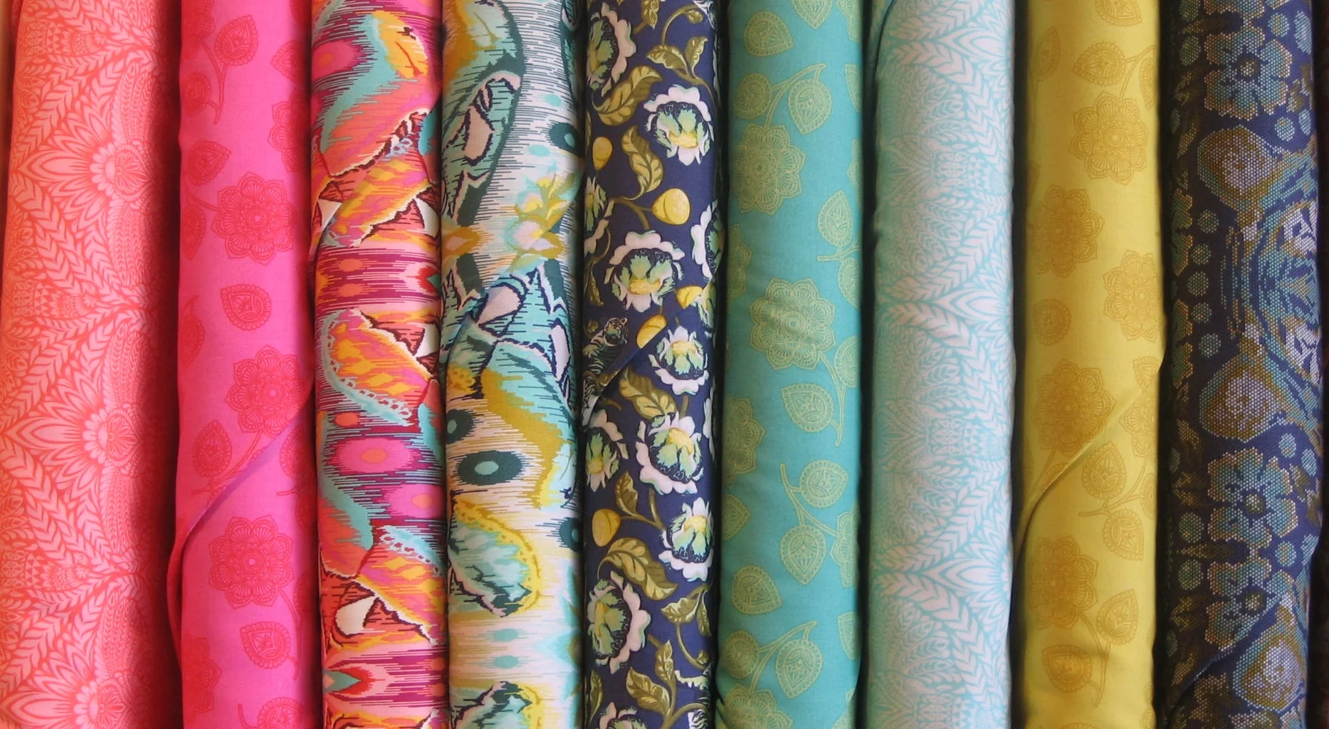 One of my current favorite places in the store right now is in front of these beauties, dreaming up the projects I want to make with them. Modern batiks from Hoffman's ME + YOU group. We'll share more about this group soon.