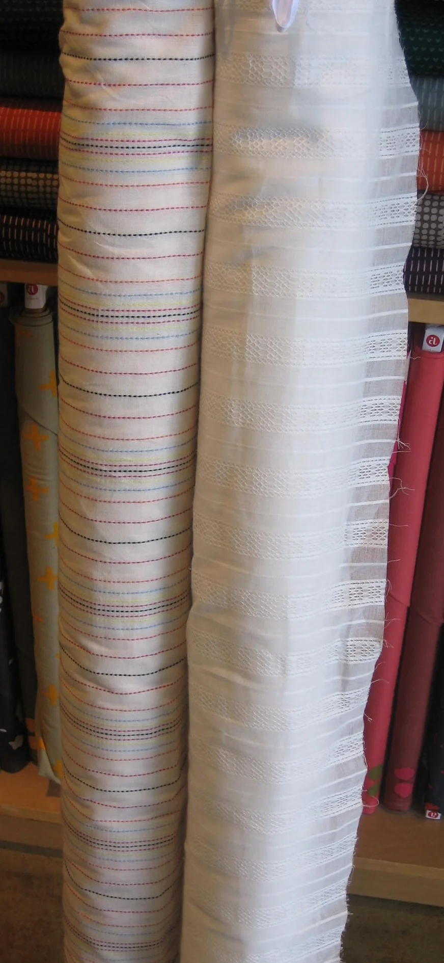 We have some of the most beautiful pieces in the store right now. I'm so excited to show them off! Photos will not show them off as well as an in person visit, but we'll whet your appetite. One of the latest additions that I am particularly excited about are hand loomed organic cottons from India, many of which are a lovely upholstery weight. (The four below are nice and heavy.)