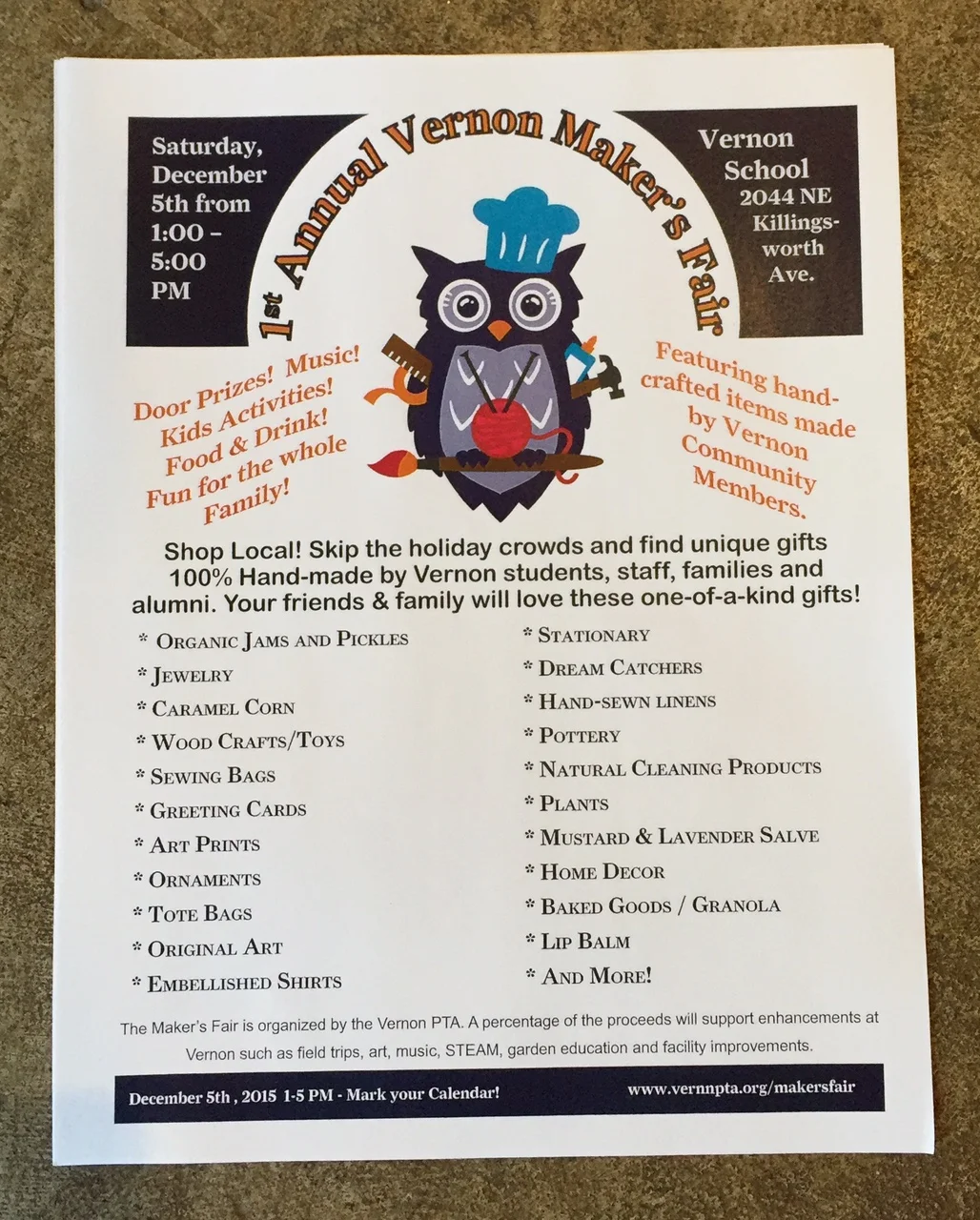 Looking for handmade goodies for your holiday gift giving? Head on over to the Vernon School Makers Fair and feel great about supporting our neighborhood school!