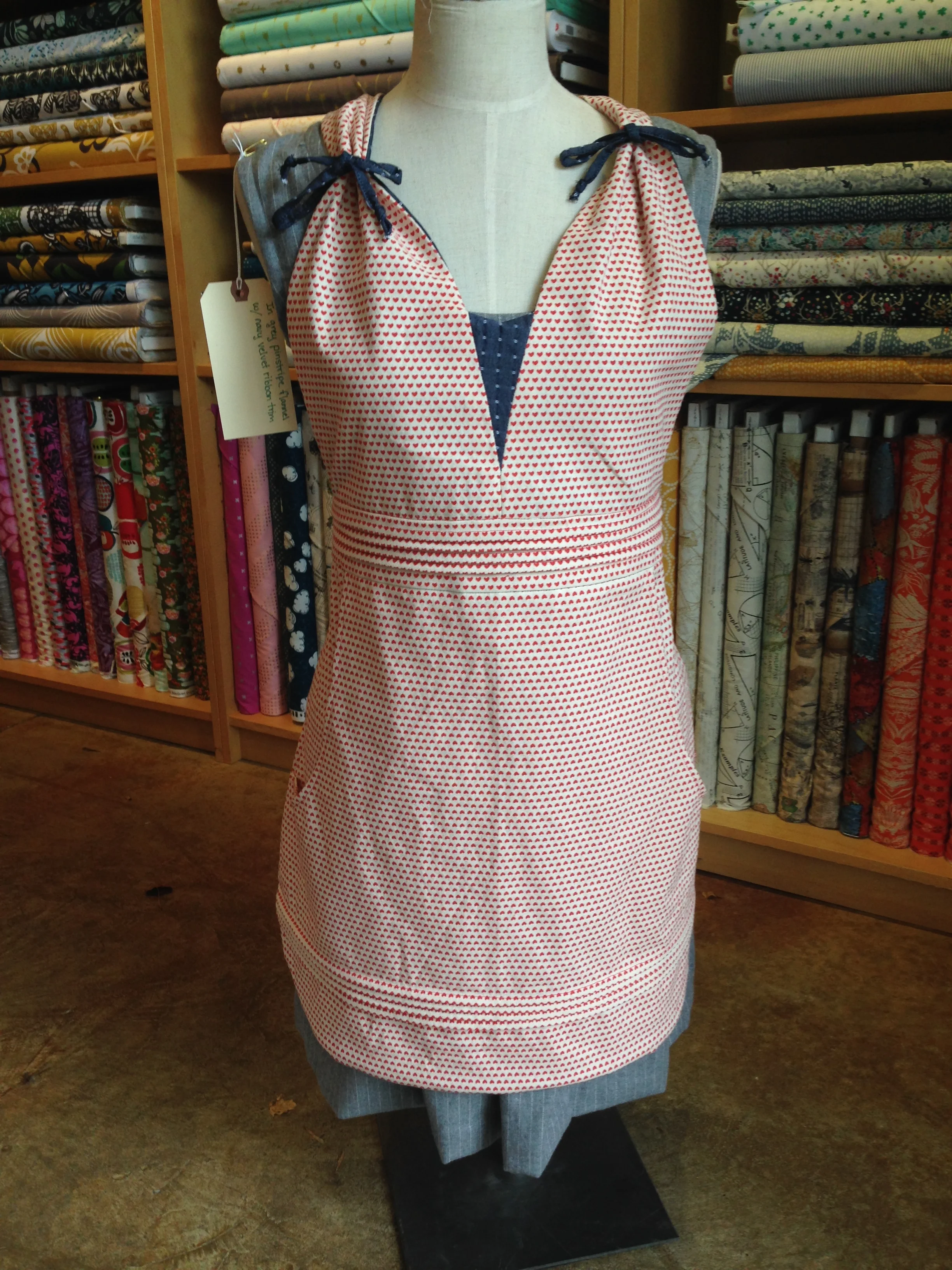 Nadia made the charming Gathering Apron by Sew Liberated in a Japanese cotton/linen blend with tiny red hearts and a dotted chambray as an accent. I love all of the sweet details on this apron - pleats, scoop pockets, little bows.