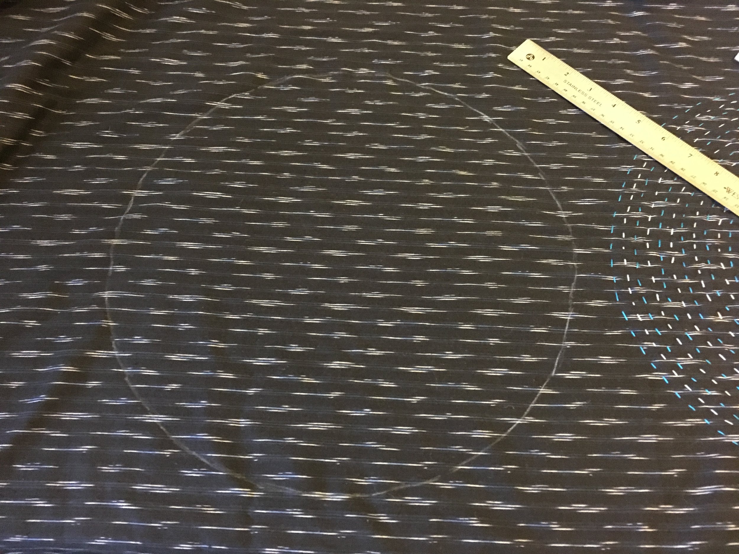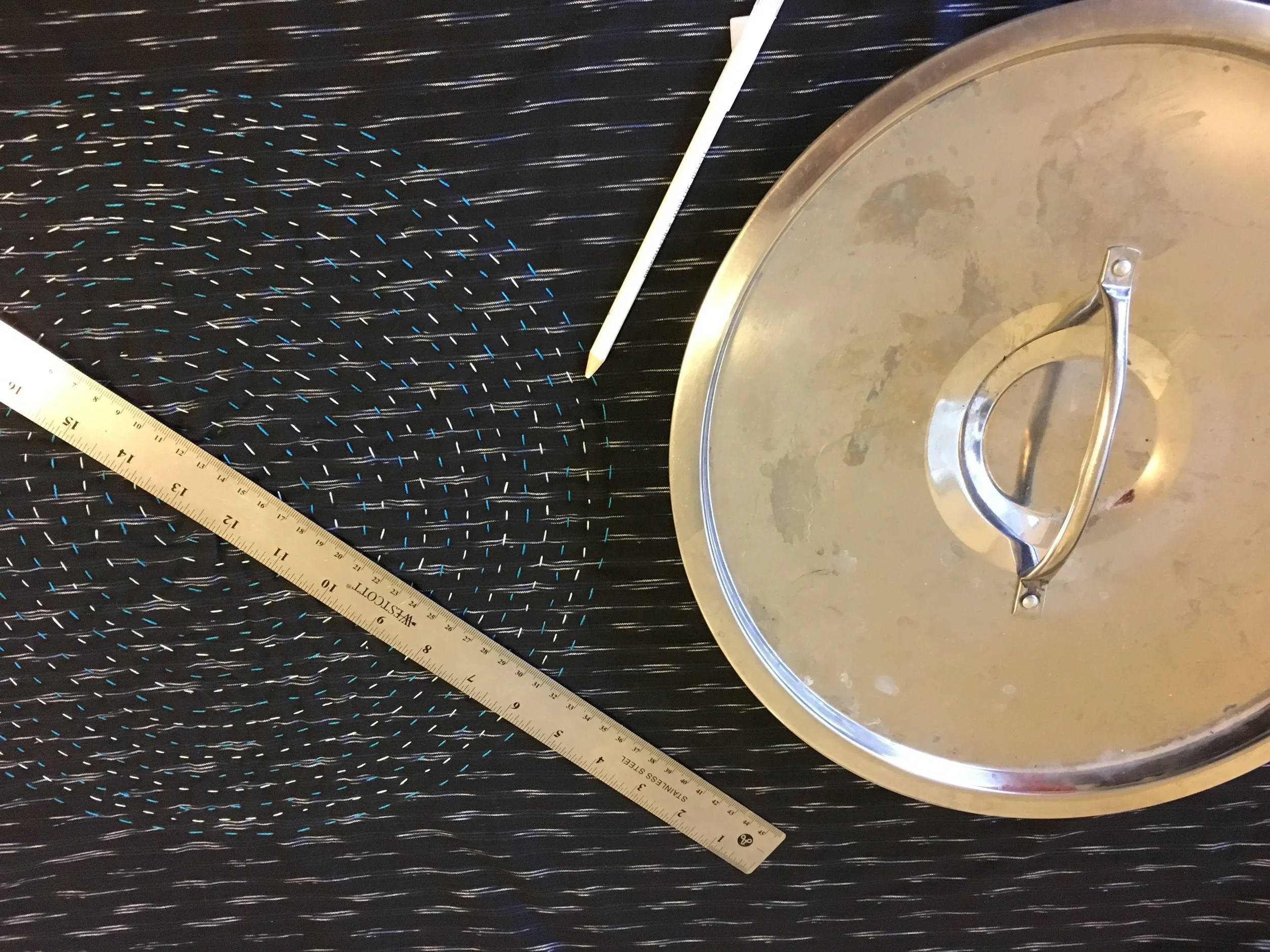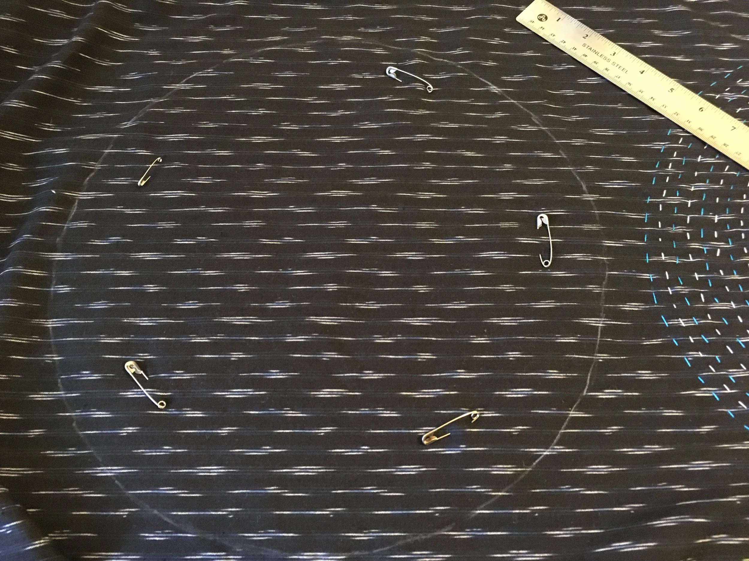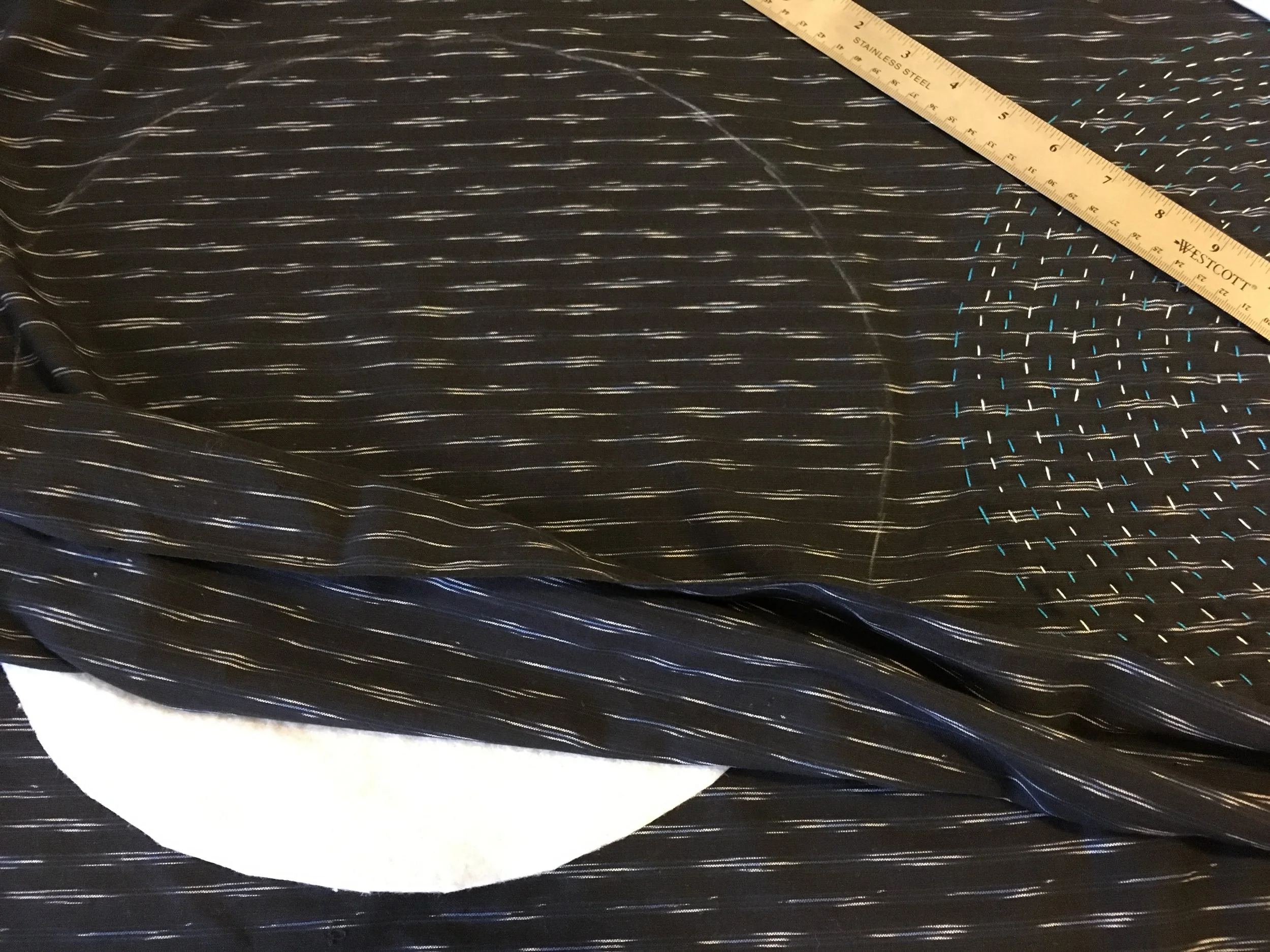 It is not pictured but the shawl actually has three quilted circles so that when worn, one will be centered on the back of the wearer and the other two circles will lay over both shoulders and upper arms. With fabric laid out flat measure and mark the placement of the circles so they are symmetrical and centered. For the circle template, I used a very large pot lid. If you do not have a large object laying around to help you draw a circle you can always use the old string and pencil trick.