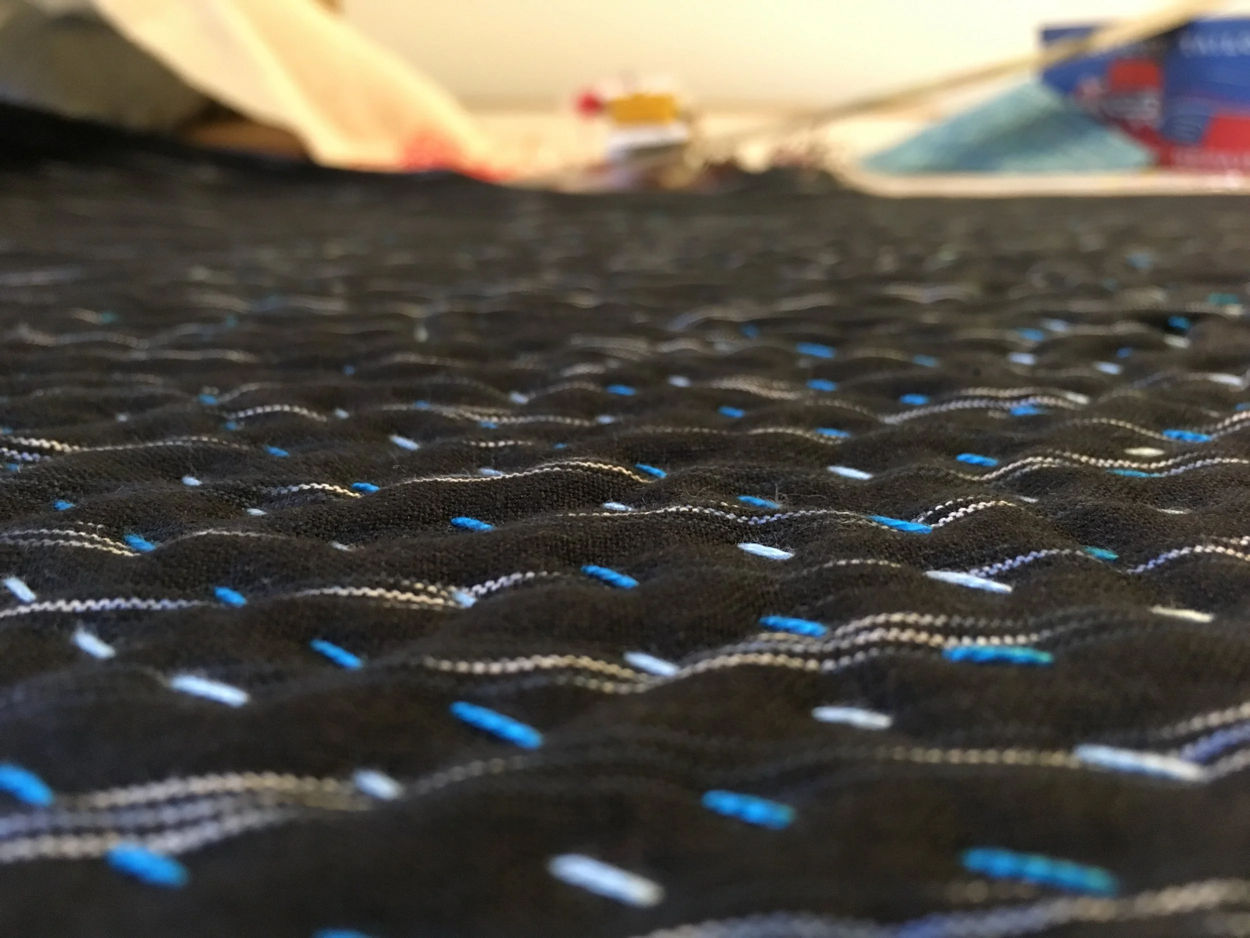 With a hankering for a fun project that would allow me to put my feet up, relax and hand stitch to eternity, or rather, hand stitch through an entire movie or two, was the inspiration for this warm and modern quilted shawl. Couch projects are the best, am I right? A layer of low-loft cotton batting, just where the circles are, gives it both insulation for added warmth, and volume for a little drama! If you are interested in making one for yourself or a loved one, directions follow.