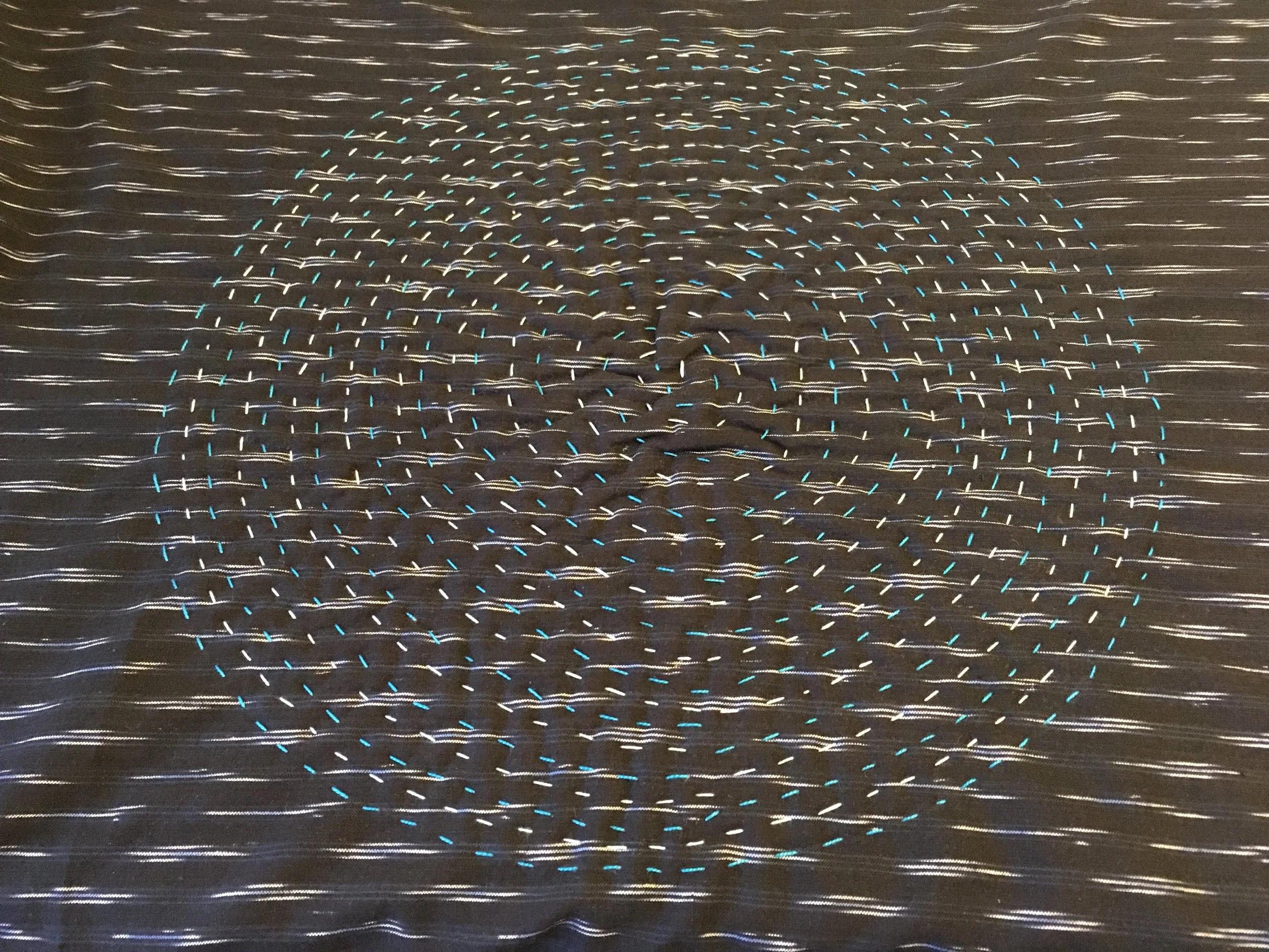 After all three circles are filled in with your beautiful stitch work, you are done and now you must get up off that couch and wear it out! Hope you enjoy this project and maybe it will inspire you to come up with your own stitching pattern, hmmm, like overlapping triangles, circles and squares in different colors on a solid shot cotton, oh man, now I want to make another one!