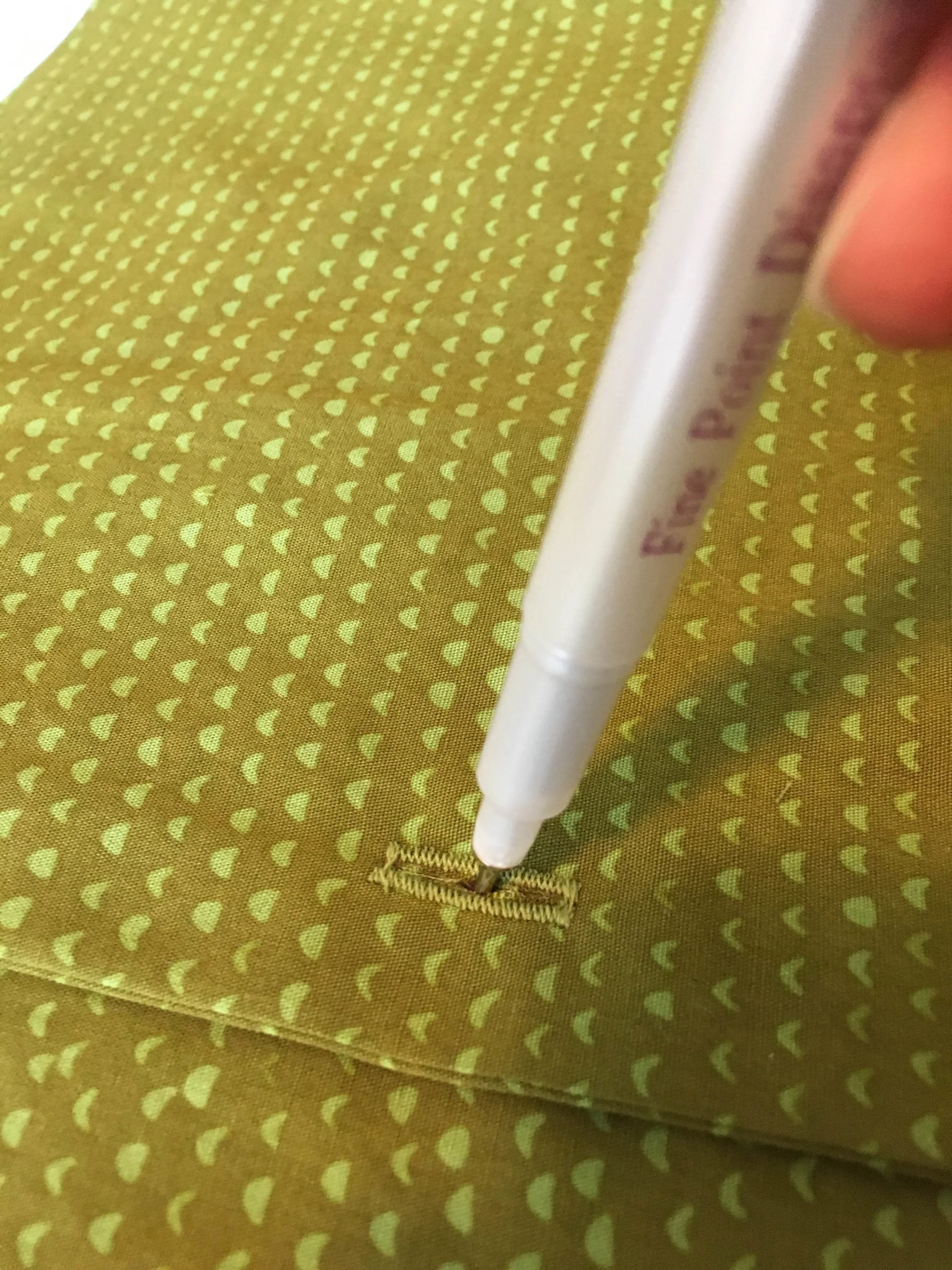 Overlap or lay the button hole side of the garment onto the side of the garment where the buttons will be sewn. Position it appropriately and if you want, put a few straight pins to keep it in place while you do the next step. The next step is to take a marking tool (I use the fine tip disappearing ink pen by Dritz that we sell at the shop) and push it through the center of the button hole making a dot on the button side of the garment.