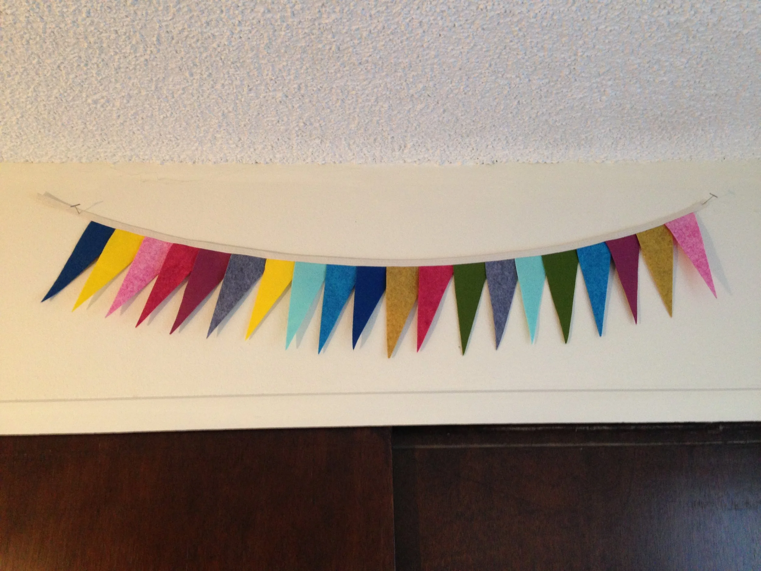 I used Melissa's blog post as a starting point. I cut triangles that are 6" long from the tip to the base, and picked out 10 different colors. That leaves me with enough felt to hang bunting in every corner of my house and to give some as Christmas gifts.