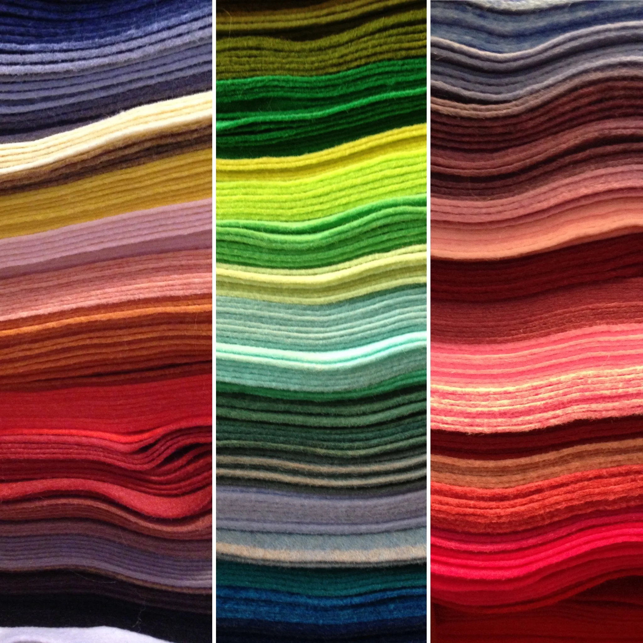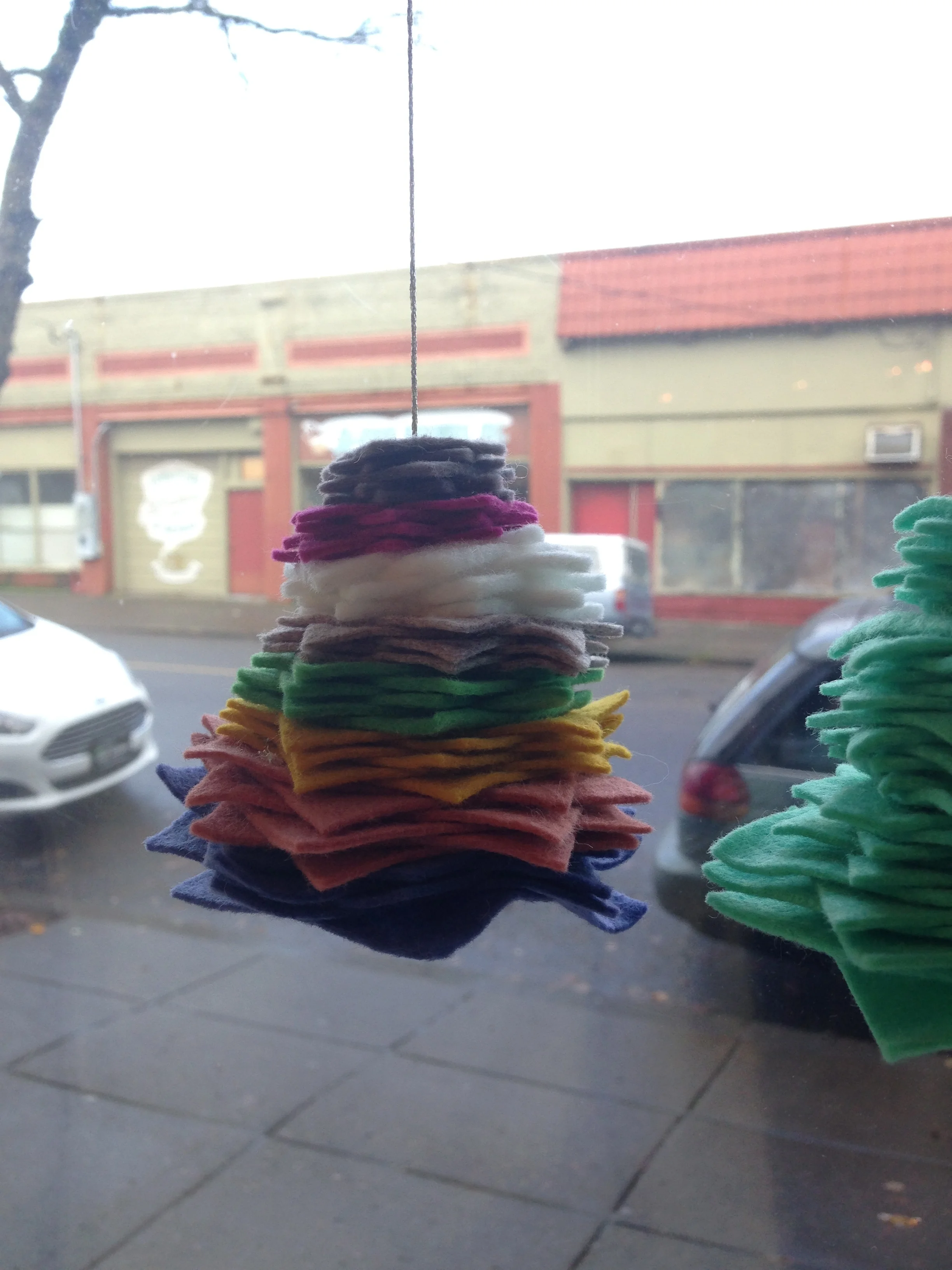 Hannah made a beautiful window display using our wool/rayon felt on the bolt. If you'd like to try this instead of/in addition to bunting, just cut small squares ranging in size from 1-4", stack, and thread onto some strong thread. With a little loop at the top, these felt stacks would be great ornaments!