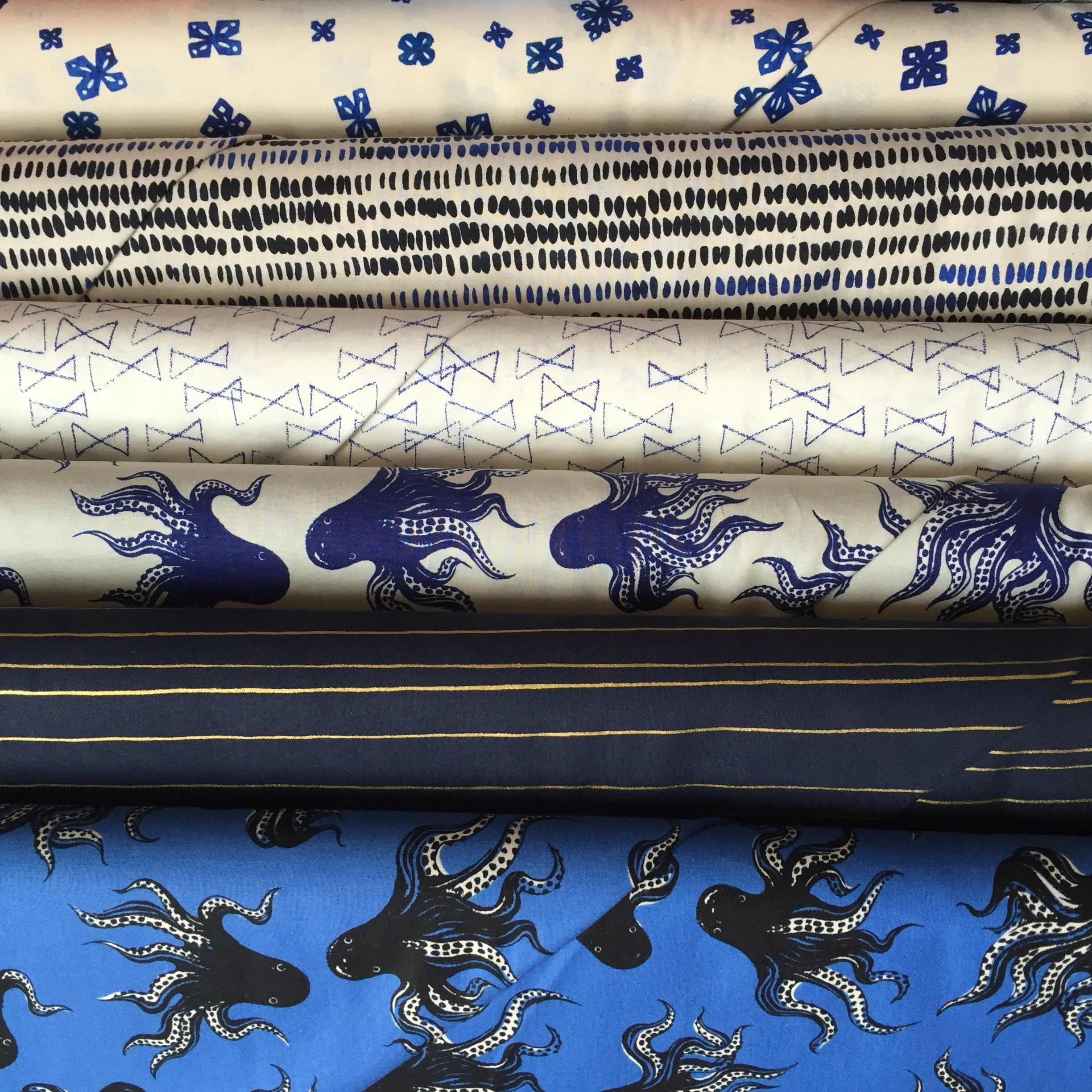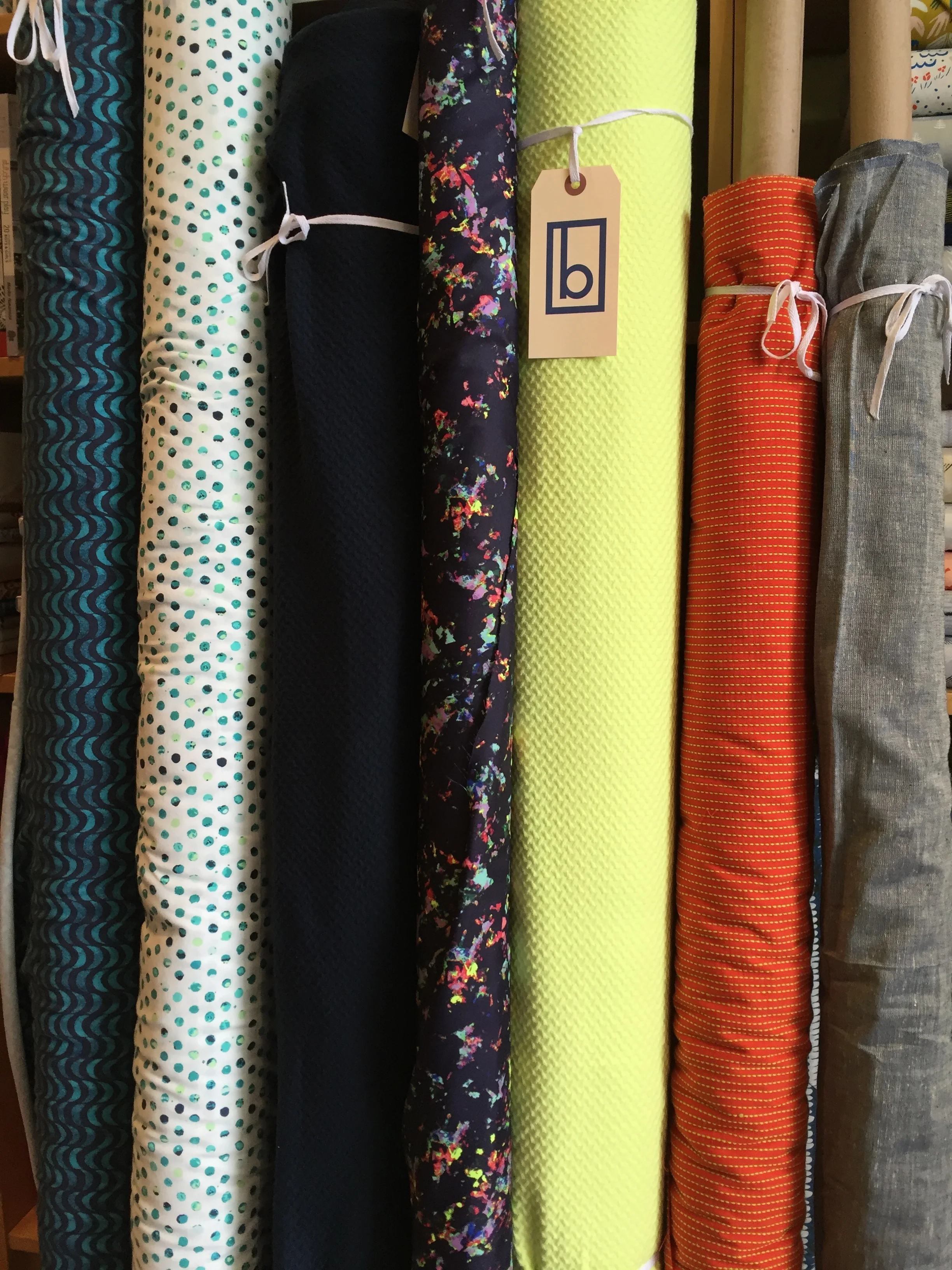 From left to right: printed knits from Art Gallery, two waffle-y texture knits in solid, colorful abstract poly, orange and yellow/green stitched cotton and a gorgeous light weight cotton khadi cloth.