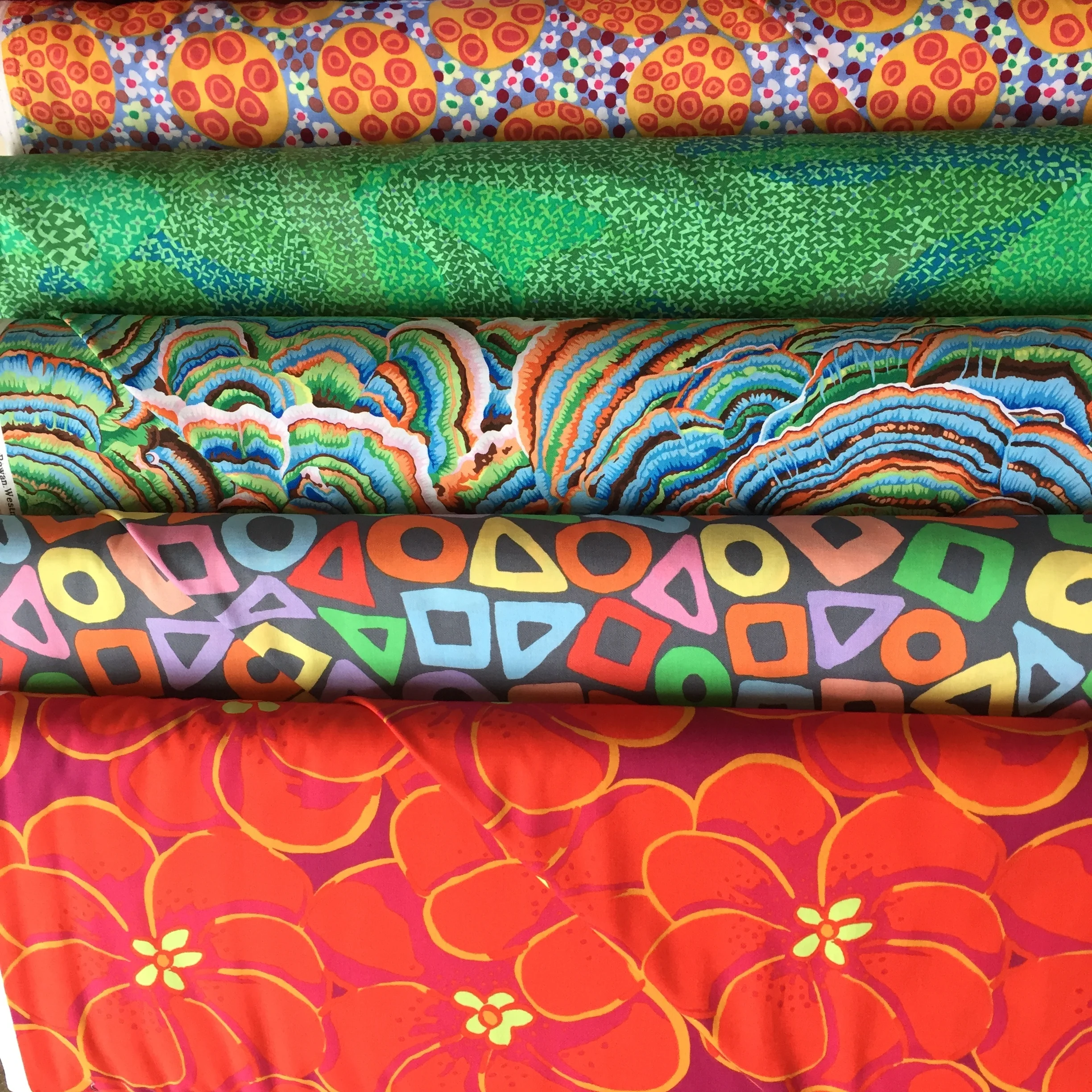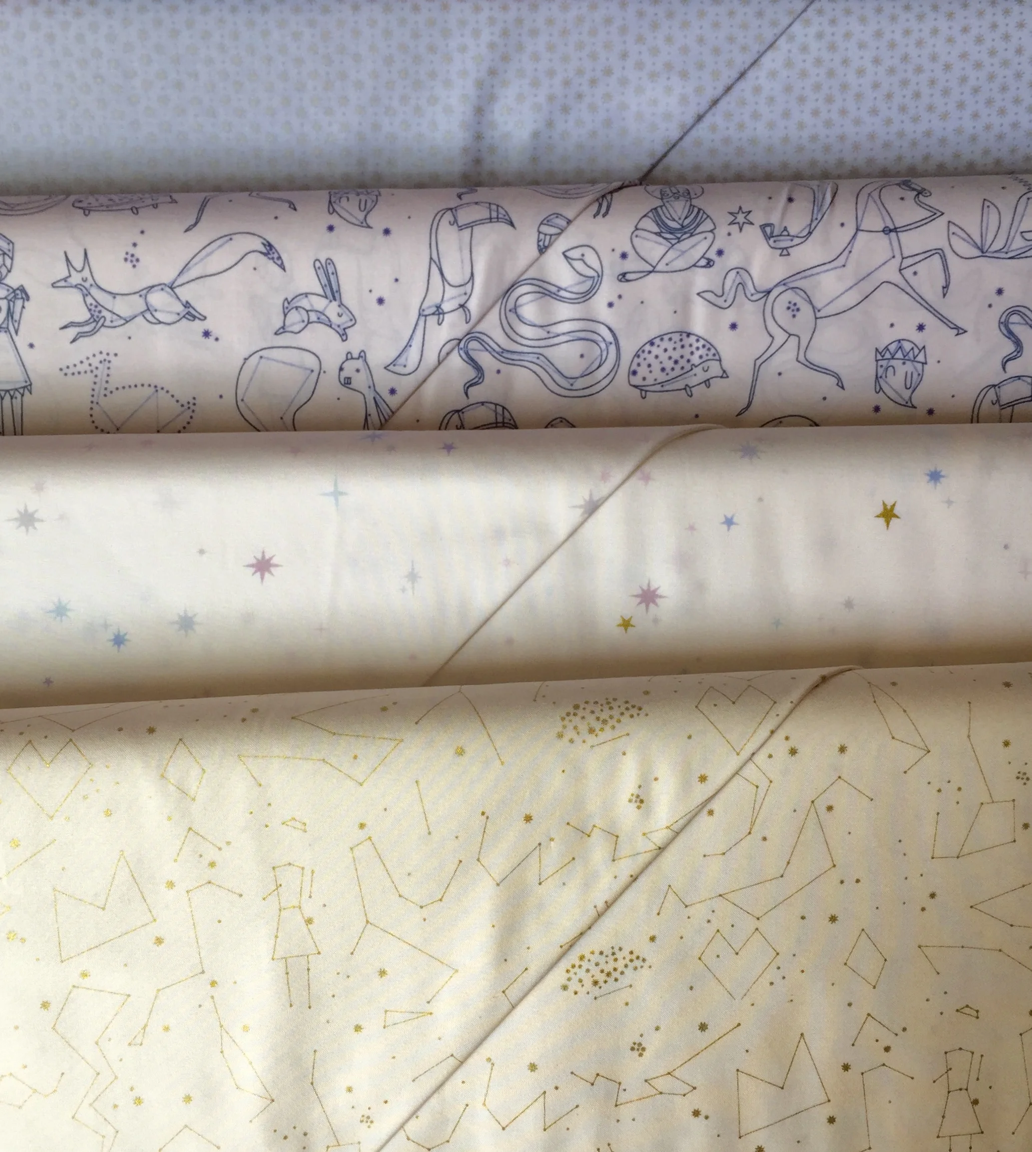 More quilting cotton prints. From top to bottom: Kaffe Fassett and friends, latest from Alison Glass's batik group, and Lizzy House's metallic star scenes. Fun, colorful, sparkly!