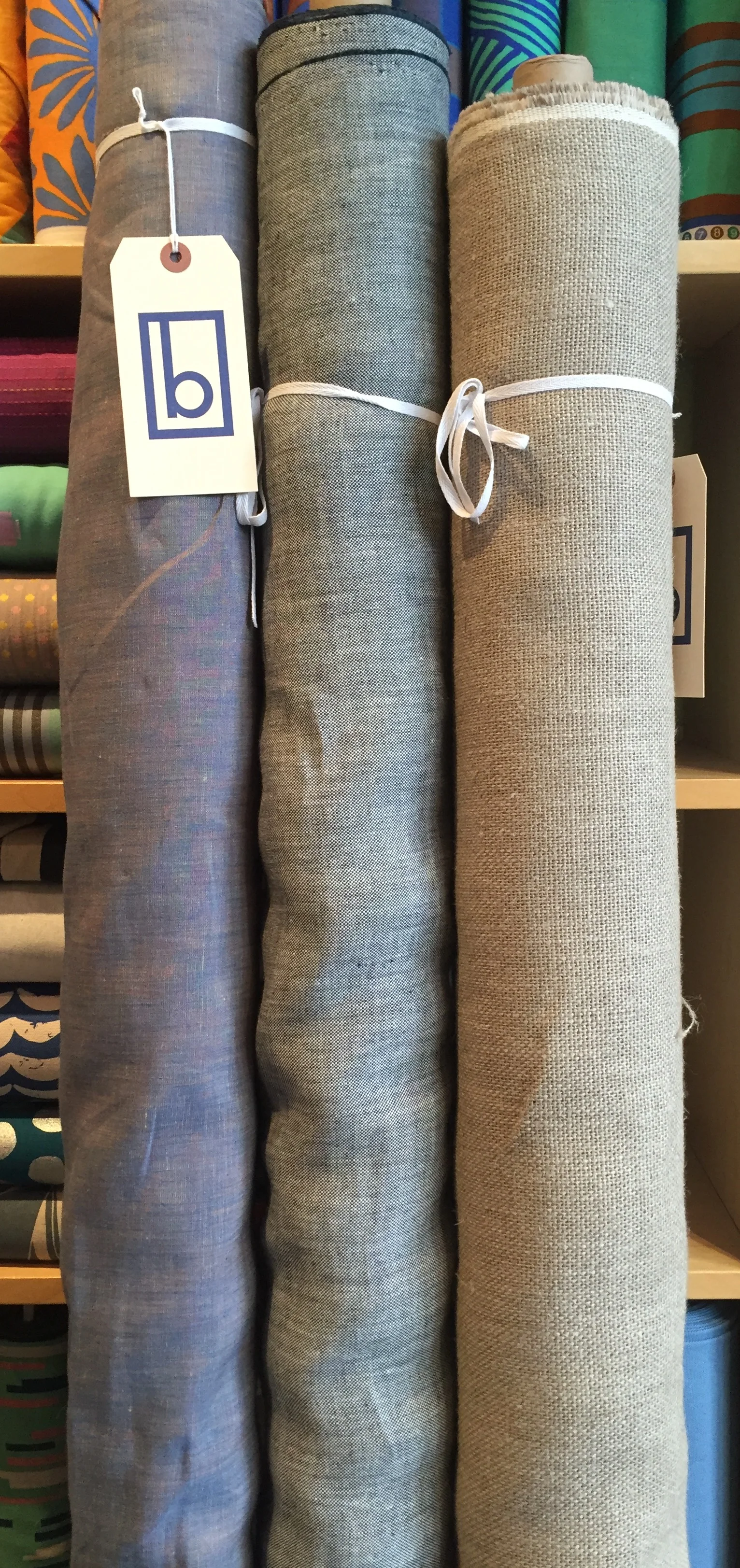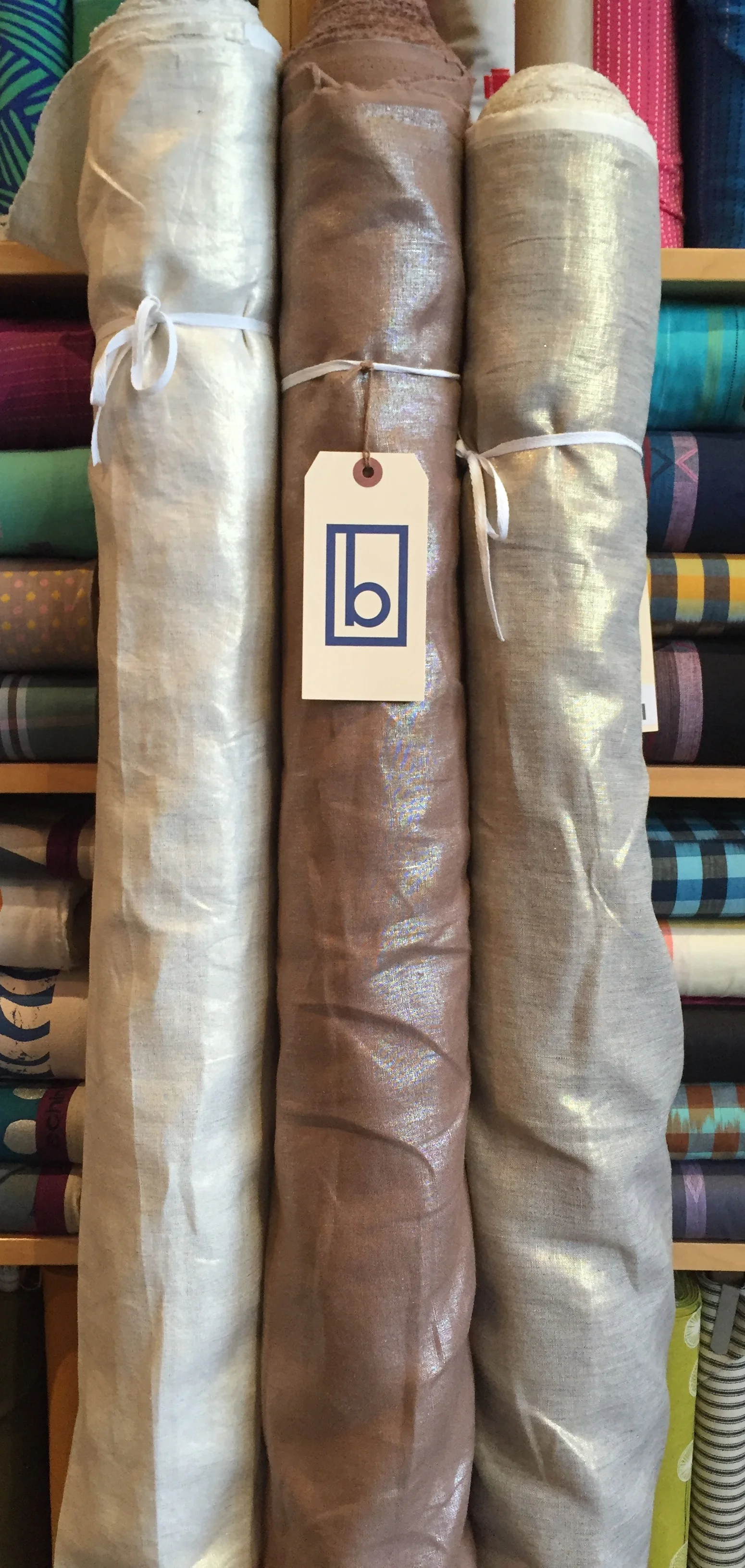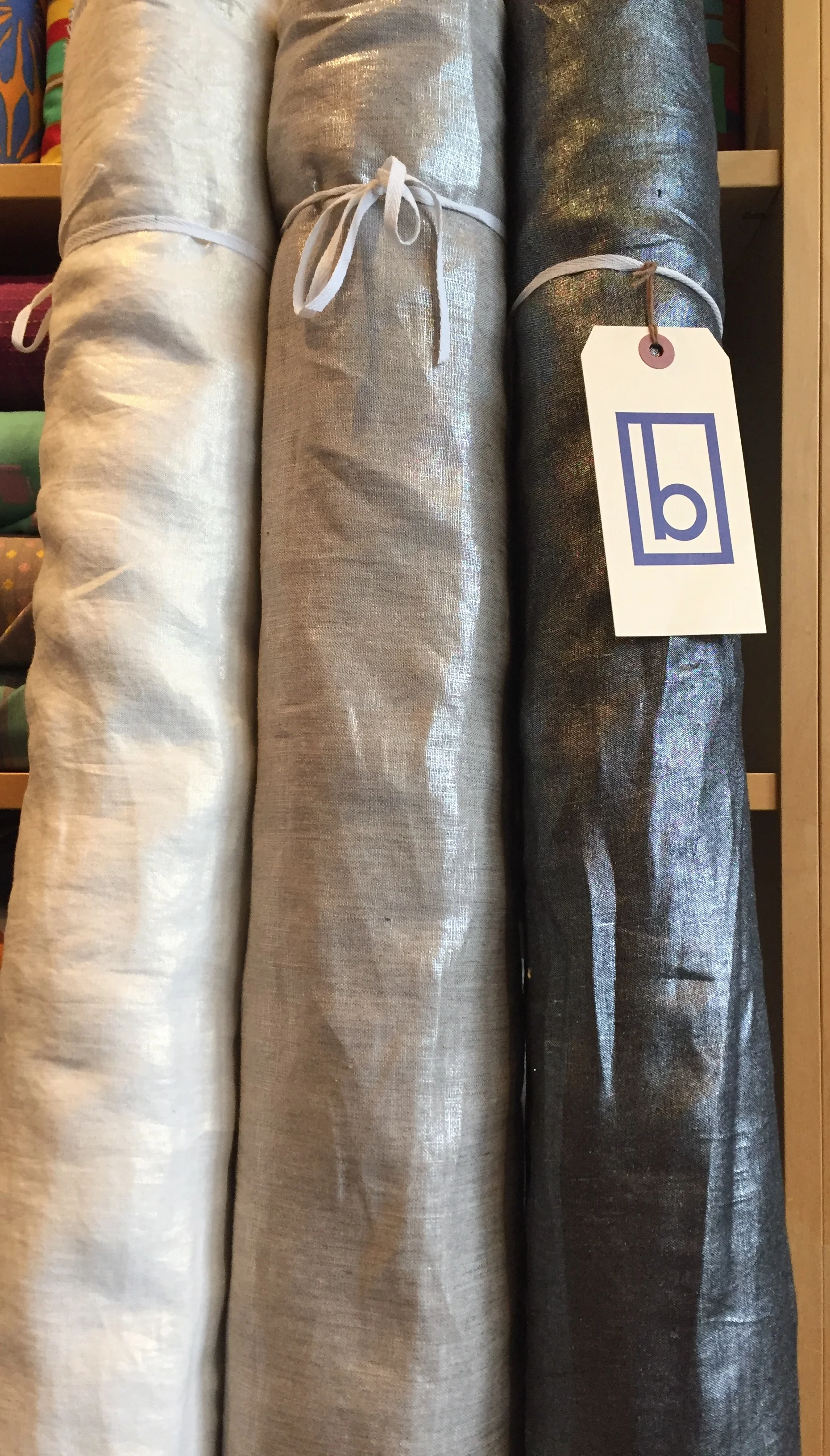 Another selection of goods that's got us all pretty giddy around here is the metallic linen in two different weights, printed linen and various solid linens. Many of these are upholstery worthy. Or clothing, draperies, and other home goods. Love!