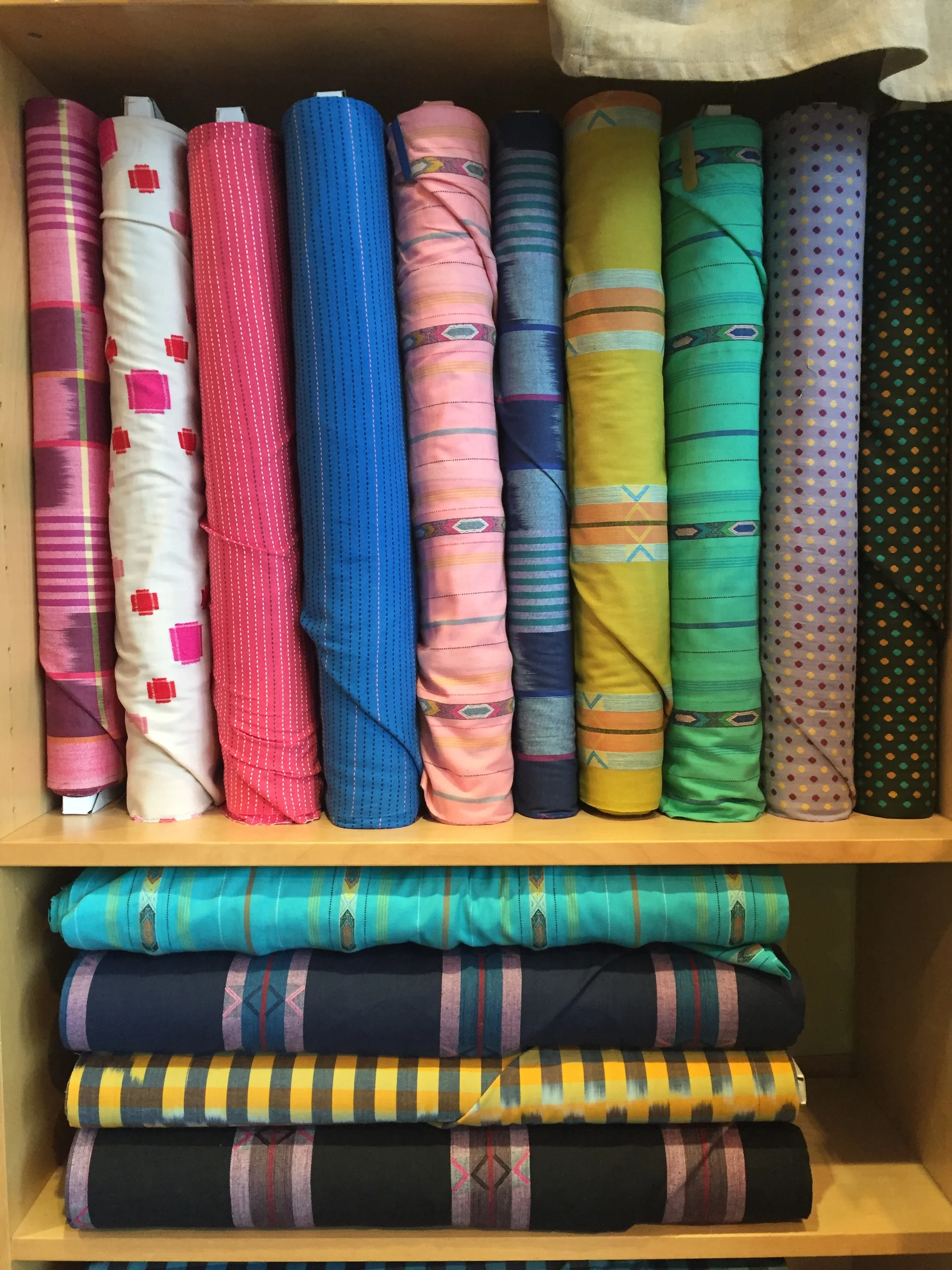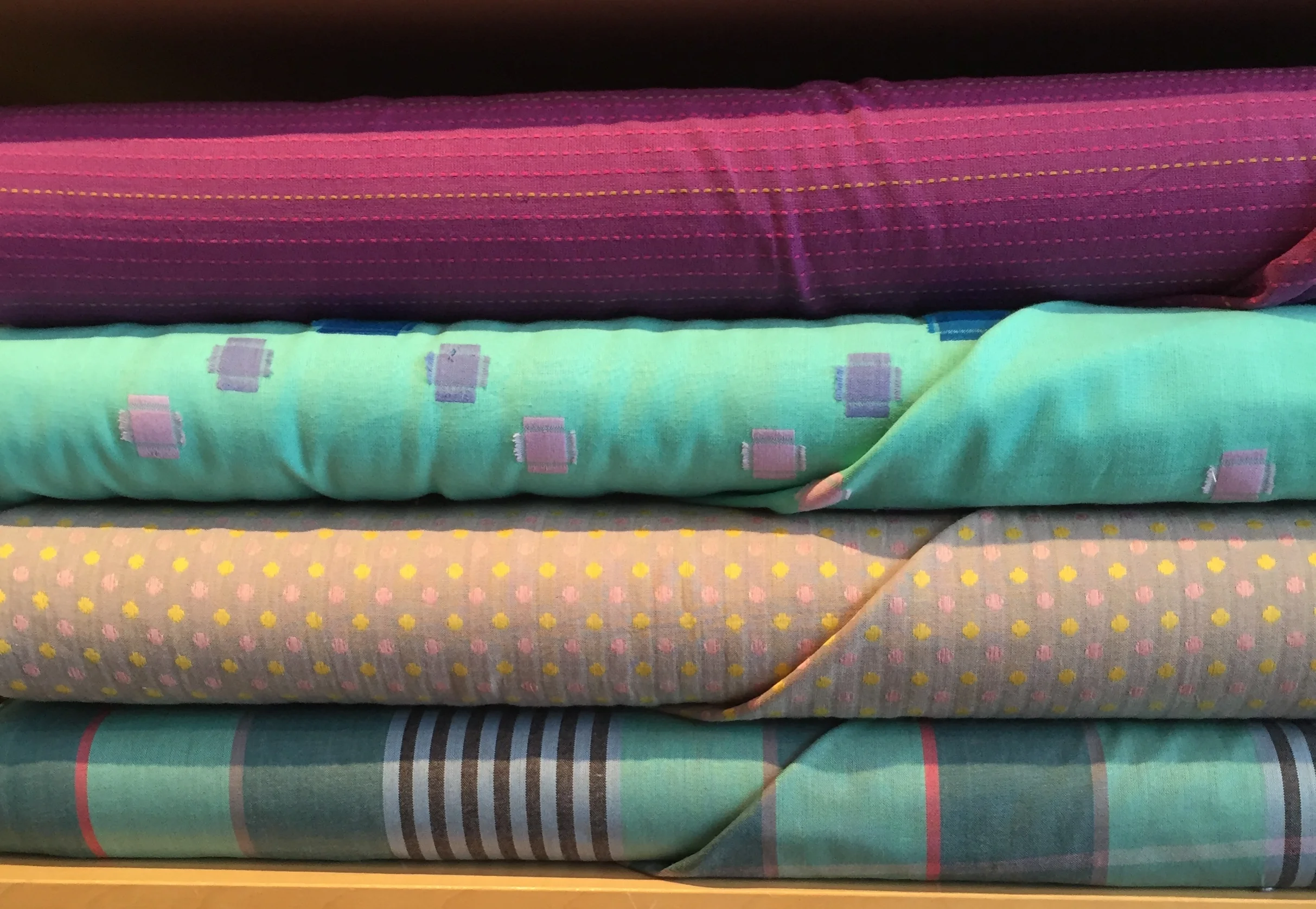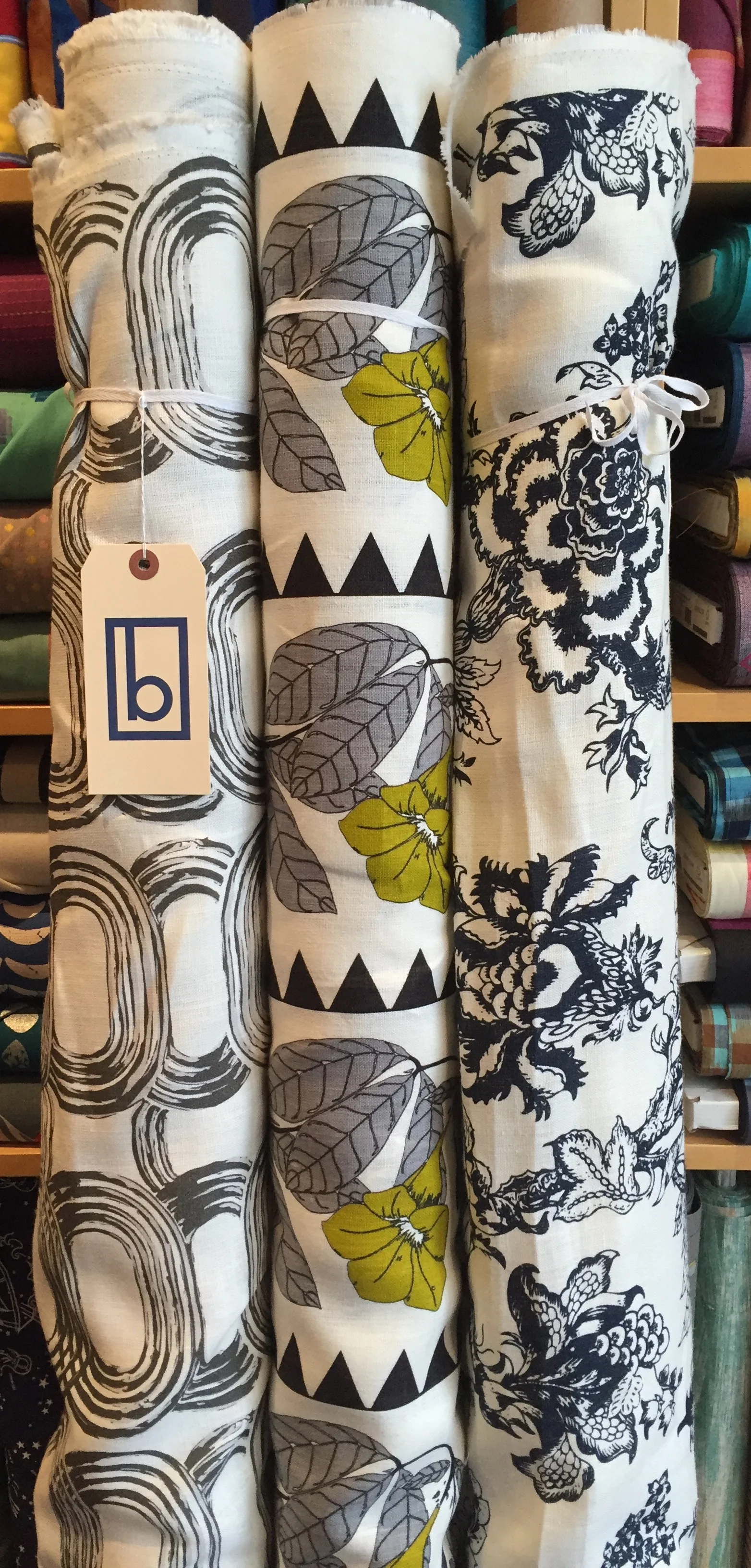Another selection of goods that's got us all pretty giddy around here is the metallic linen in two different weights, printed linen and various solid linens. Many of these are upholstery worthy. Or clothing, draperies, and other home goods. Love!
