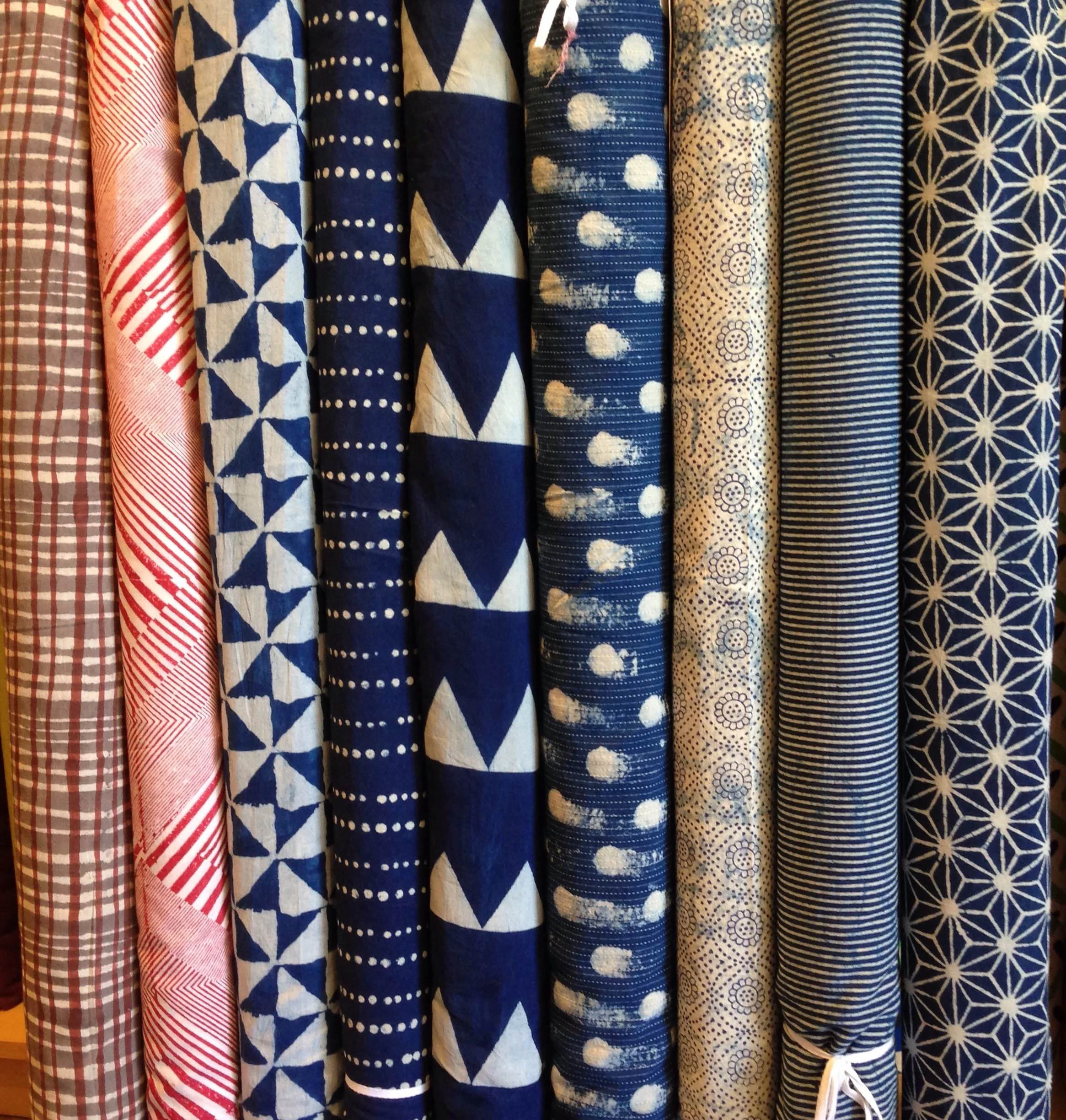 First we have a healthy batch of block prints from Merchant & Mills. On the left we have a watercolor check and bold red block print, while to the right we have yards and yards of bold indigo. All of these are on a lightweight 100% cotton. They have a little bit more body than lawn but are soft and billowy - perfect for summer.