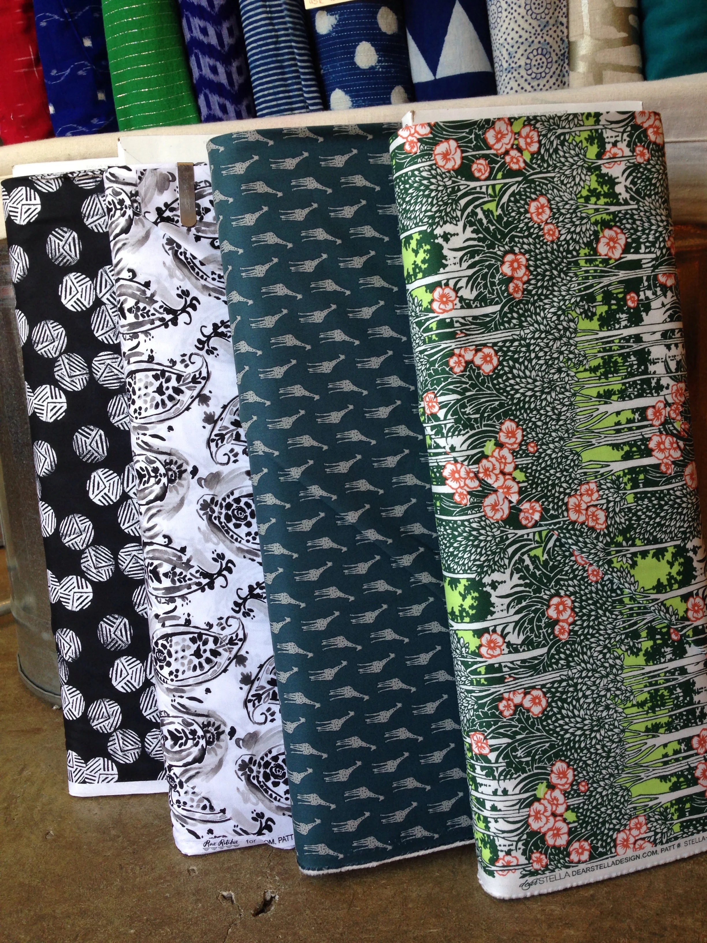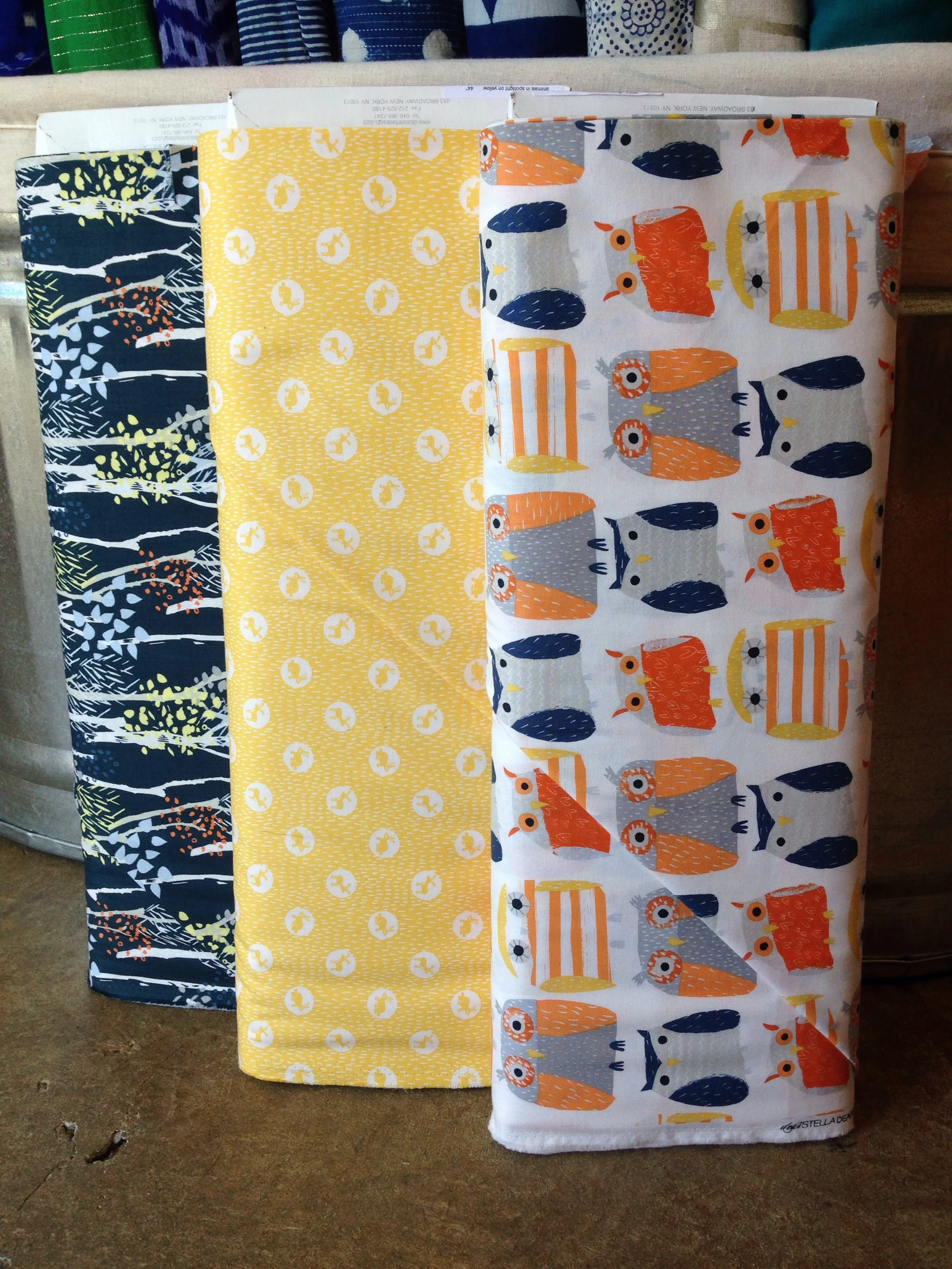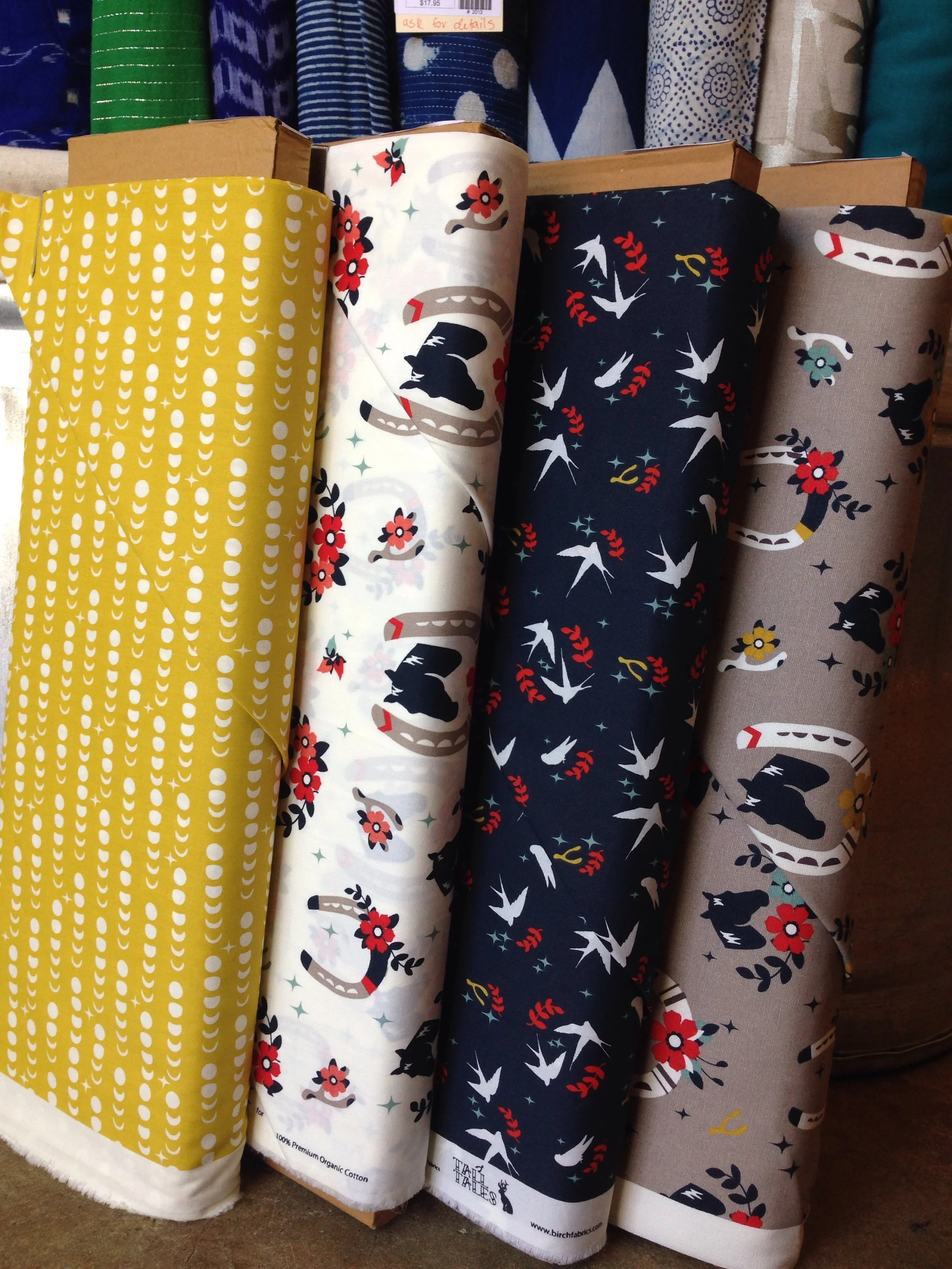 Organic quilting cottons and canvas (far right) from Birch fabric featuring moon phases, horses, and birds.