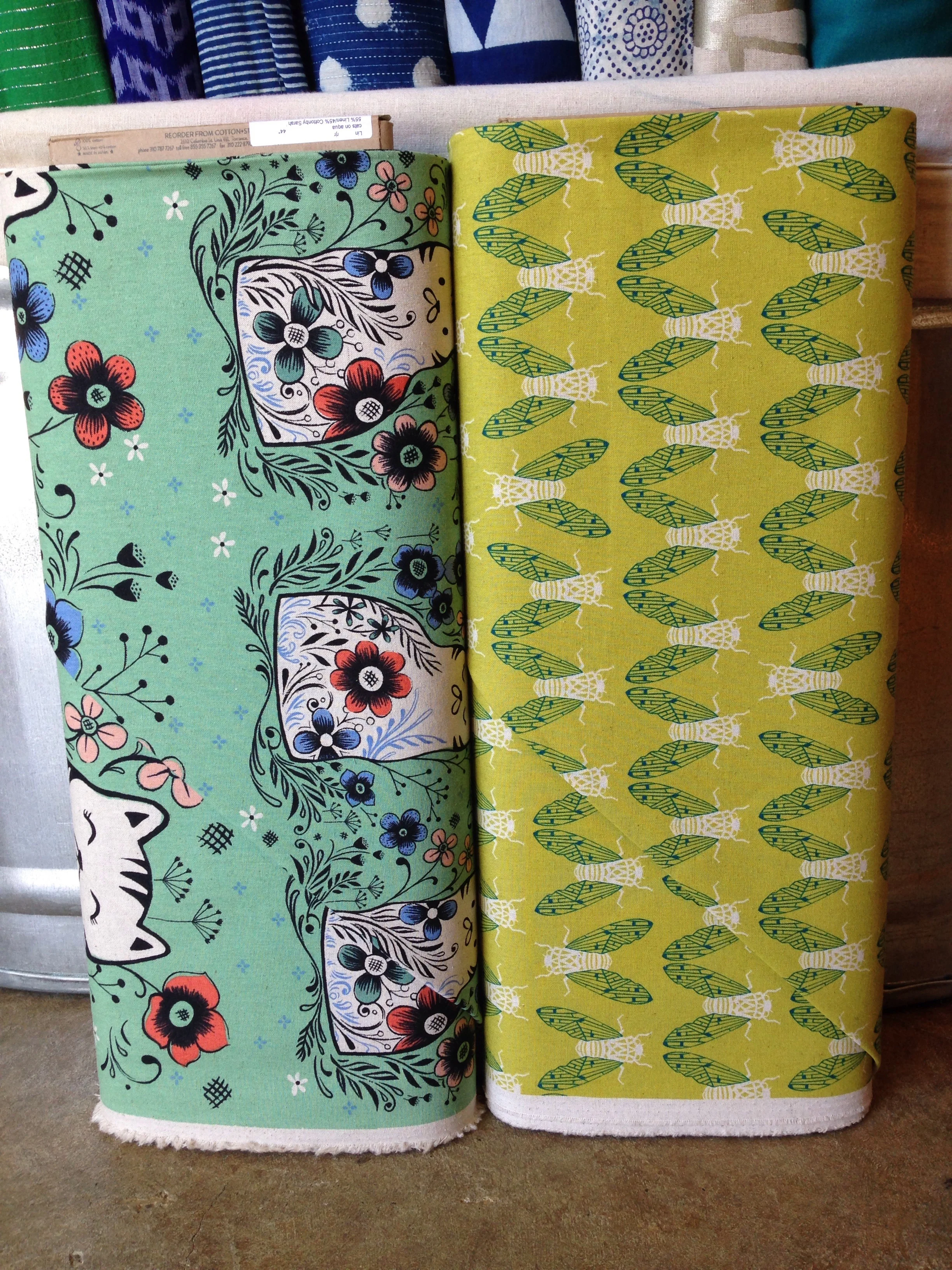 More Cotton + Steel on cotton + linen - folksy cats just waiting to be cutest apron you ever did see and some flies which would make some beautiful, perfectly creepy throw pillows.