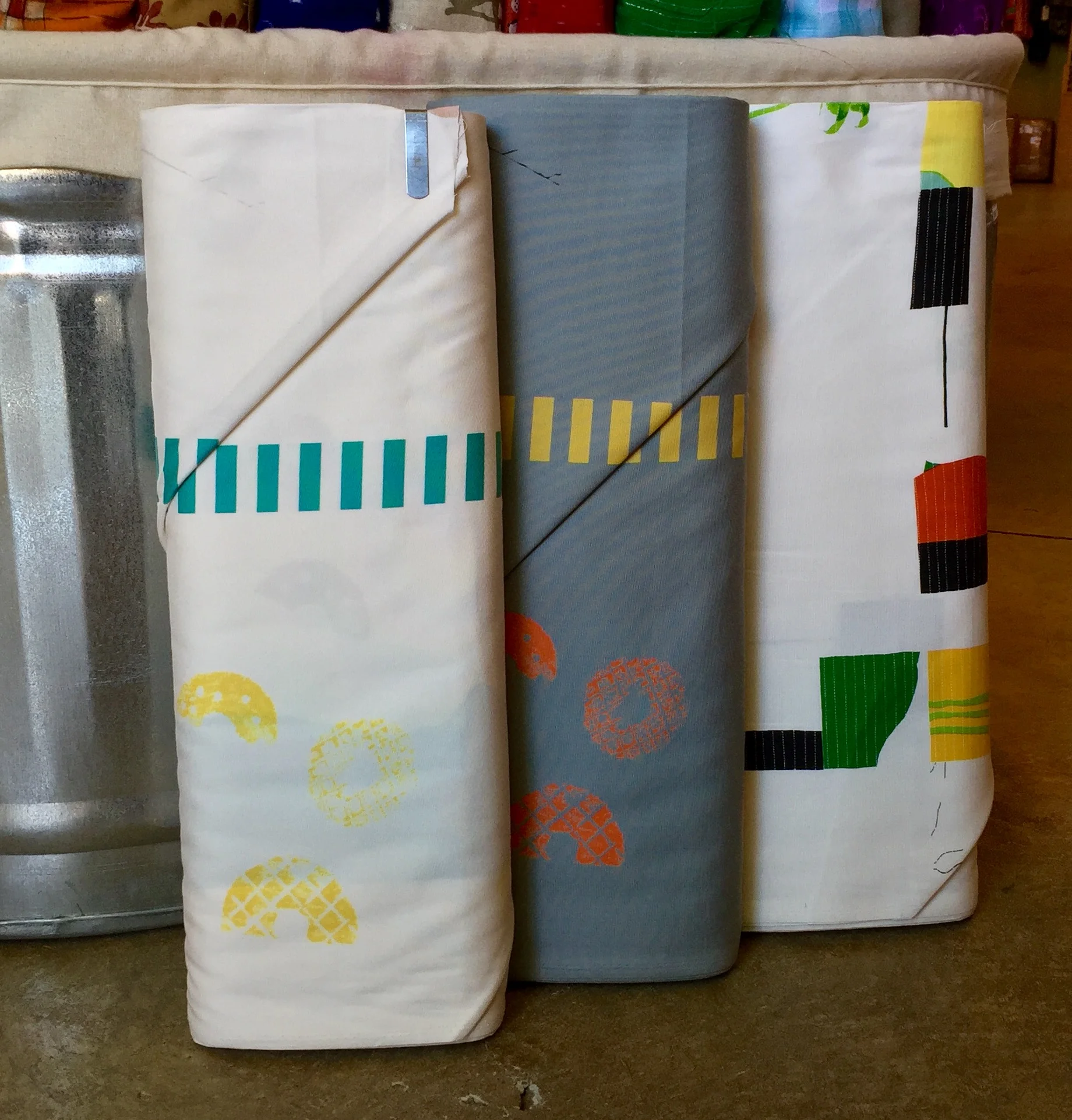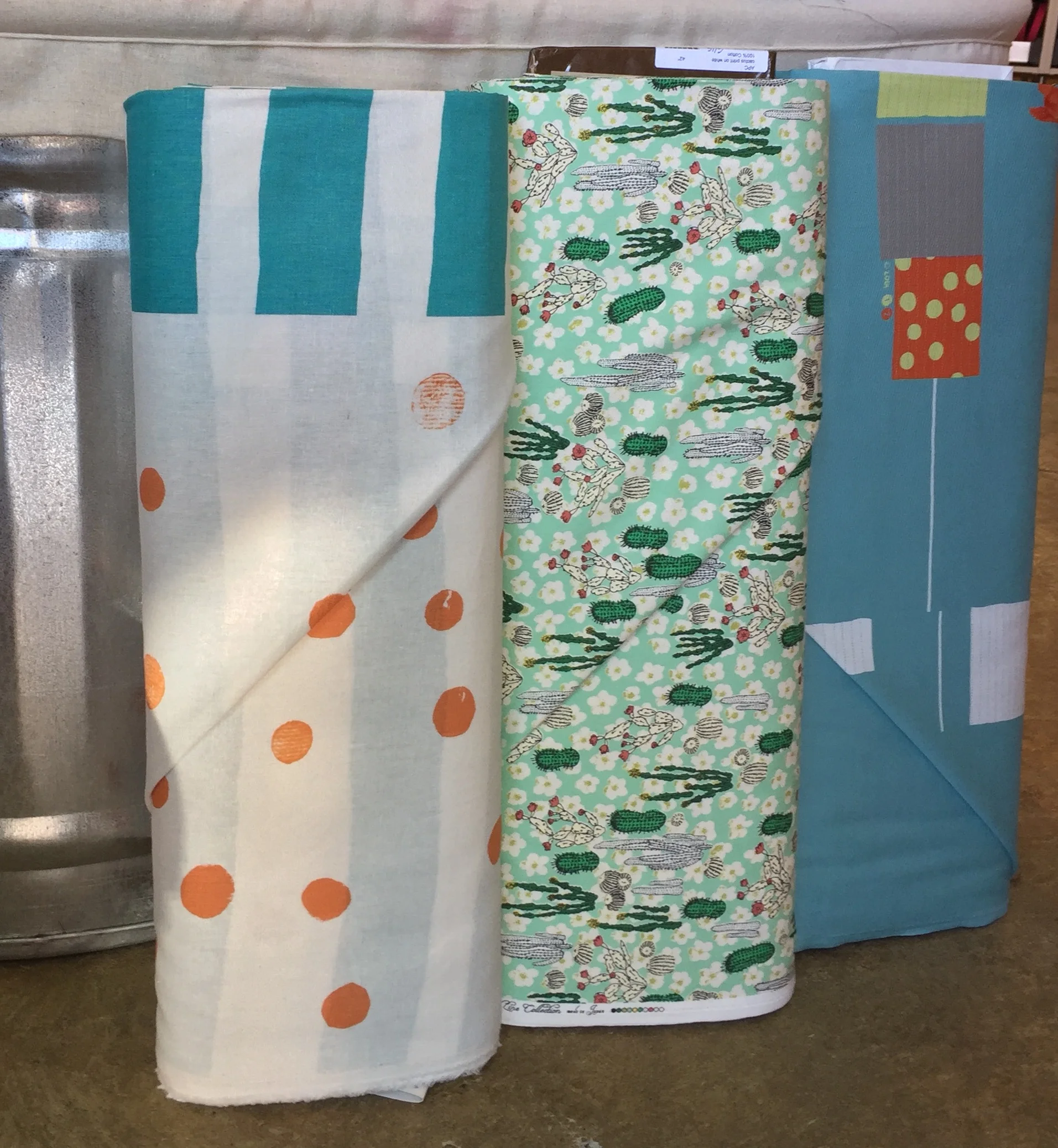 A linen border print by Yoshiko Jinzenji, a lovely cactus print in a mid-weight shirting perfect for a fun and sophisticated Negroni, and canvas also from Yoshiko Jinzenji.
