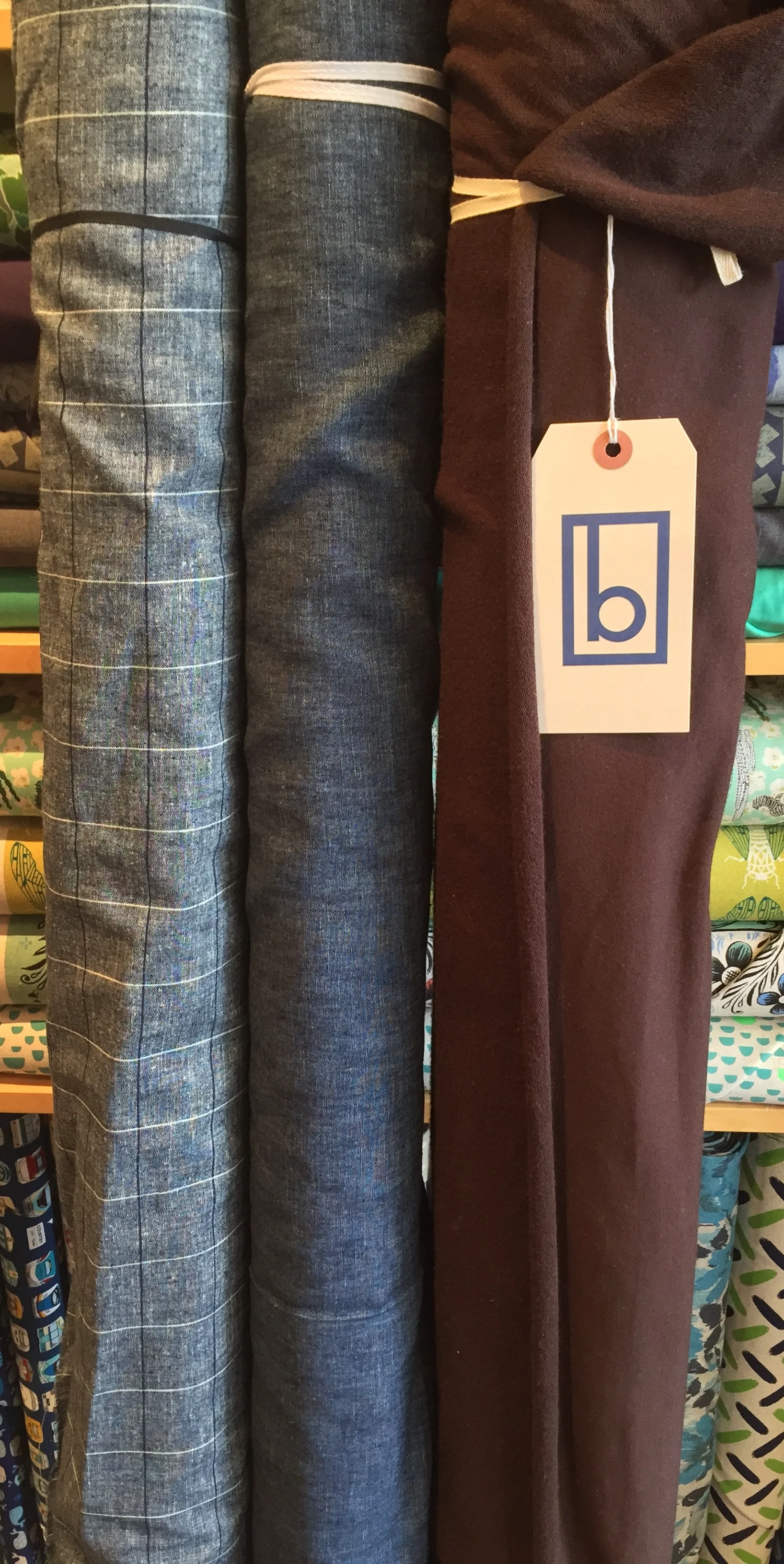 Above is a hemp/cotton blend on the right and the low-loop terry in soy/organic cotton/spandex that we all love so much, in a new, rich brown. And, apparently, I like that Kaufman Linen Indigo so much that I felt it should be featured in this photo too!