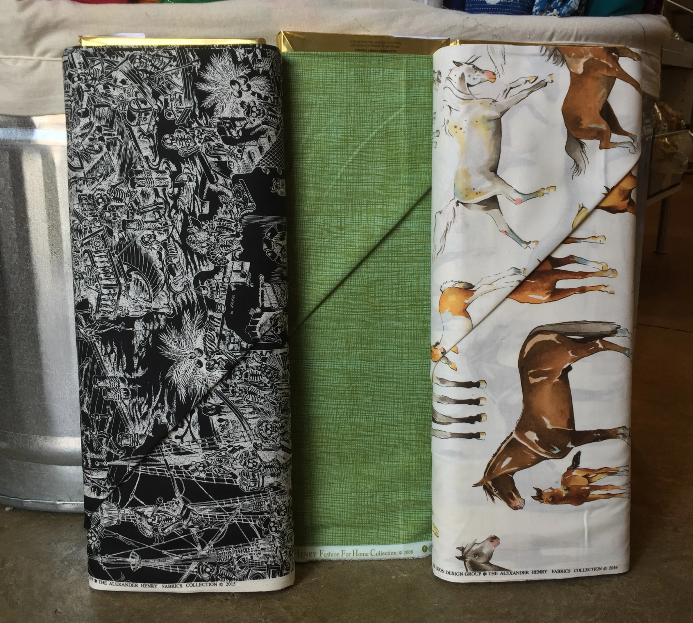 Yep, those are pink horses on cream silk chiffon on the far left. This is a lovely batch of silk, silk/cotton, and a rayon there in the middle--the black/white leaf print. The one next to it is a really fun tropical beach scene print silk.