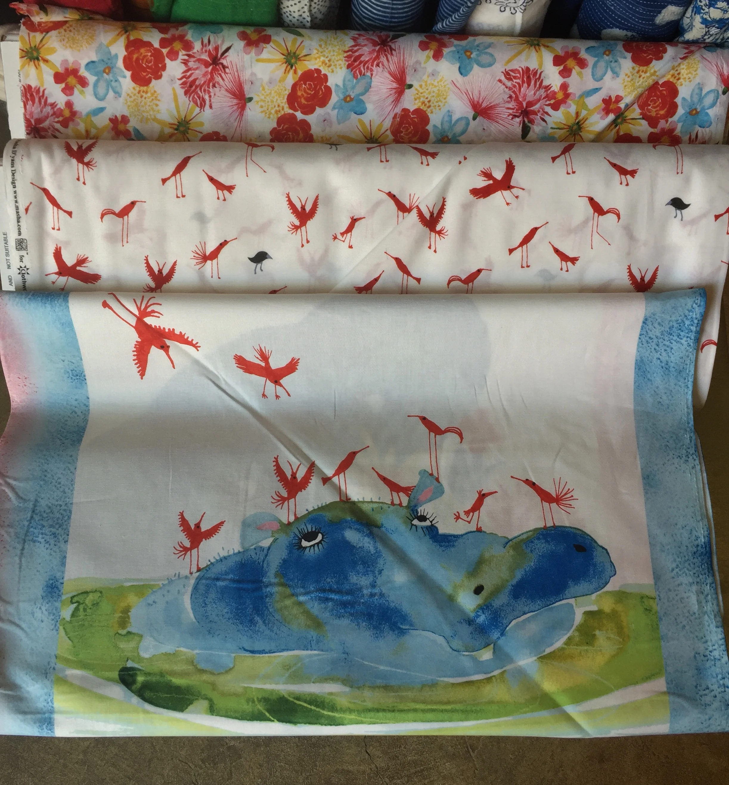 Fun and sweet cotton prints from Alexander Henry (top photo) and Clothworks (lower photo). The panel piece shown above has that adorable hippo on one side and an equally adorable elephant on the other side. Cute. If you look closely, you'll see those are skeletal pirates in the black/white print.