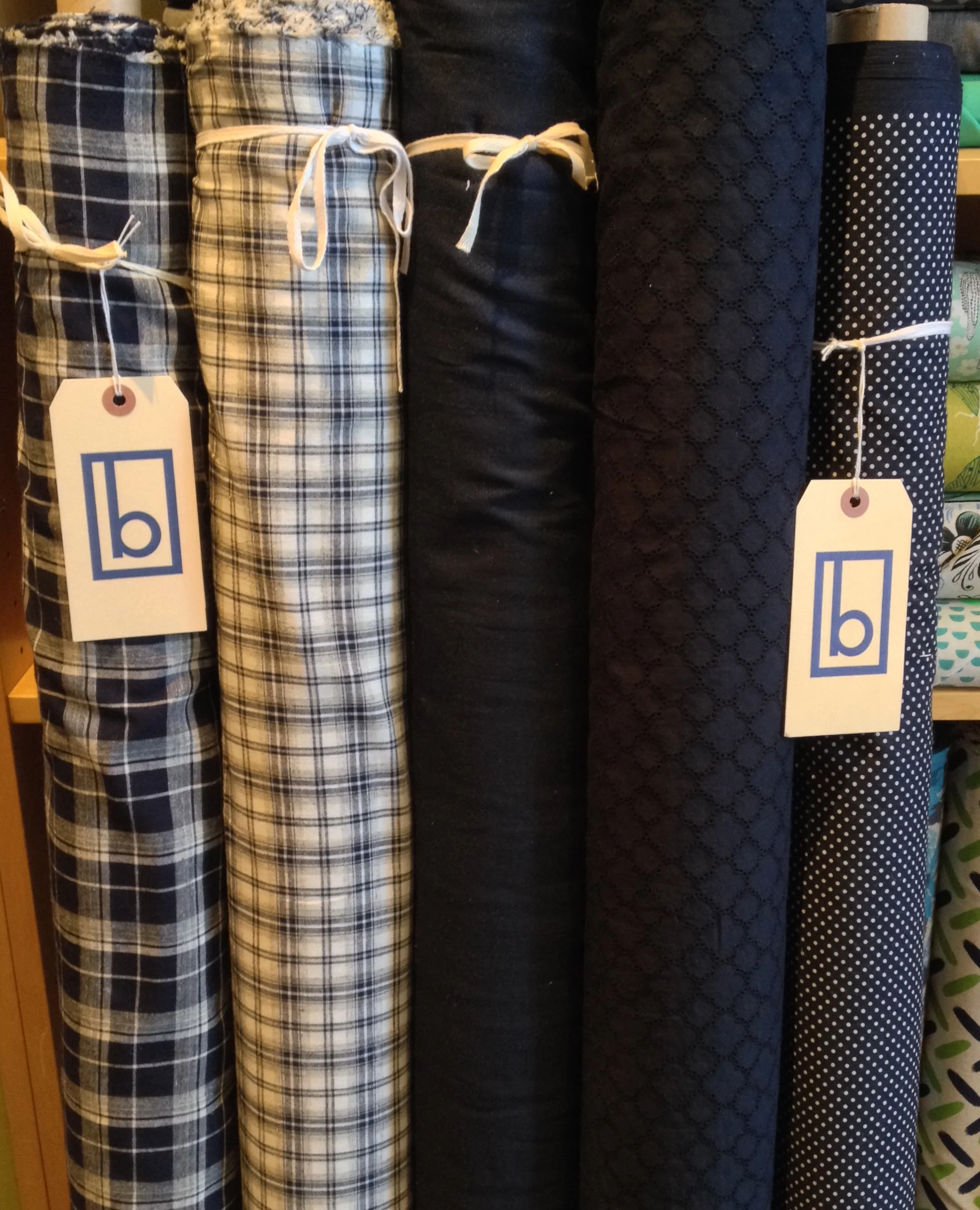 A whole lot of navy cotton. There's an eyelet, an embroidered stripe, a polka dot and some fabulous plaids.