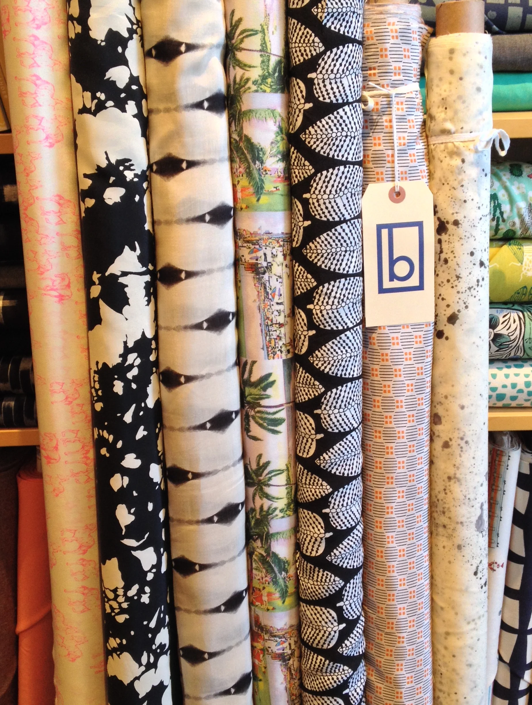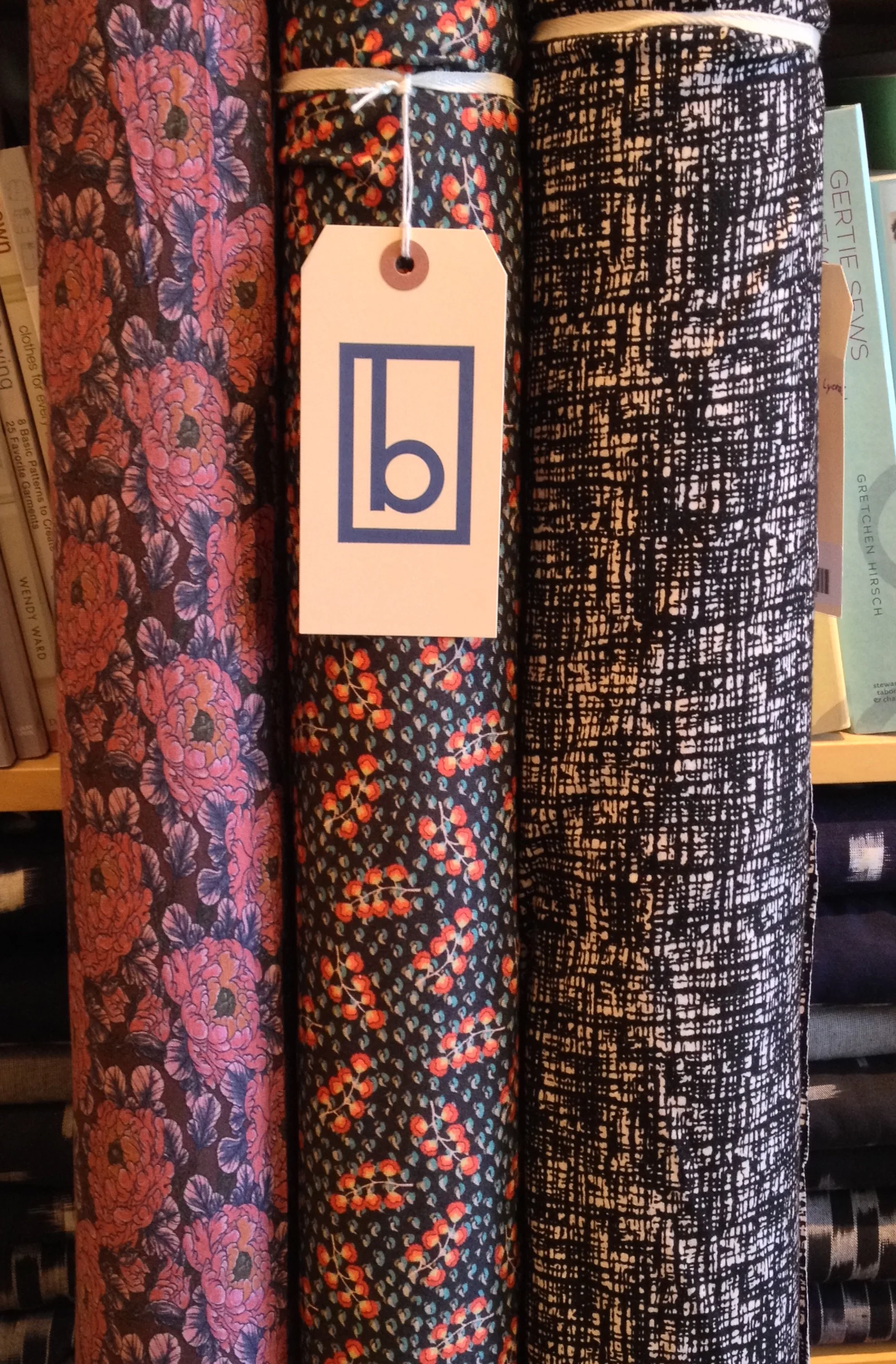 Two new Liberty of London knits on the left and a modern black/cream rayon knit. Perfect for the wrap dress you'd wear all day into the night.
