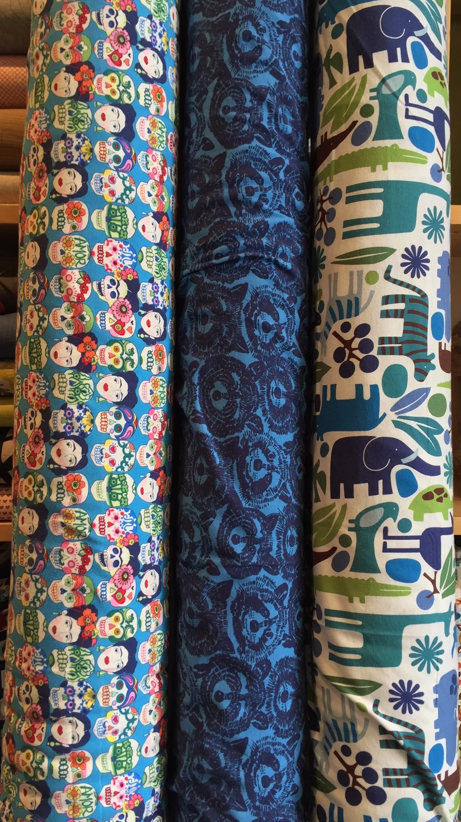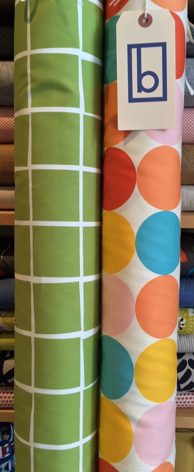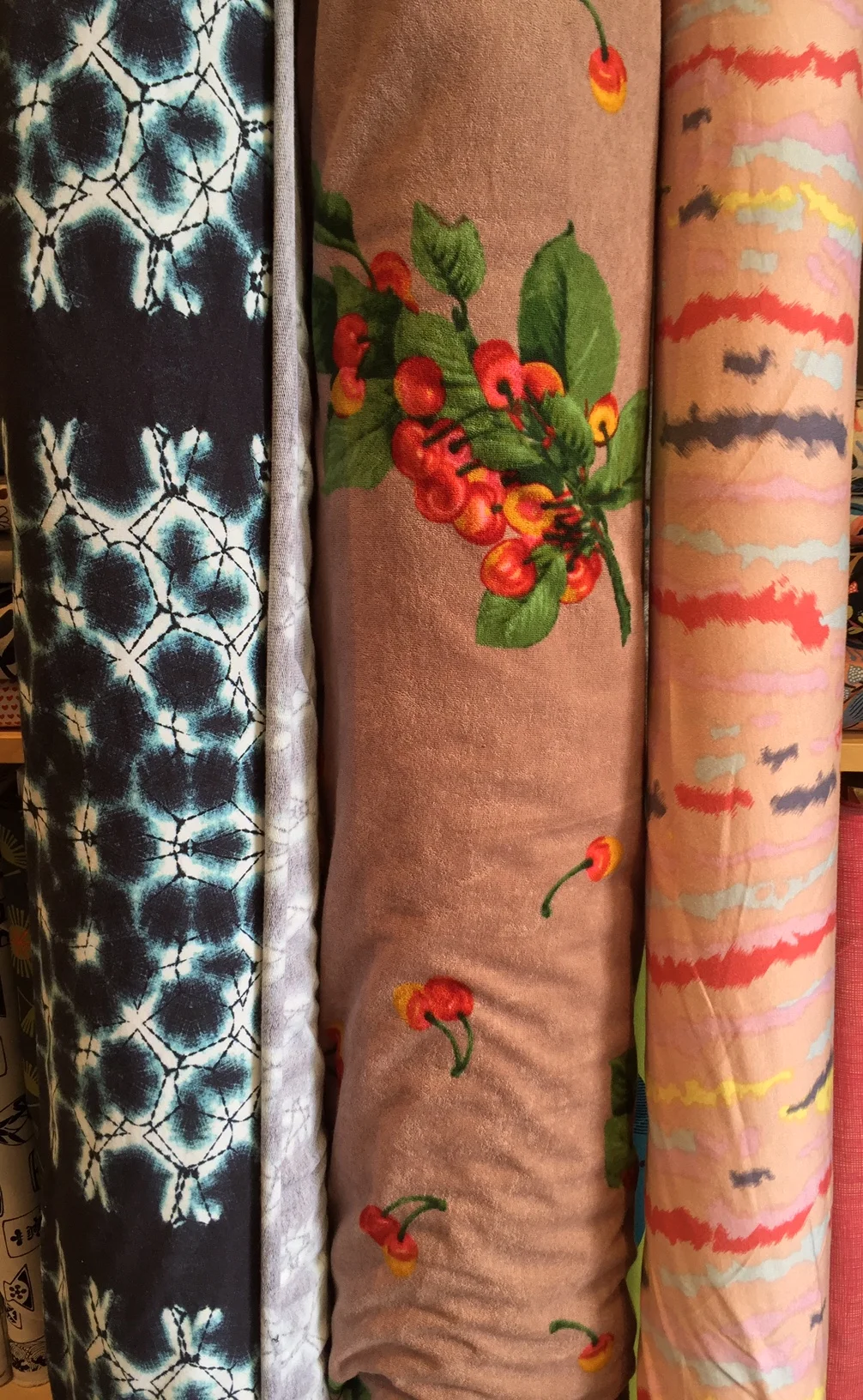 Some really fun knits have arrived, including these two terry pieces on the left. Alexander Henry has started to manufacture prints. We've started with the three below. Super soft, supple cotton-y and wide. All pluses in my book.