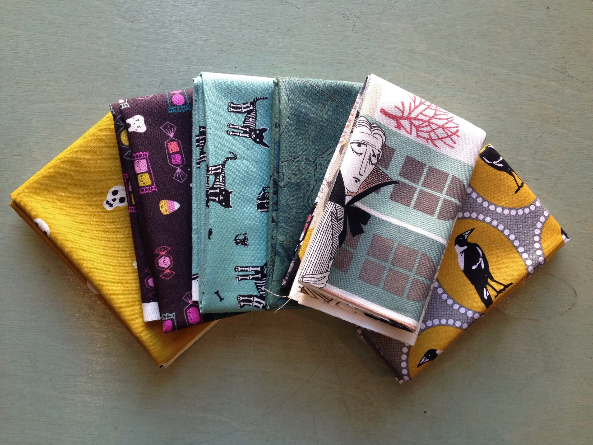 These colors work so nicely together. They would make some seriously adorable spooky bunting. A couple fat quarters and some webbing would make a dead simple trick-or-treat bag. Many of these are still available on the bolt if you or someone you know needs some Halloween themed clothing - imagine that bat print as a funky fit-and-flare dress or the crow as a dapper Negroni.