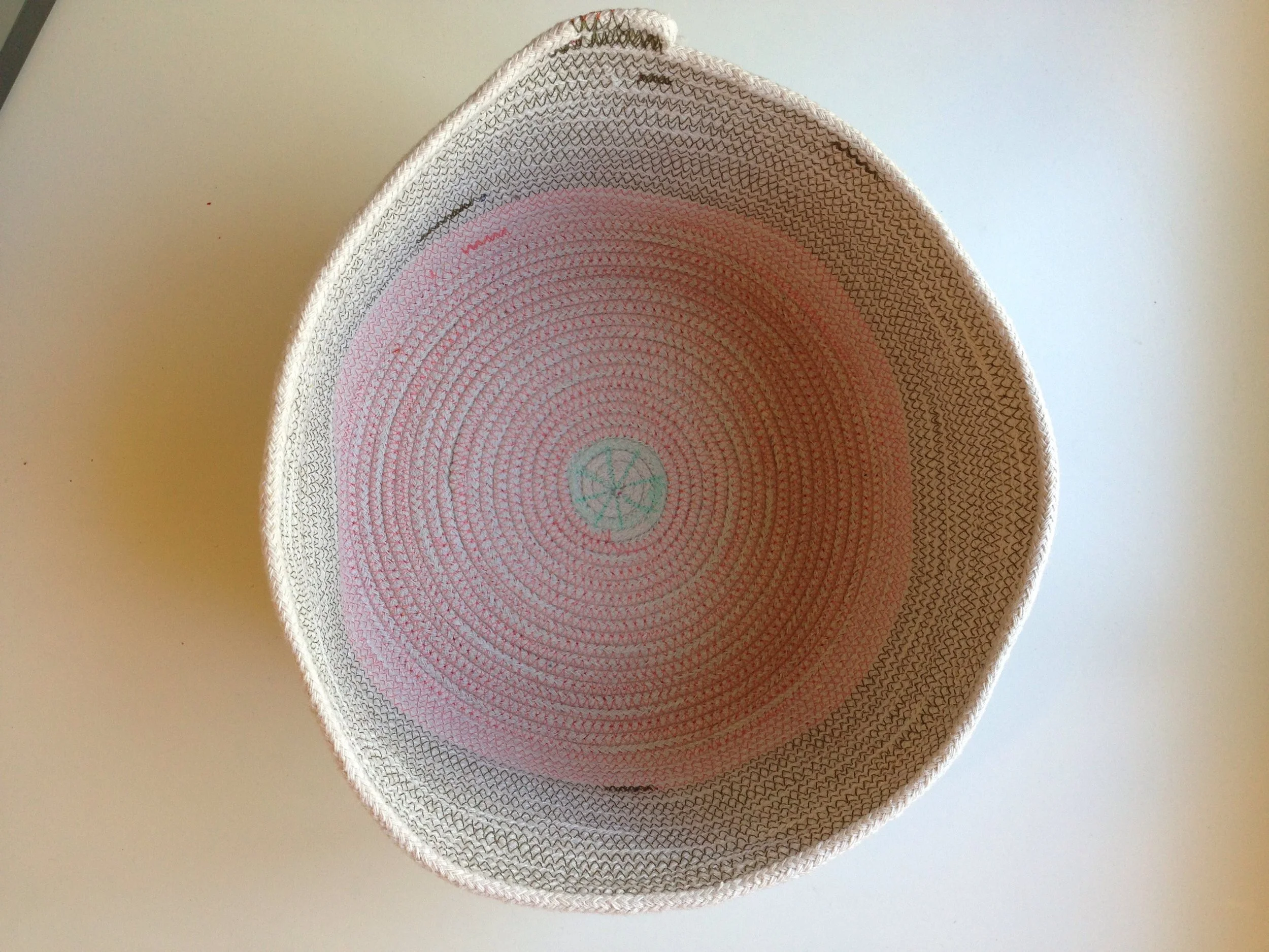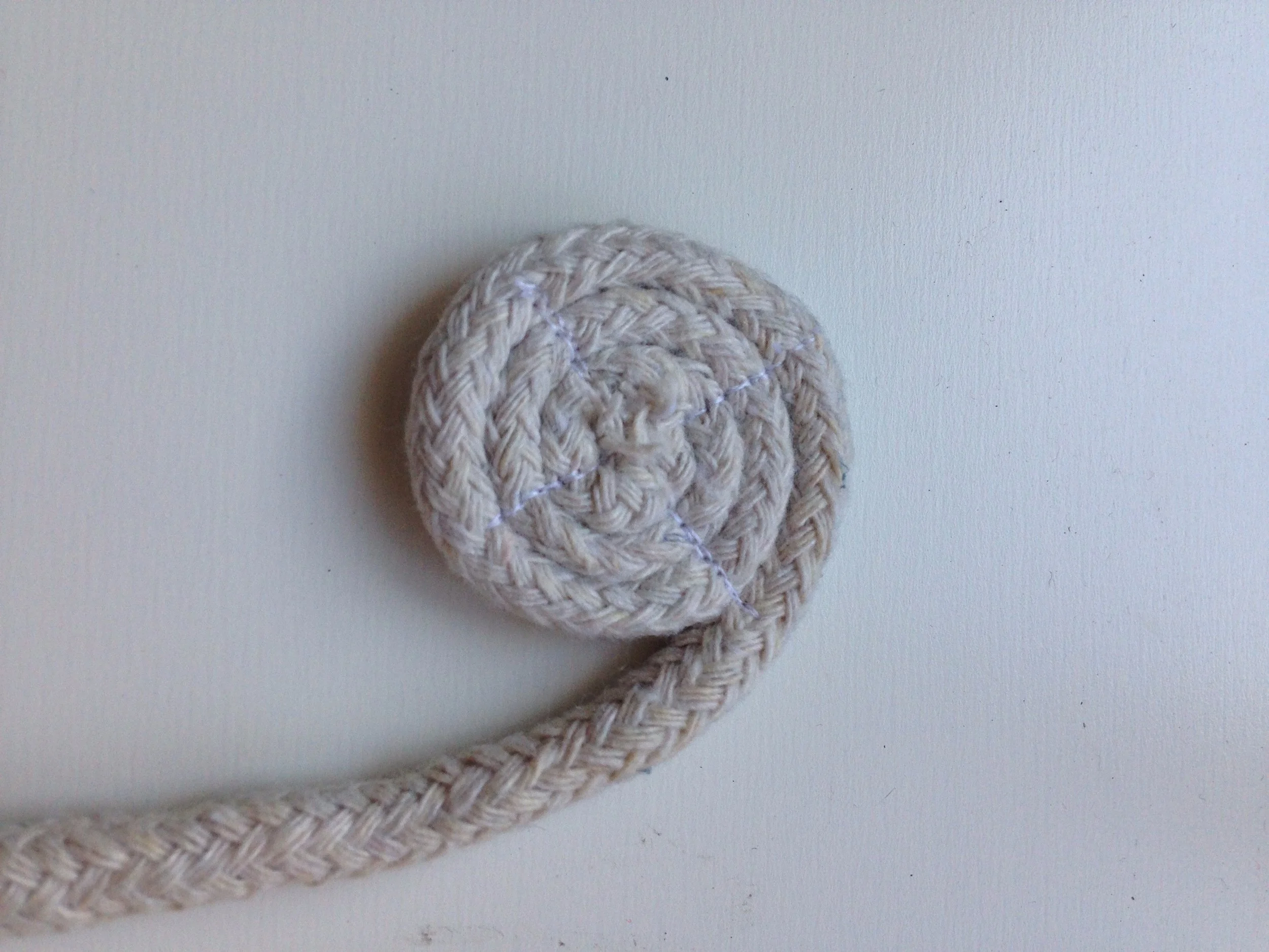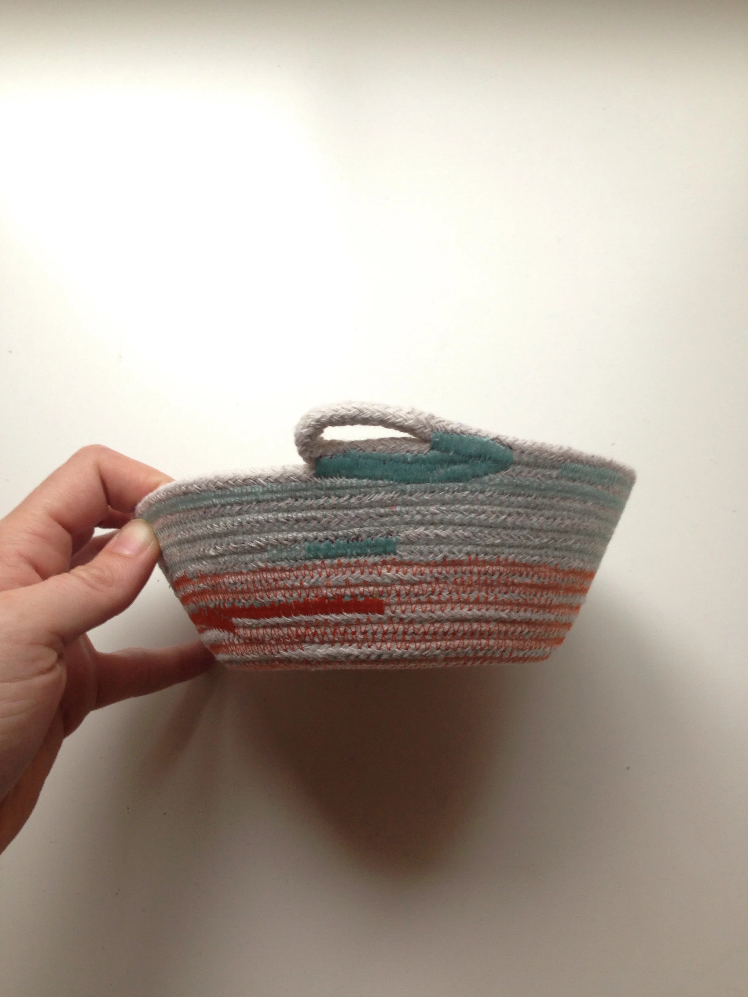 When your coil is big enough, tilt the base of the bowl up (see above) to start building the walls of the bowl. Keep stitching until you like the looks of your bowl. To finish, cut your rope, leaving yourself at least 4". I like to fold the end in on itself, toward the rope bowl so it's sandwiched between the previous coil and the top coil, creating a small loop. Making your stitch length even narrower, I go back and forth over the end to hide loose rope threads and secure the loop in place.