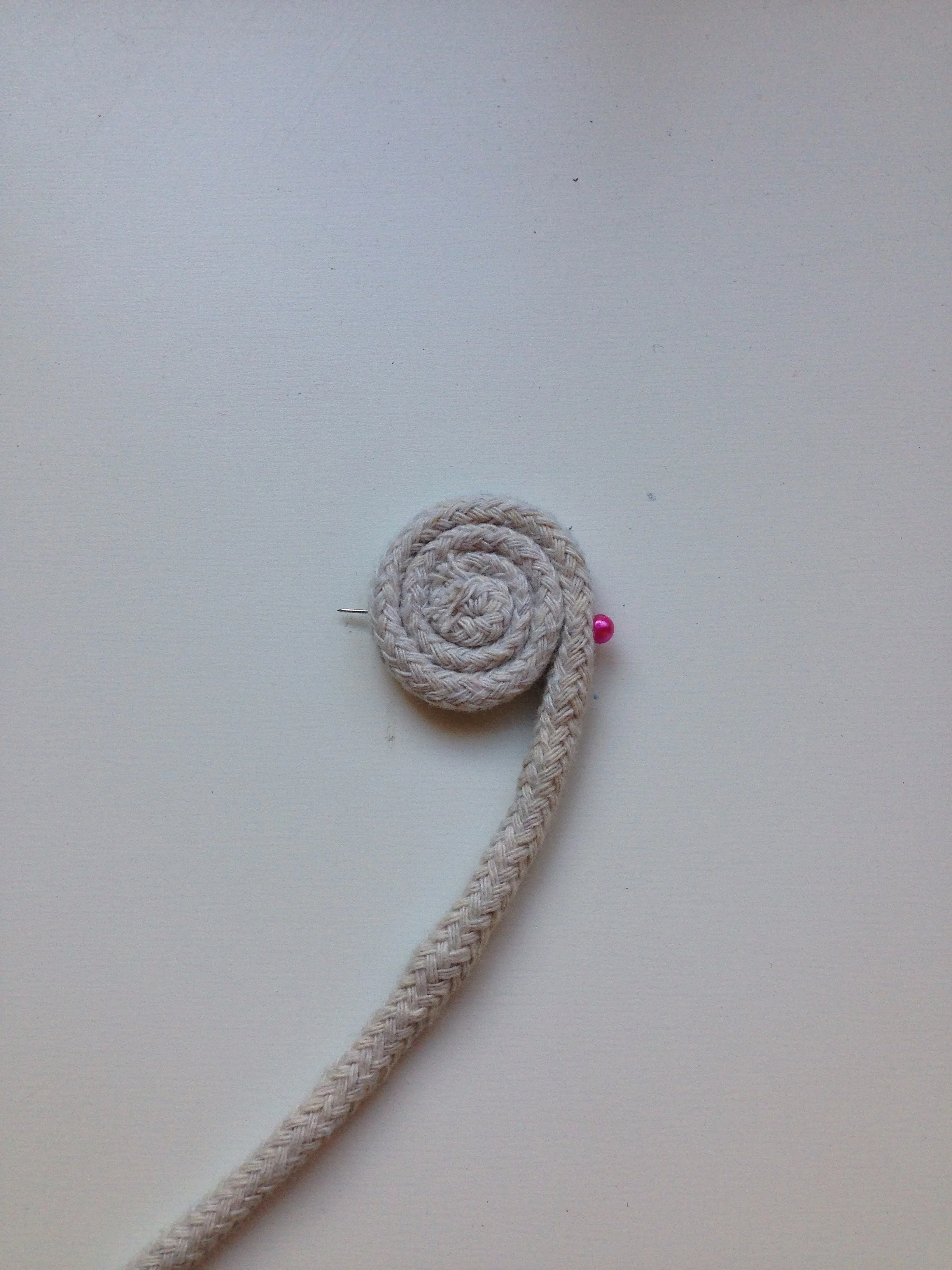 Start by making a small coil 1"-1.5" in diameter. I stick a pin straight through it to keep it together until I get some stitches in it.