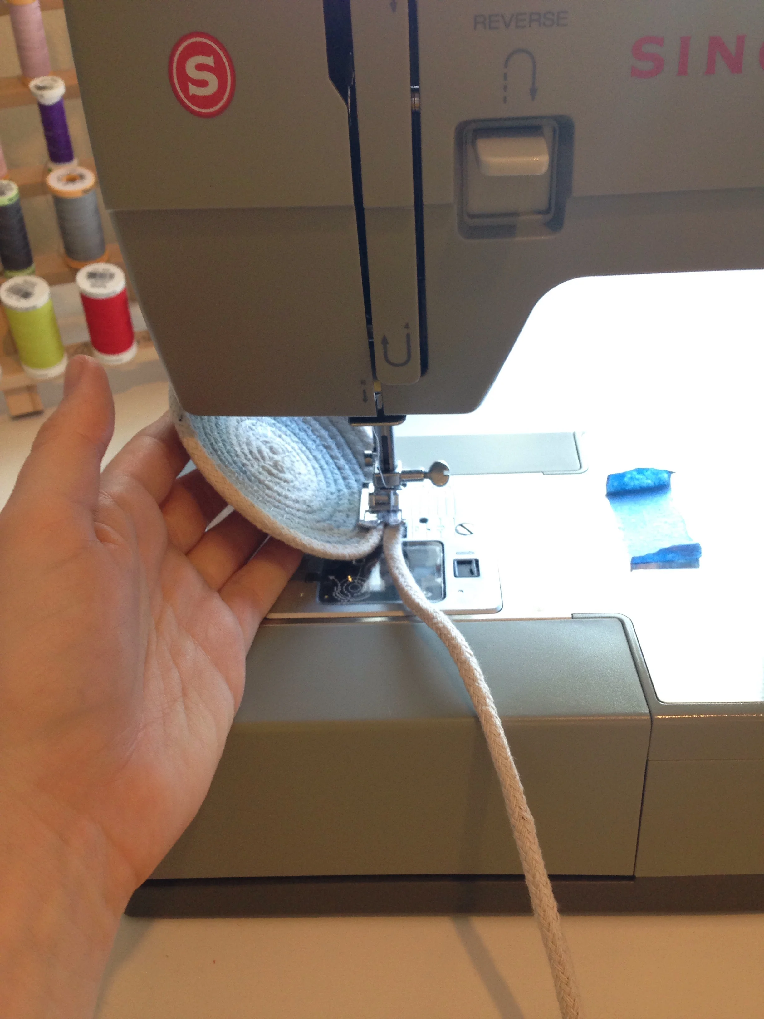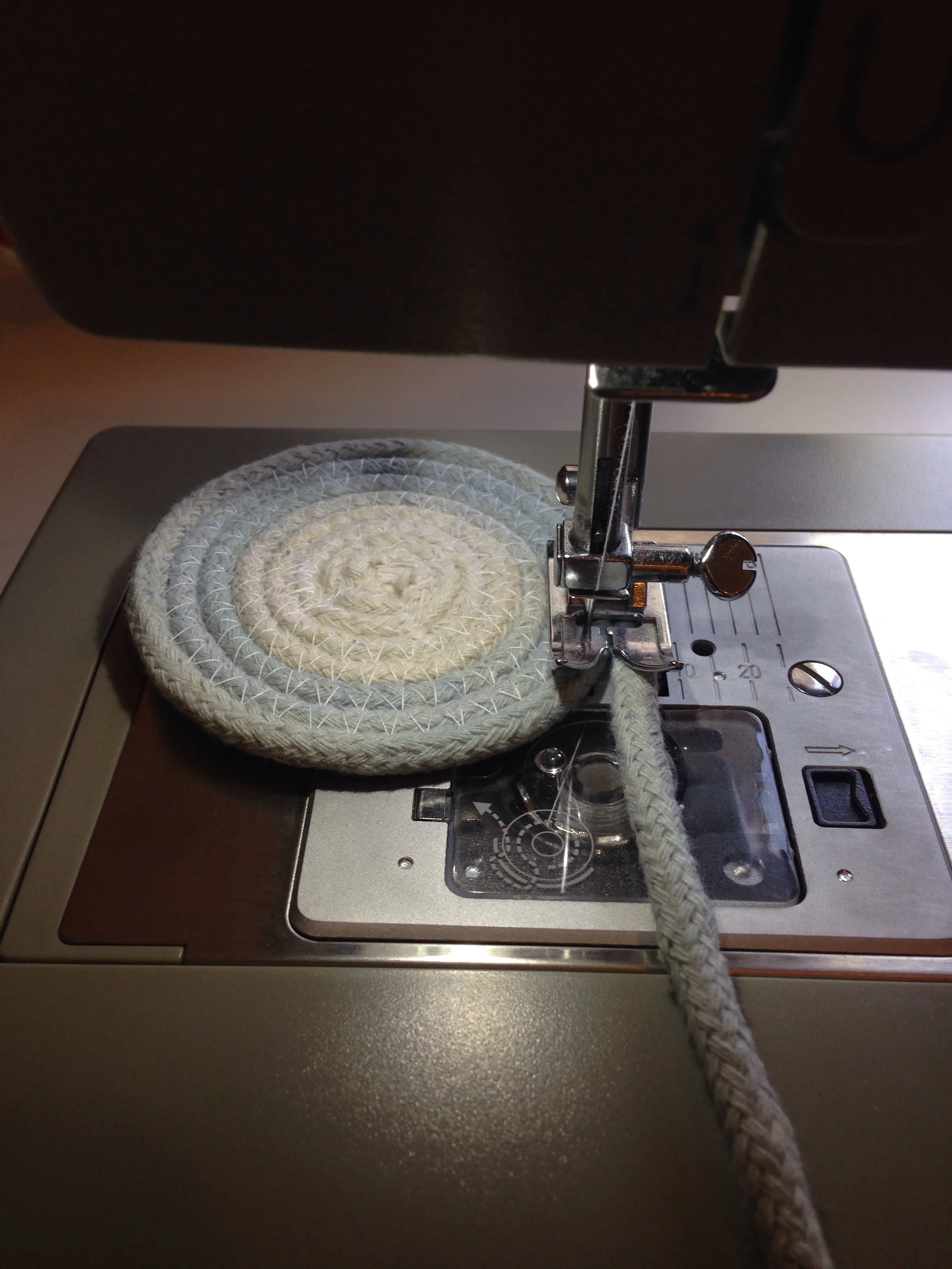 Place the coil under your presser foot so that you'll be winding counter-clockwise, with the tail on the right side of the bowl. Set your machine to zigzag. I use the widest zigzag stitch with medium stitch length (shorter than what you see in these photos is better - oops!). Line up the gap between the coil and the tail under the center of the presser foot. Stitch slowly as you build up your coil. The bigger your bowl gets the more you can let it rip and put the pedal to the metal.