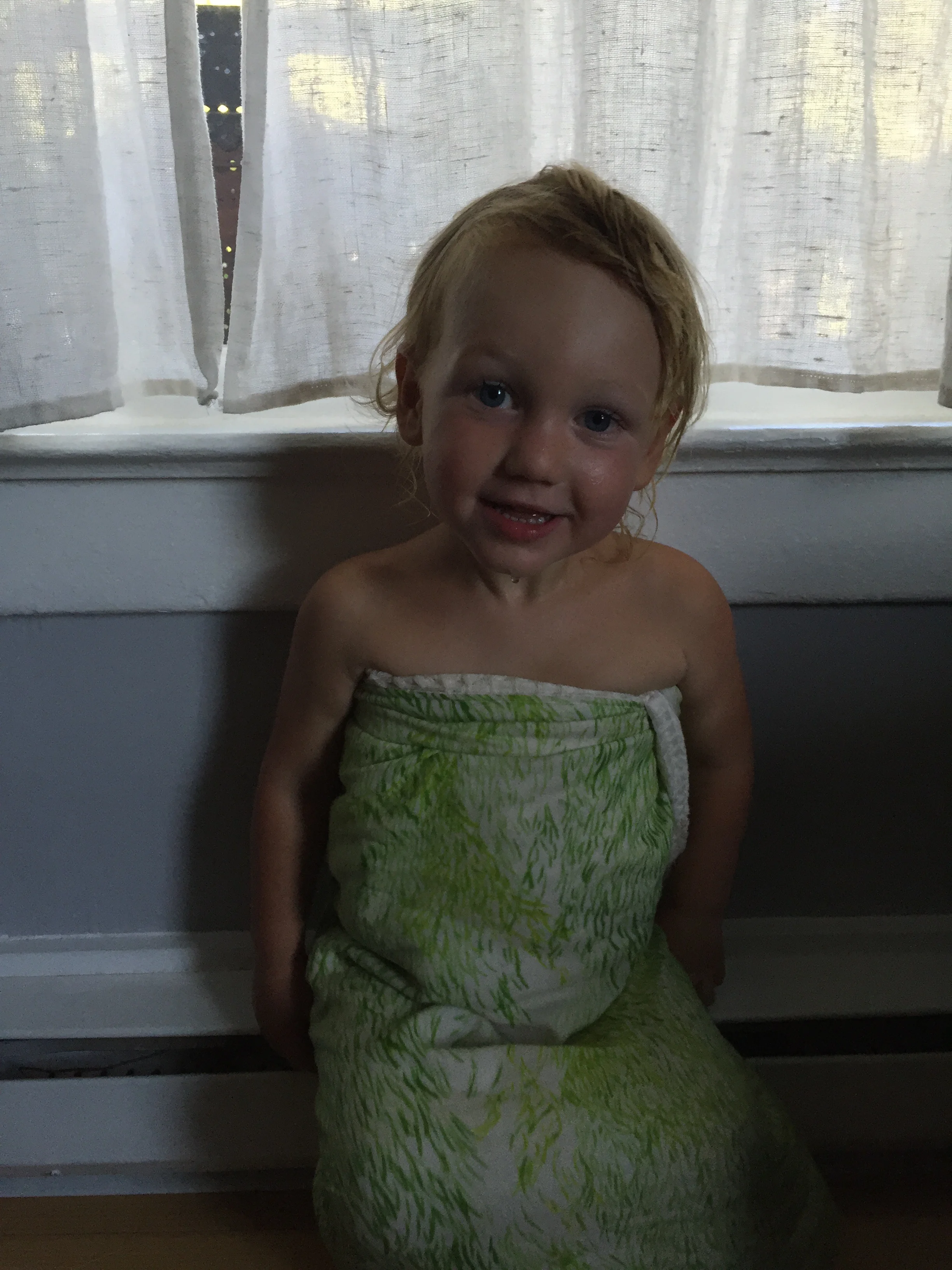 The towel is all cotton, very absorbent and dries quickly. My son gets very upset if I try to give him any other towel. Success!