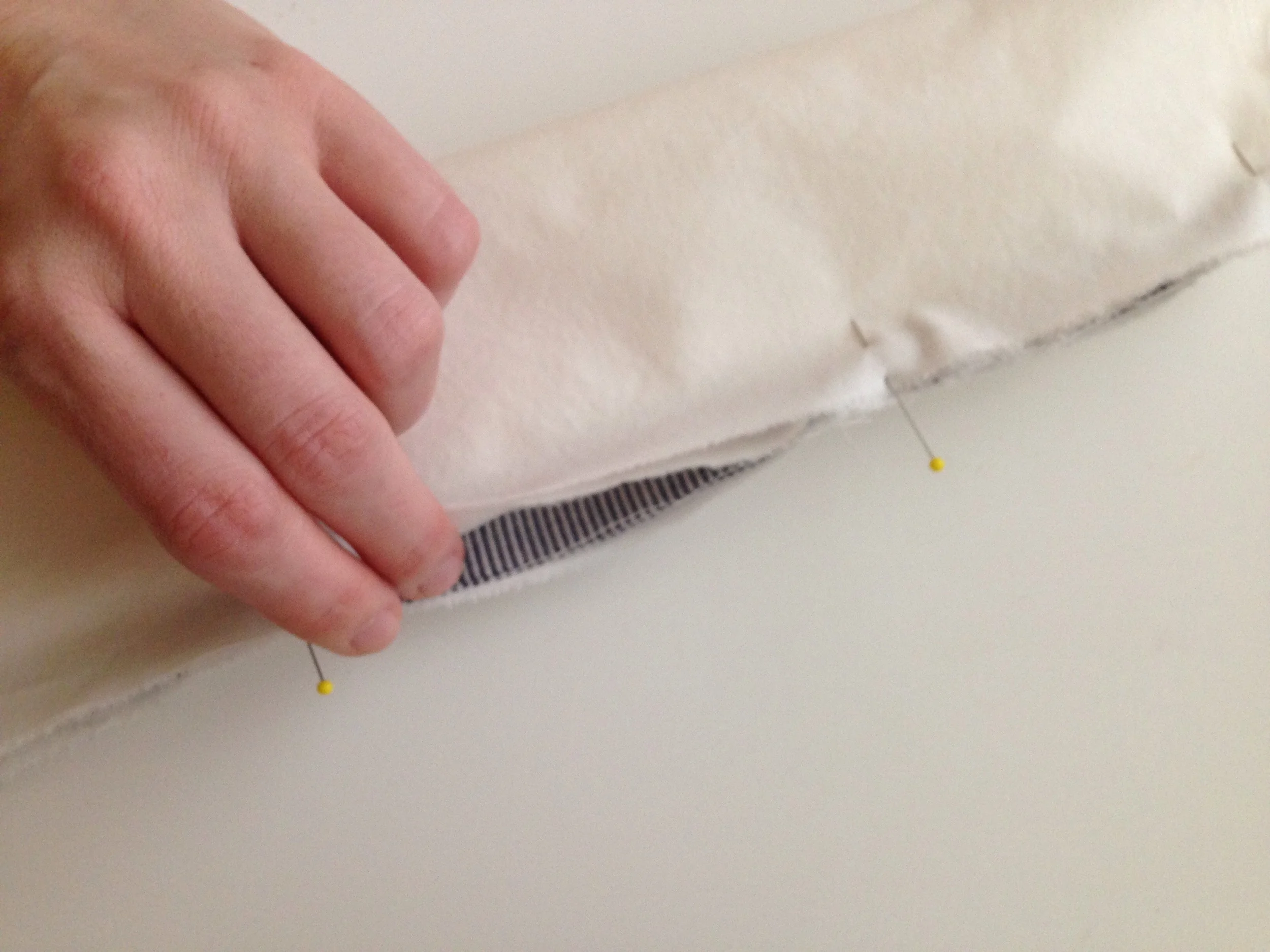 As you layer your pieces, you'll place the trim on the hem piece, raw edges aligned, and then place the larger case piece on top. Follow Heather's steps to roll everything up into a burrito for stitching. I used plenty of pins and stitched slowly to make sure I wasn't missing any of my layers.