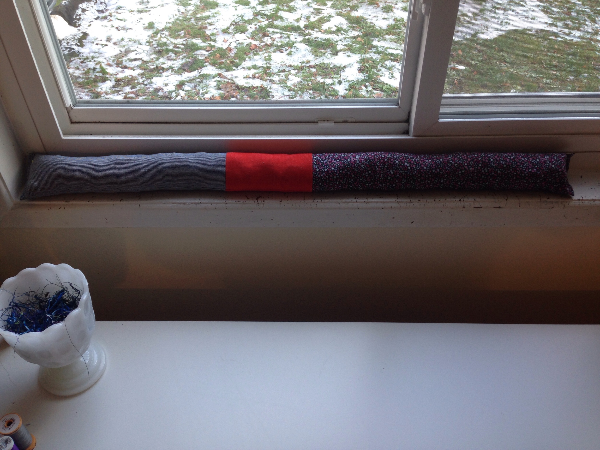 I've been working hard to find ways to use the copious scraps my sewing is generating. The bags and bags I've been filling with little bits of this shirt and that quilt have taken over my sewing area, and I still have a hard time throwing them away. Someone suggested making draft dodgers, which is the perfect project for using up scraps because you can piece the outside using larger scraps and stuff smaller scraps inside.