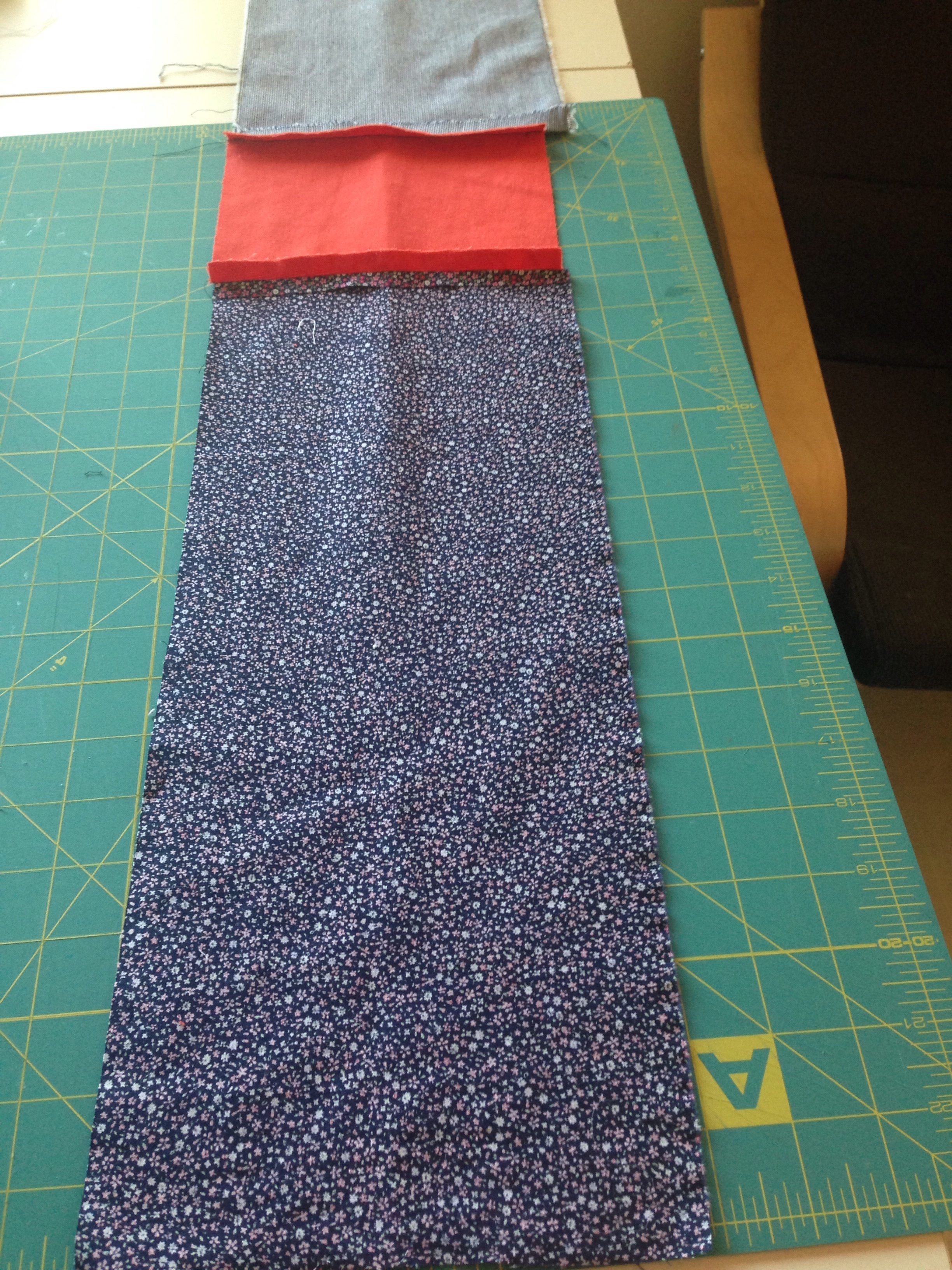 You'll start by measuring your doorway. I made my draft dodger a little longer than the doorway for a tight fit, and added several inches on either side to turn inside and hem. I cut my fabric pieces to be 7" wide, but in the future I'll make them much wider - maybe 10"-12" - to make a more substantial dodger that's easier to stuff with scraps.