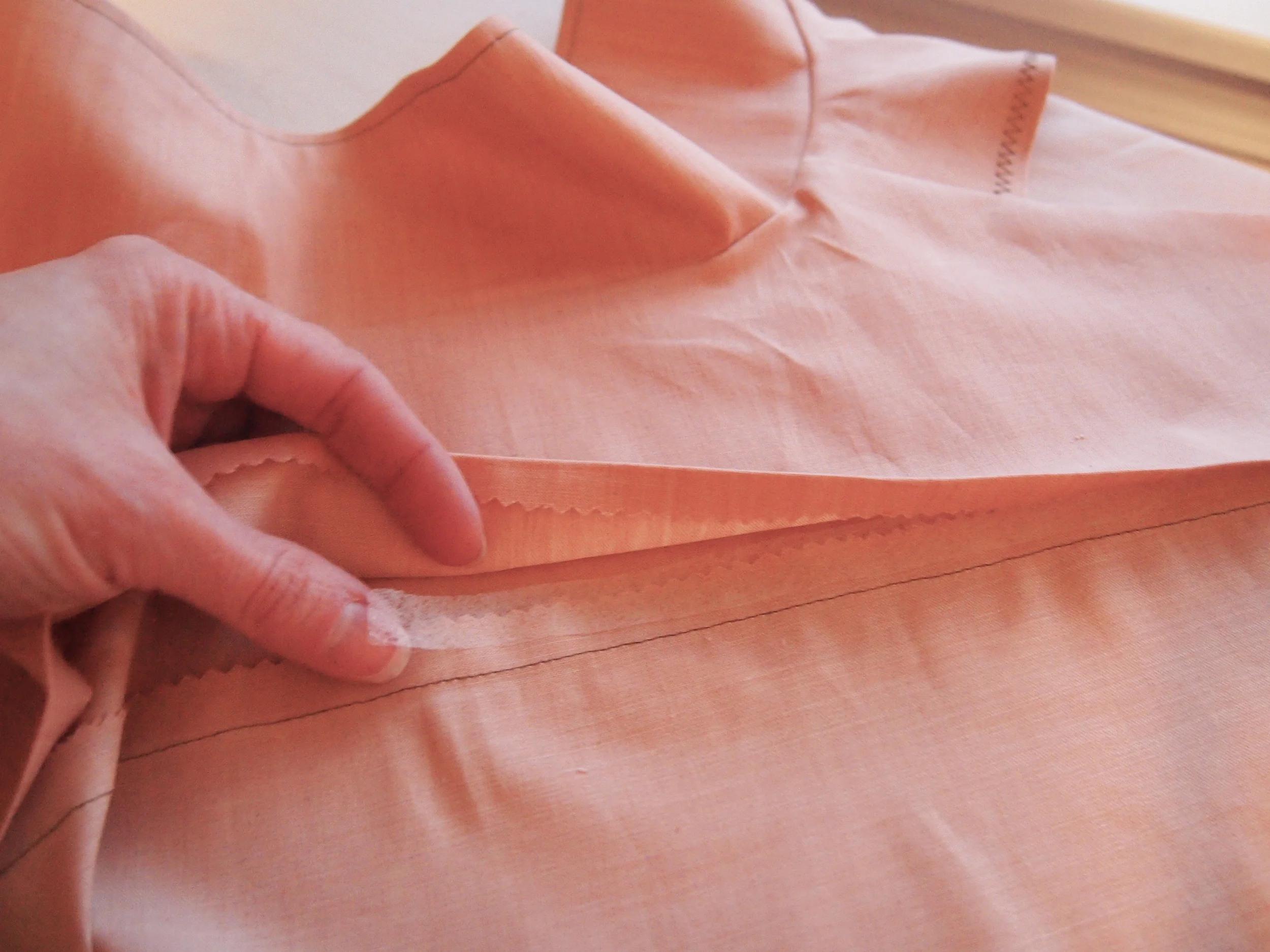 There is a step that says to ‘organize the yoke’ and after you ‘organize’ the yoke, the instructions say to tack or baste so you can then topstitch it to the back of the shirt. I used strips of Stitch Witchery (an iron-on web tape whose most common application is in no-sew hemming) instead, for better time efficiency. Its a good product to have on hand for things like this.