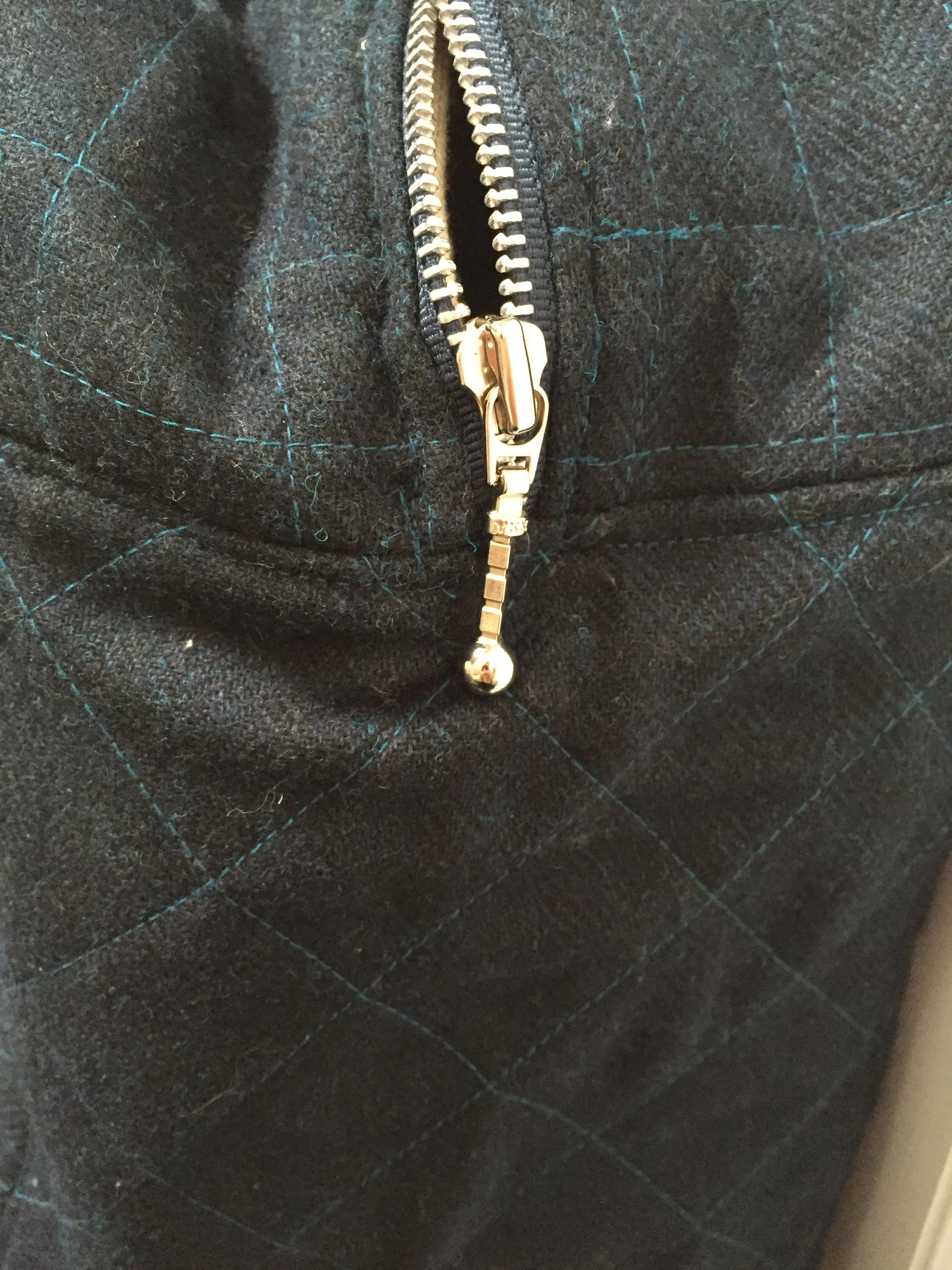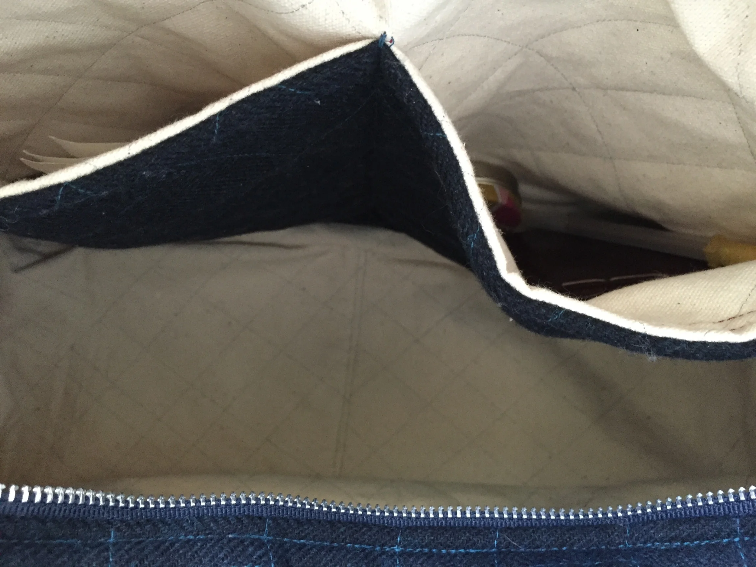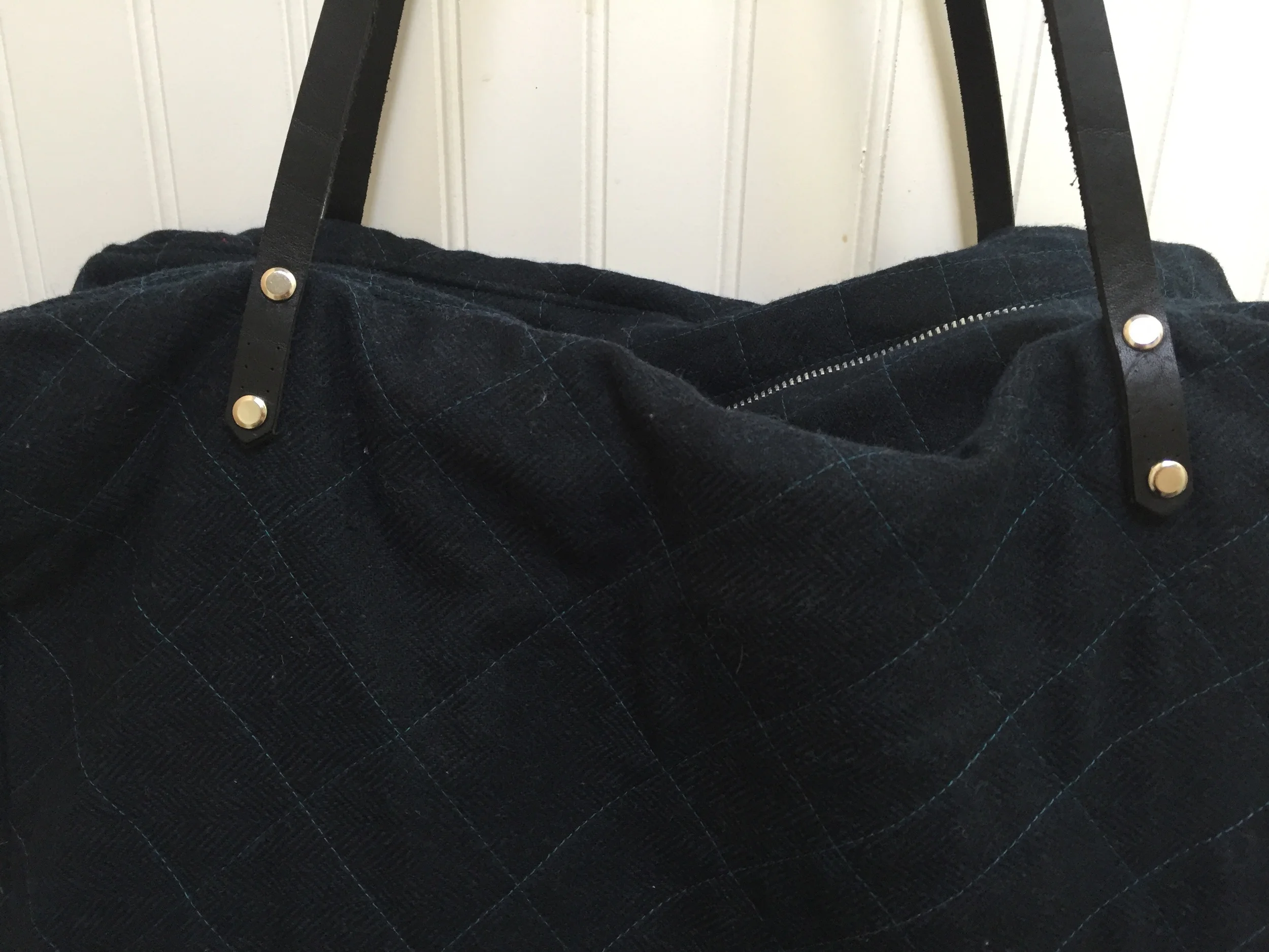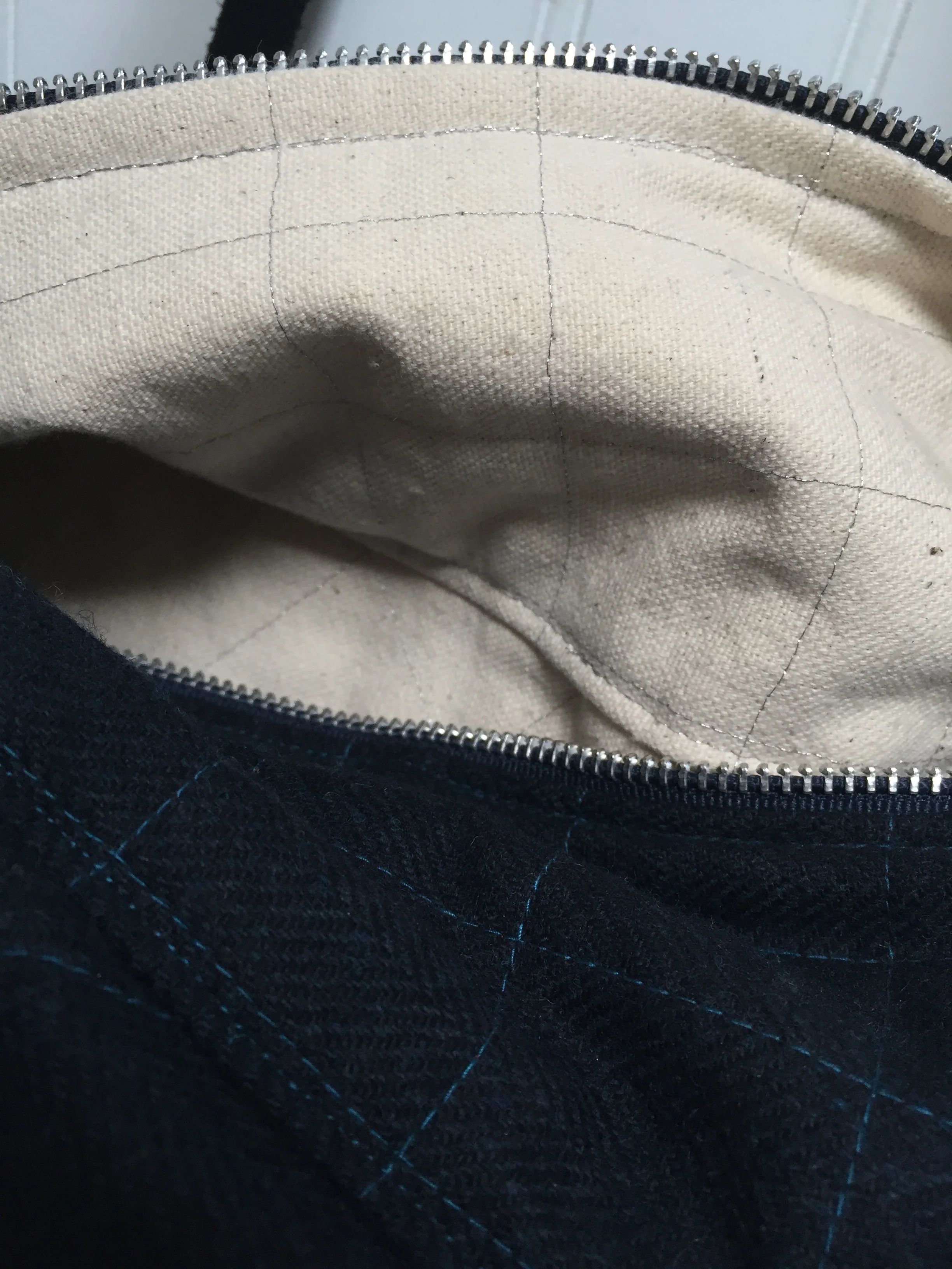 I got this beautiful indigo wool at the shop years ago and have been holding onto it for just the right thing. I chose a natural duck canvas for the lining and quilted it with metallic silver thread. Oh yes I did! Black Doe leather handles and a sturdy metal zip finished this perfectly.