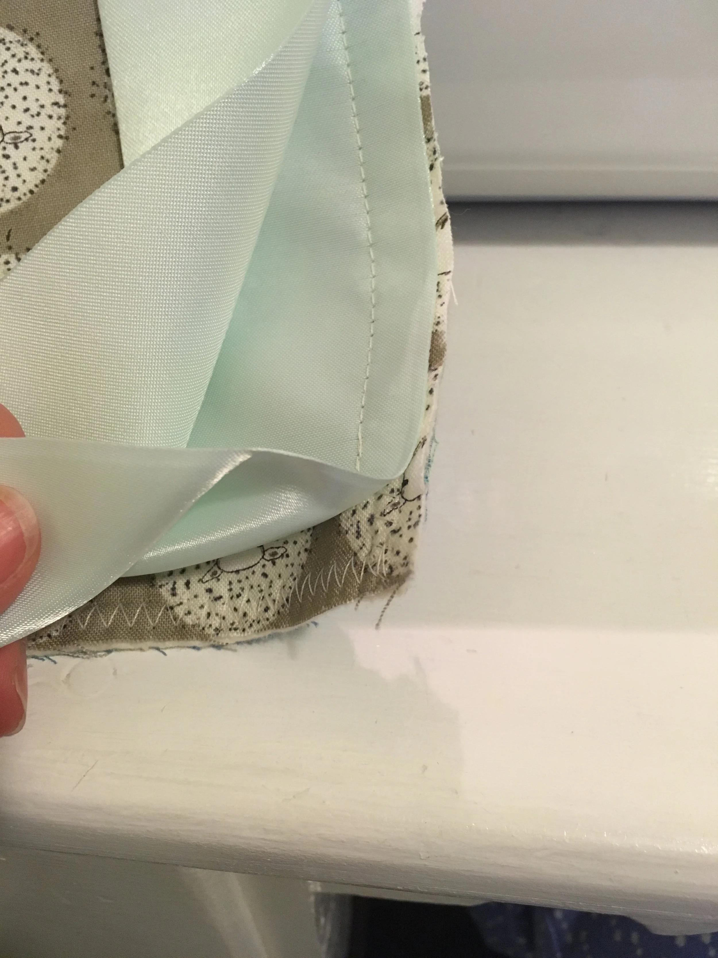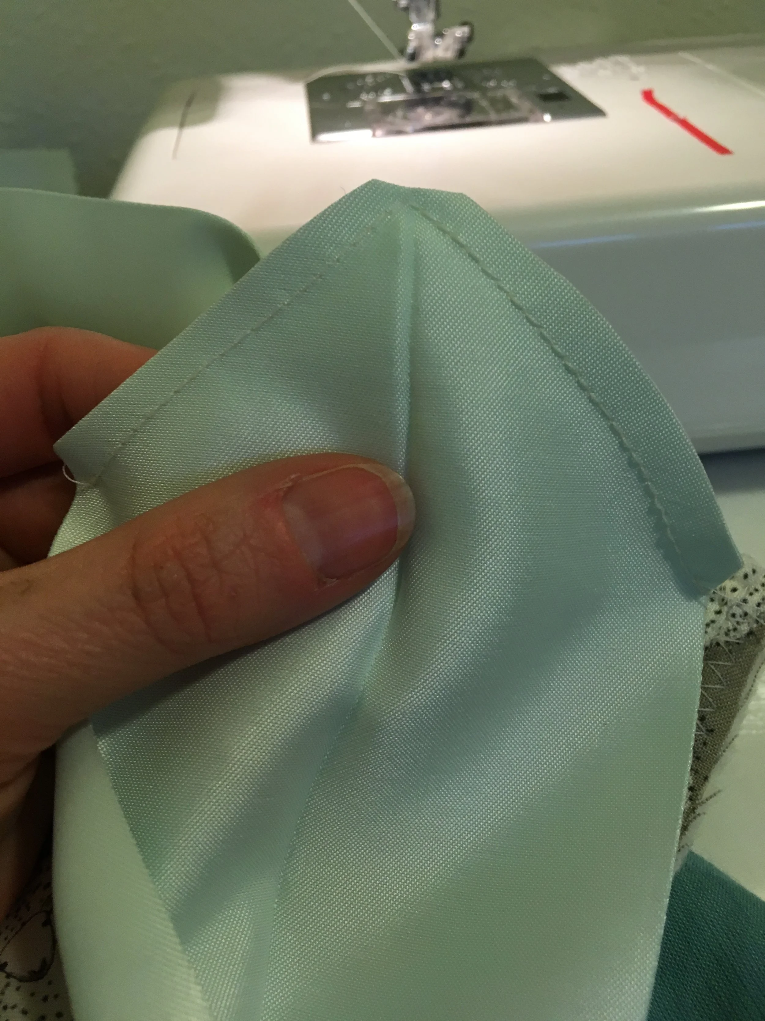 Trim, turn this point out and then pivot the binding and continue to stitch along the next edge, corner and so on. If you are struggling with this, thats ok, just be patient. It took me a while to get the hang of working with this slippery and heavy binding but the beautiful end result is worth the struggle.