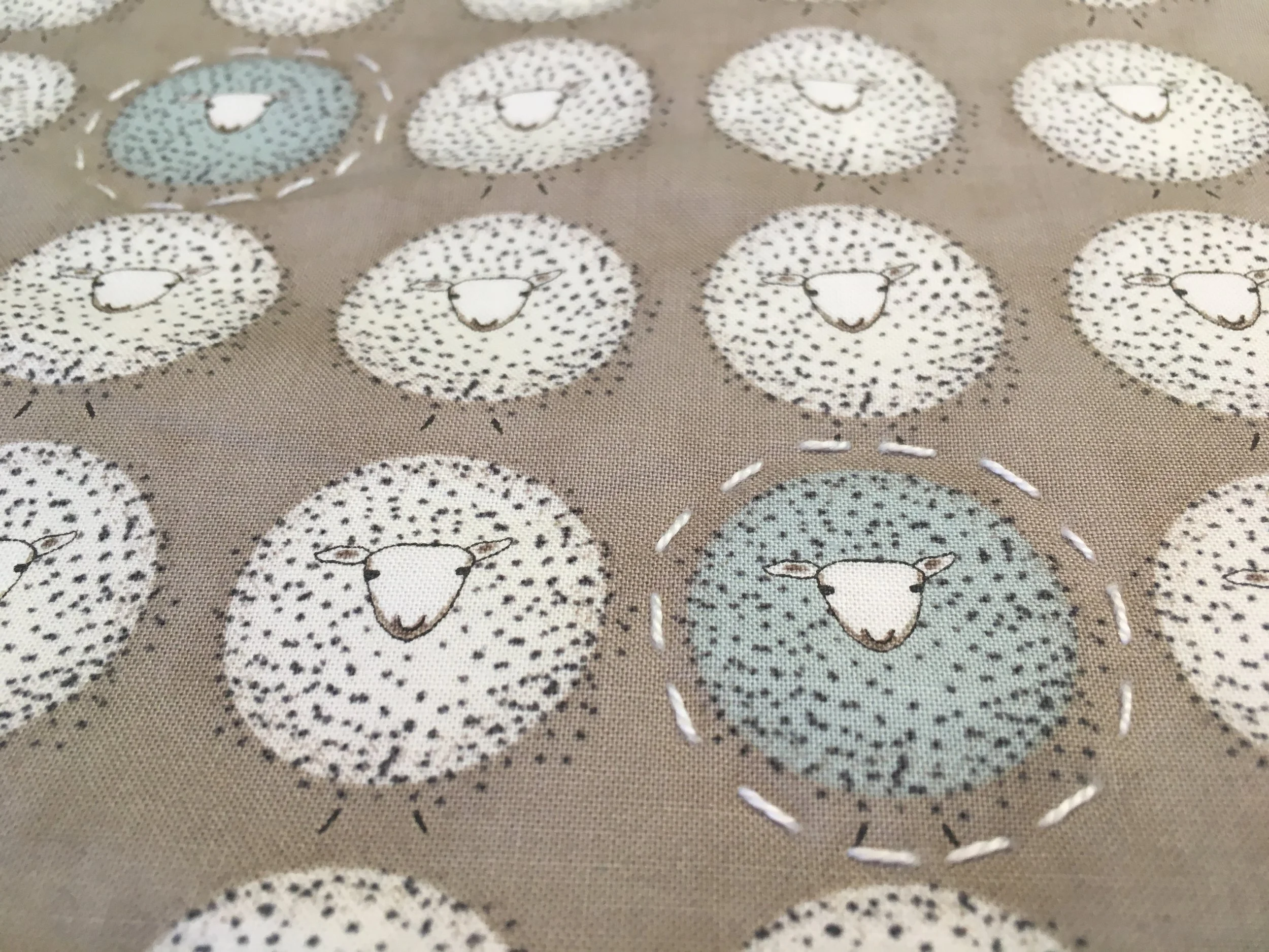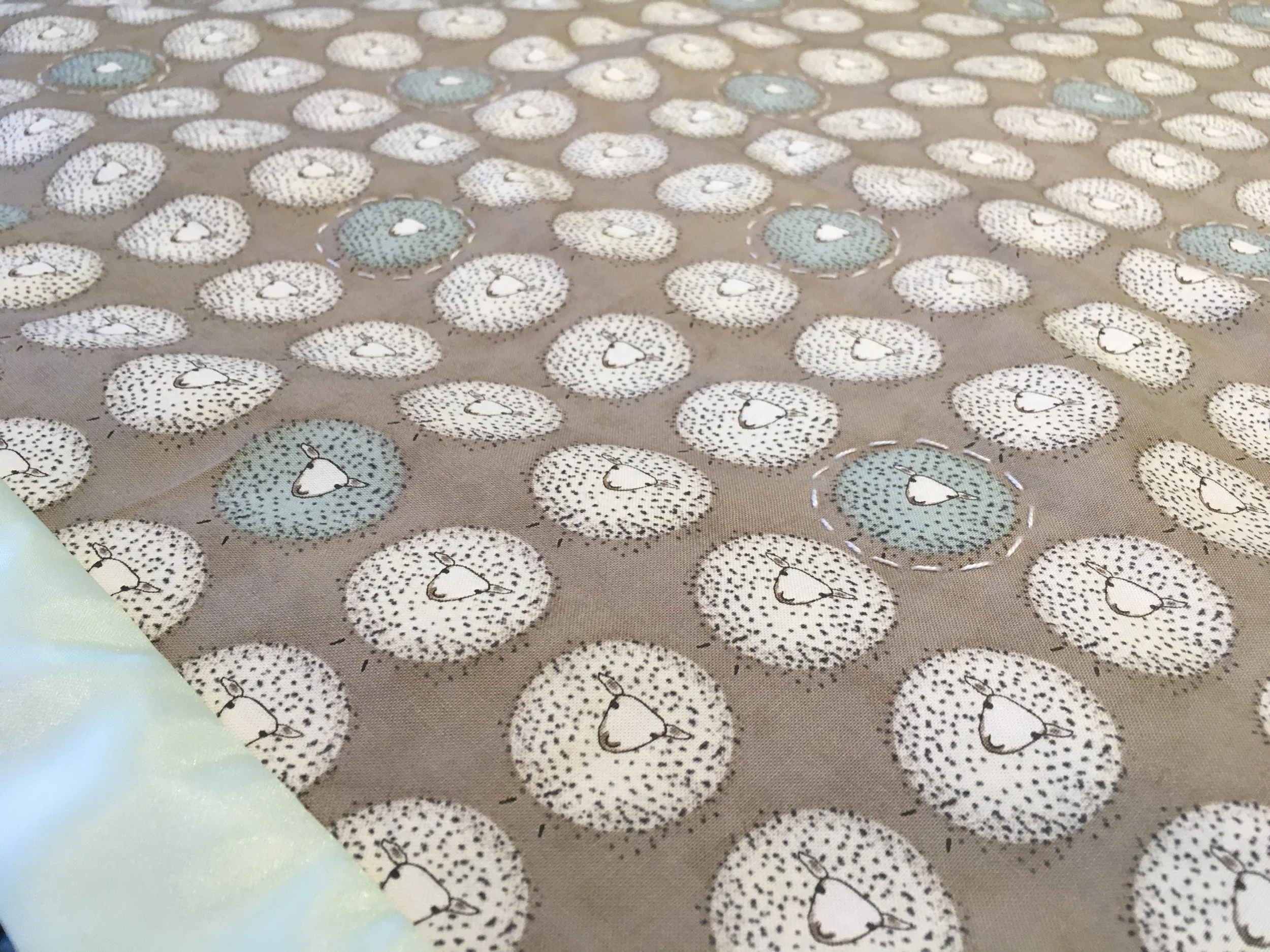 The hard part is over, phew! Now you may hand quilt however you like, using your preferred thread and technique. I used Perle Cotton and quilted around all the aqua lambs except for the ones nearest the binding.