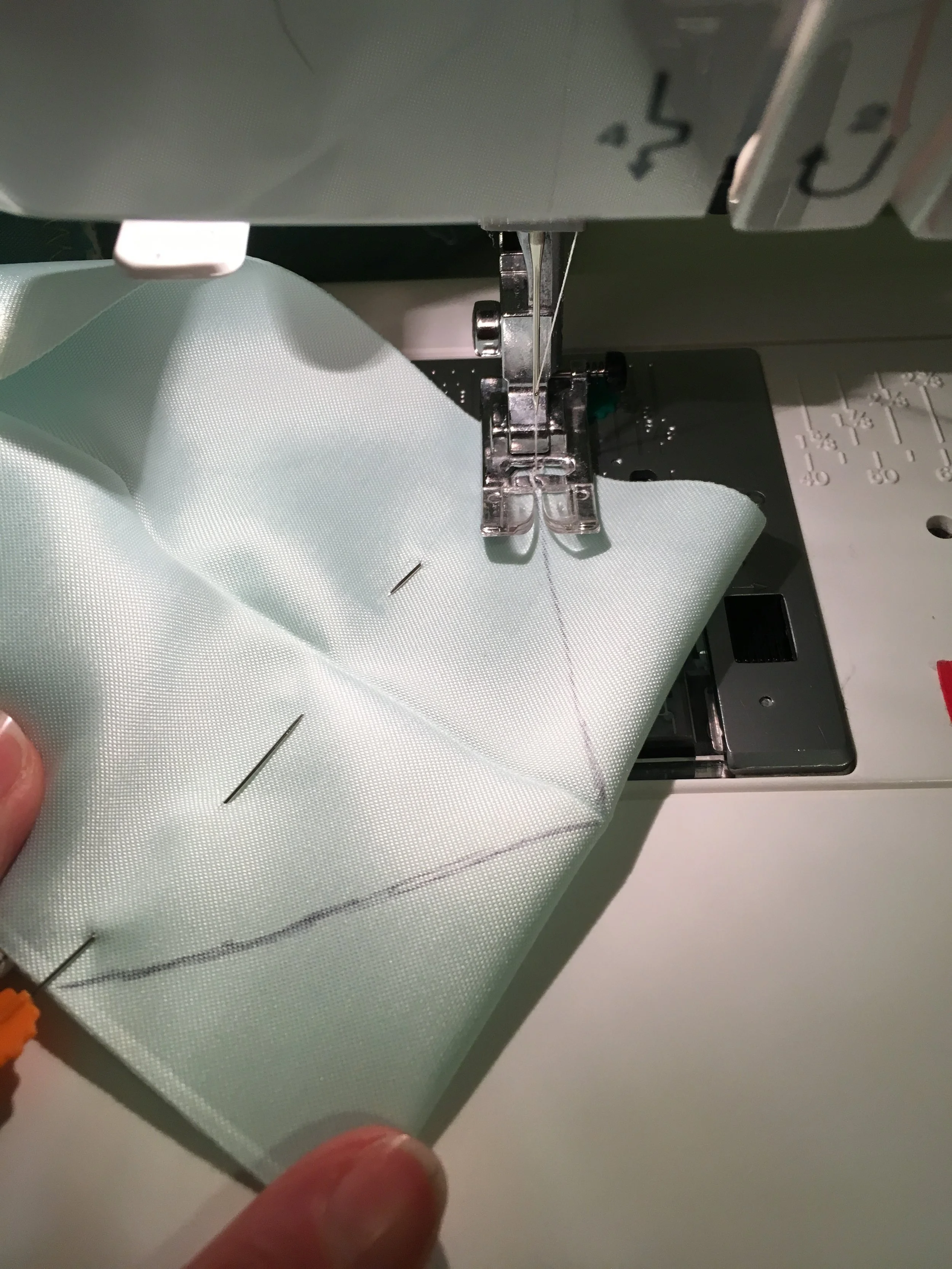 For a stitching guideline, draw two lines like so. For those of you who don't know, this is called mitering.