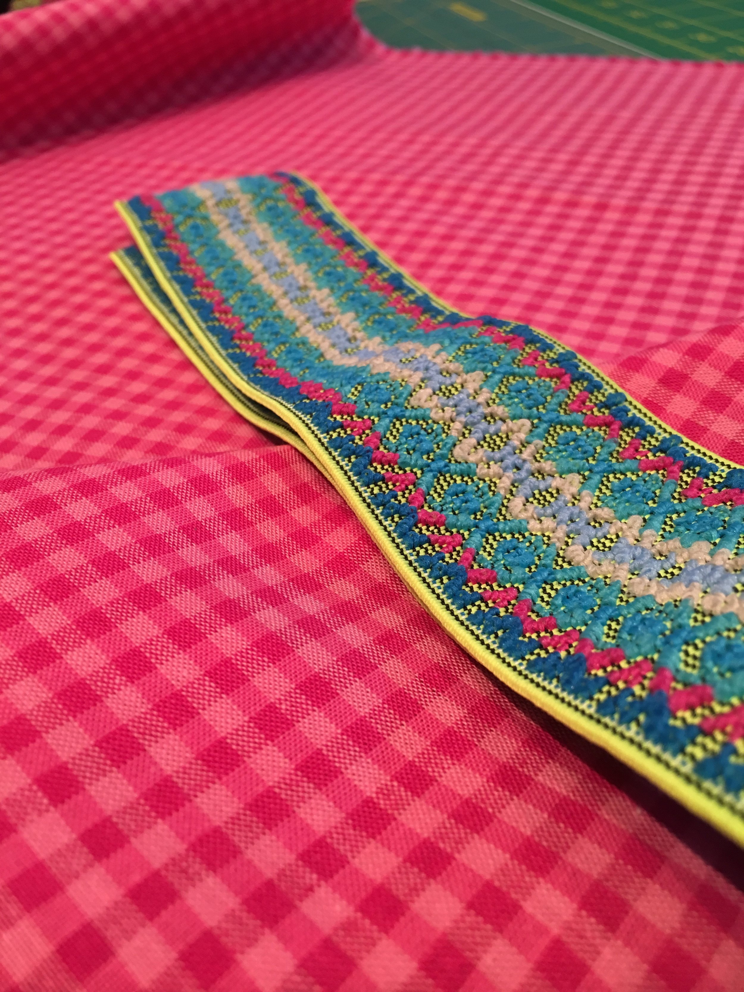 This cutie requires 5/8ths yard of fabric and 5/8ths yard of wide decorative elastic, that's it! When determining yardage use a two to one ratio of fabric length to elastic length. So my fabric length (the edge that will be sewed to the elastic) measures 44" and my elastic piece measures 22". This particular dress size ended up being a no-waste dress in that all materials were used, with no scraps left over. If you were making a different size and ended up with left over fabric consider adding pockets or ruffles to cut down on waste.