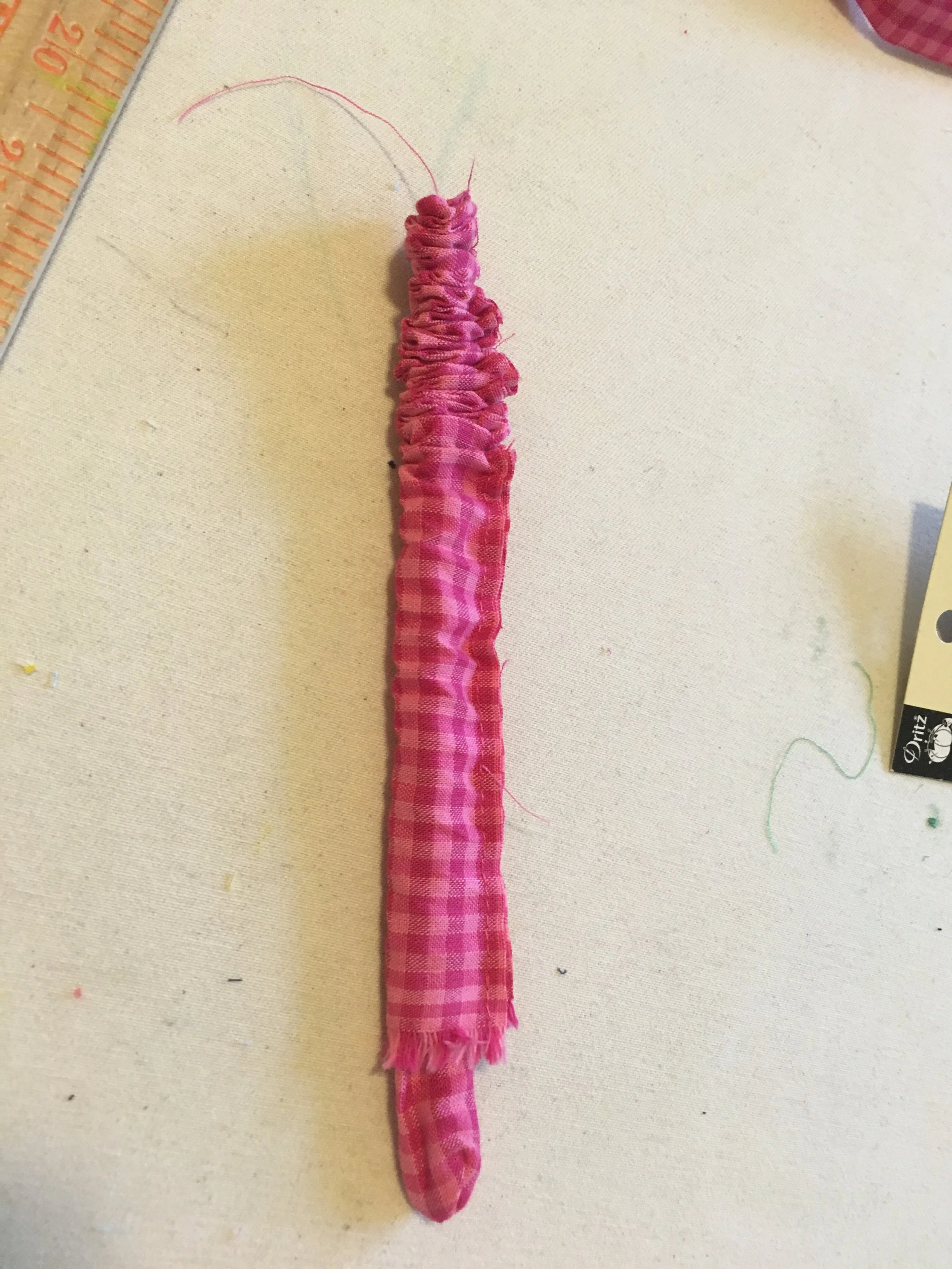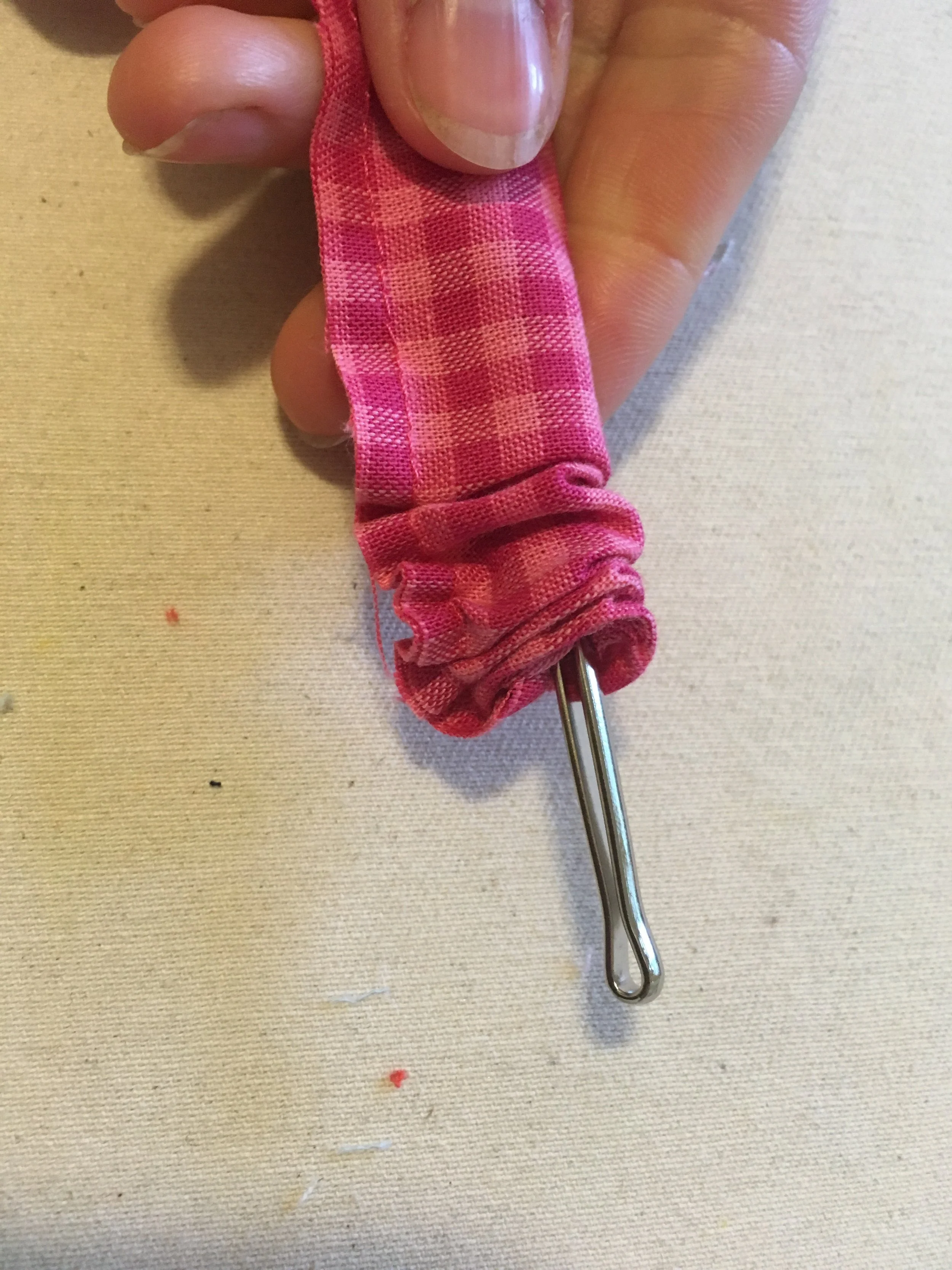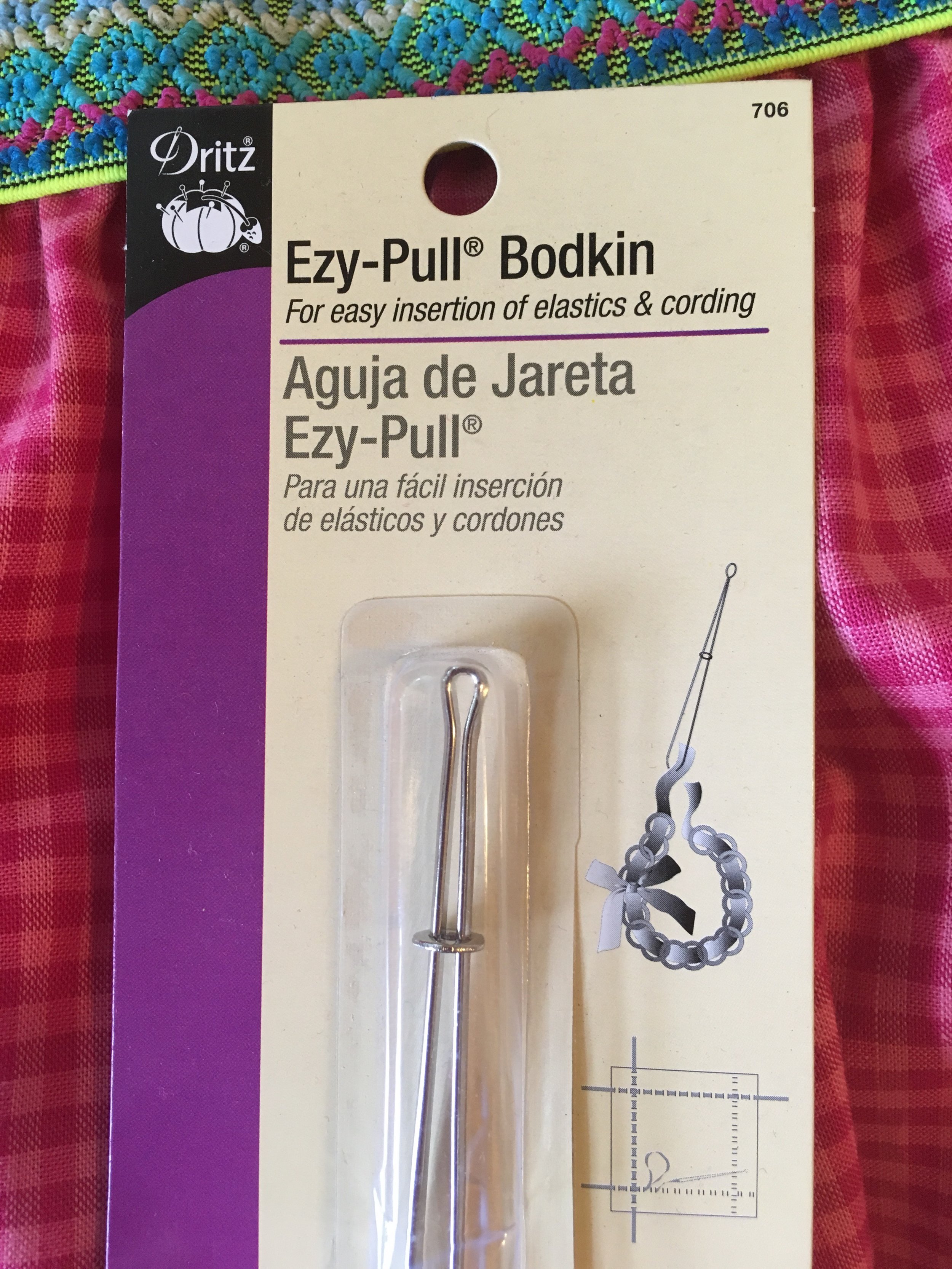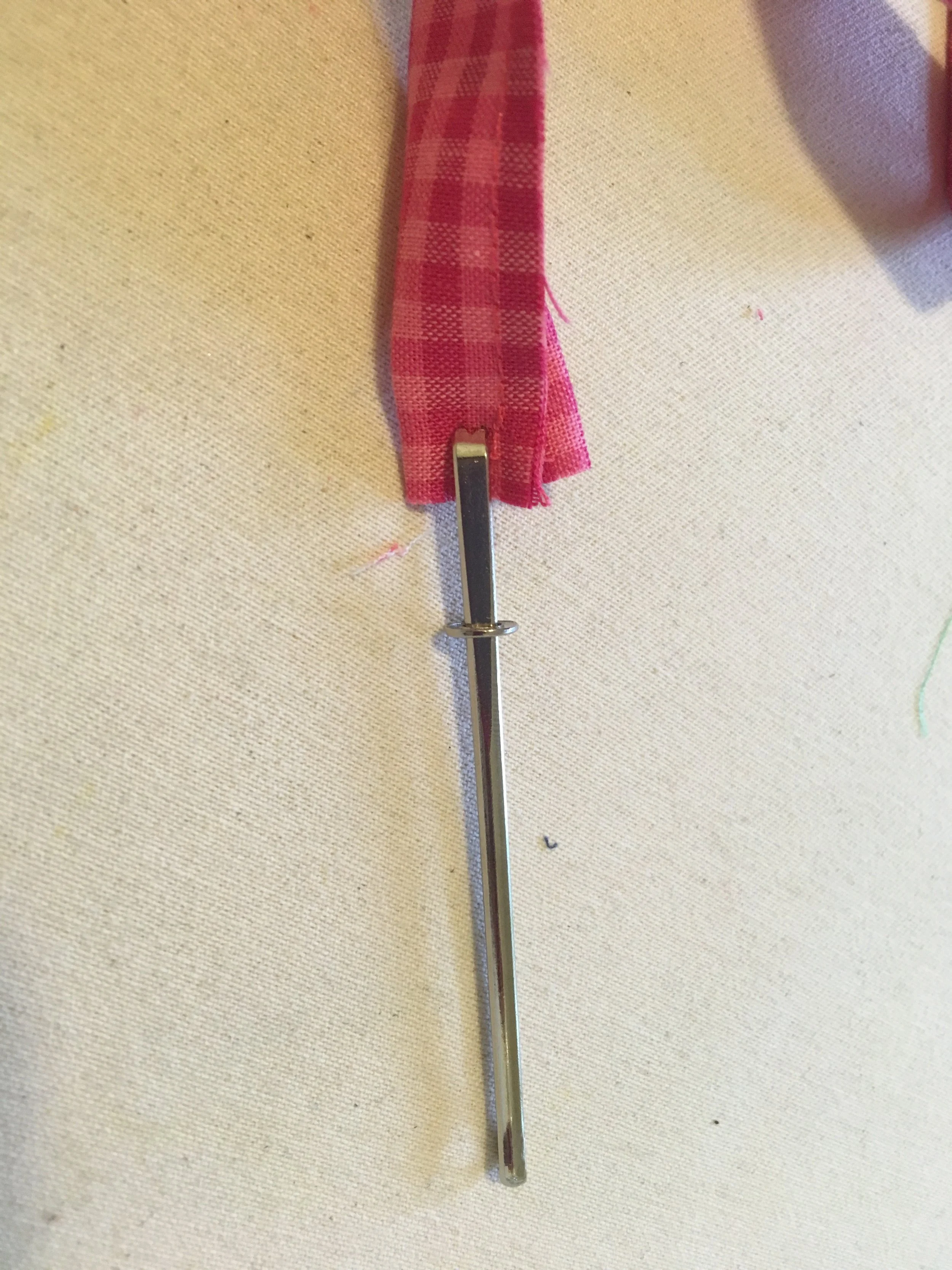 Then using this simple yet super handy and inexpensive tool named the Easy-Pull Bodkin by Dritz, pinch one end of a tie and then finagle it so that it goes through the tube. This will turn it right side out. Do this to all ties. Tube turning couldn't be easier with a bodkin and they are superior to the safety pin when running elastic or cording through a casing. It's a great tool to have on hand.