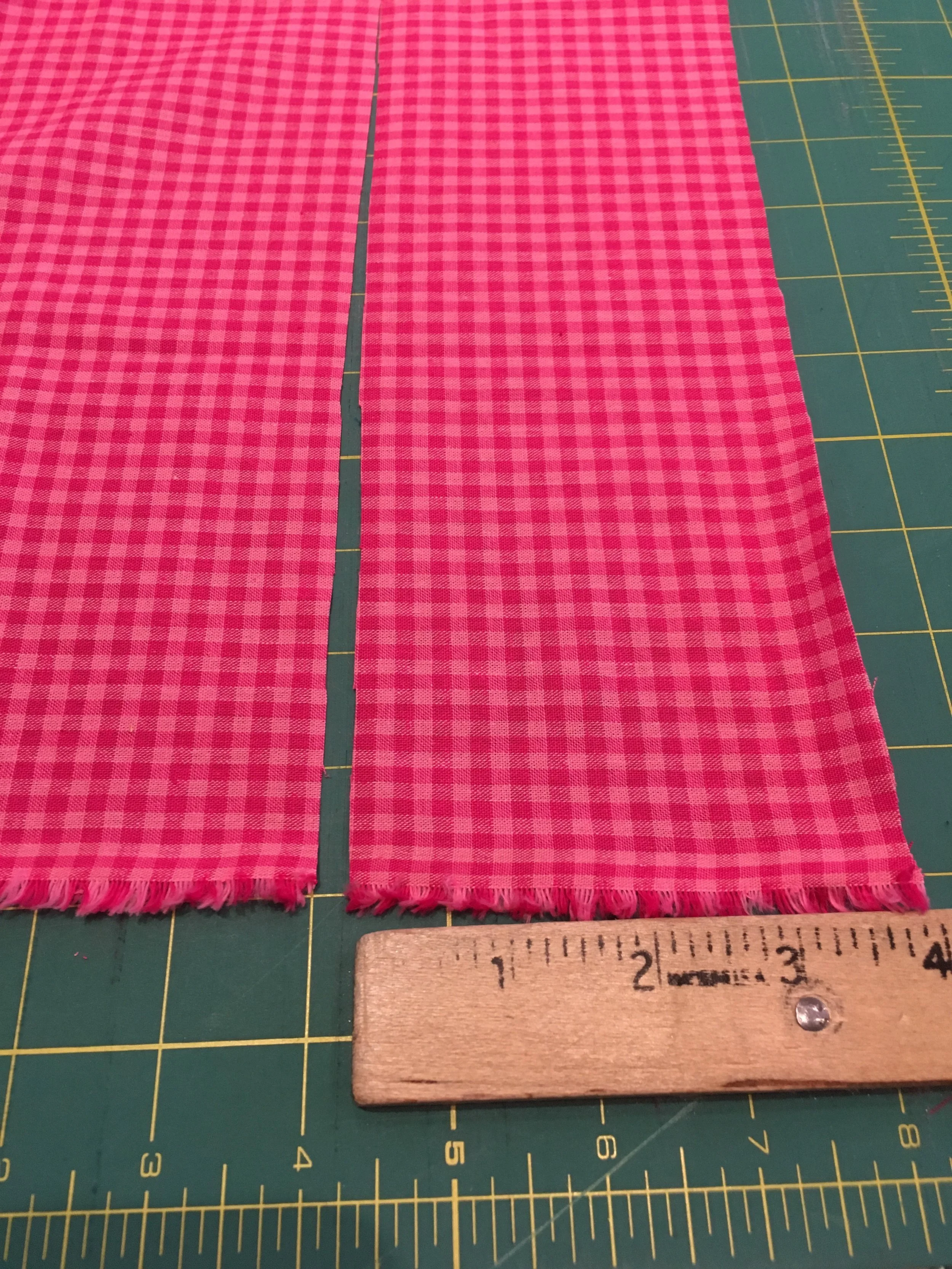 Cut 4" from one end of the fabric and then cut that in half lengthwise and then cut those two pieces in half widthwise. You will end up with four pieces approx. 2" by 22", these will be the ties. Fold each one of these in half, lengthwise, and stitch up that long raw edge using a 1/4" seam allowance.