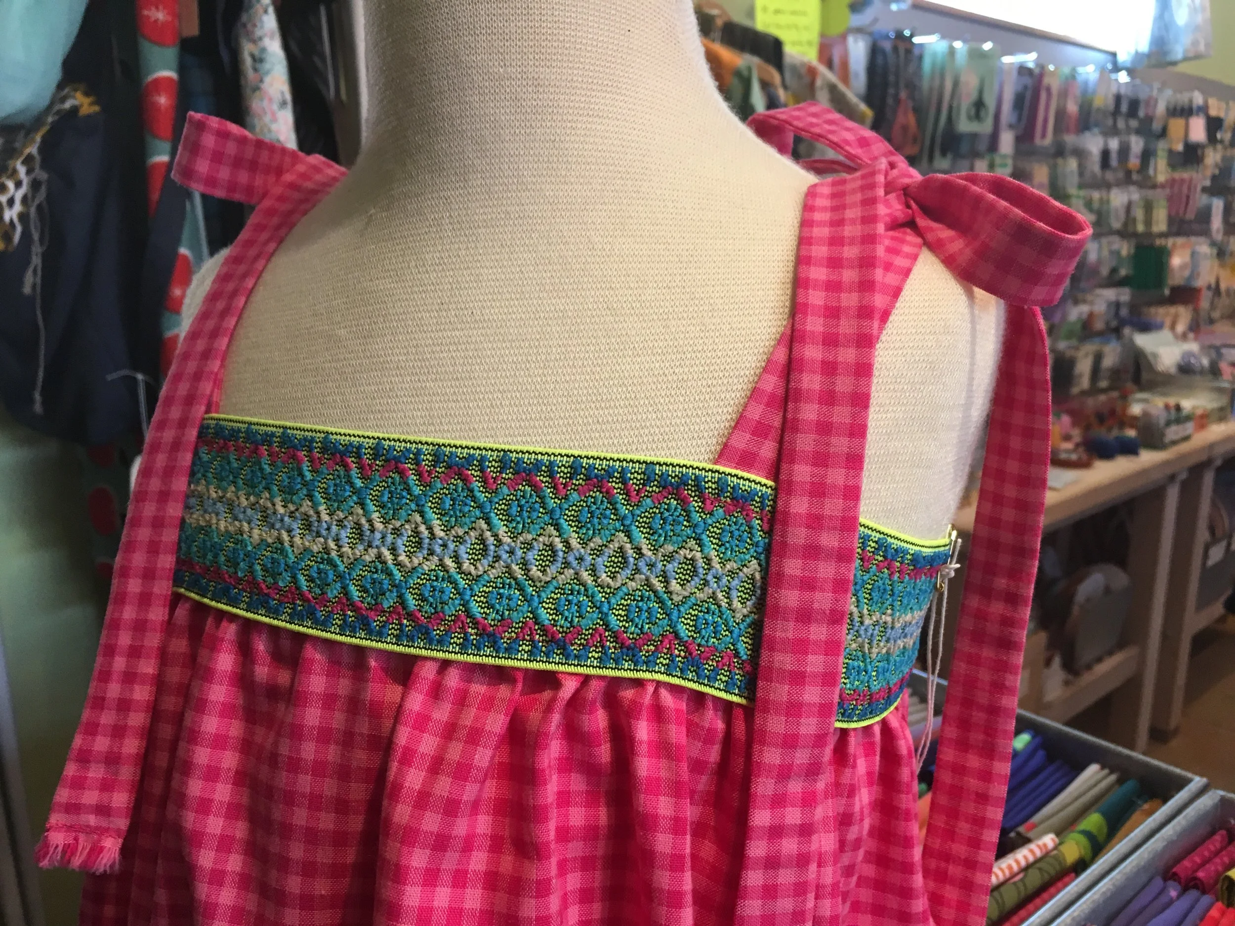 This is hands down one of the easiest dresses you could make for a little girl. It may also double as a shirt for a taller or older child. The one I whipped up would likely fit a child with the chest size of 26", roughly. It is made from an organic cotton homespun by Cloud 9 in a bright pink. We have other colors and styles to choose from, all of which would go well with this fun textured elastic.