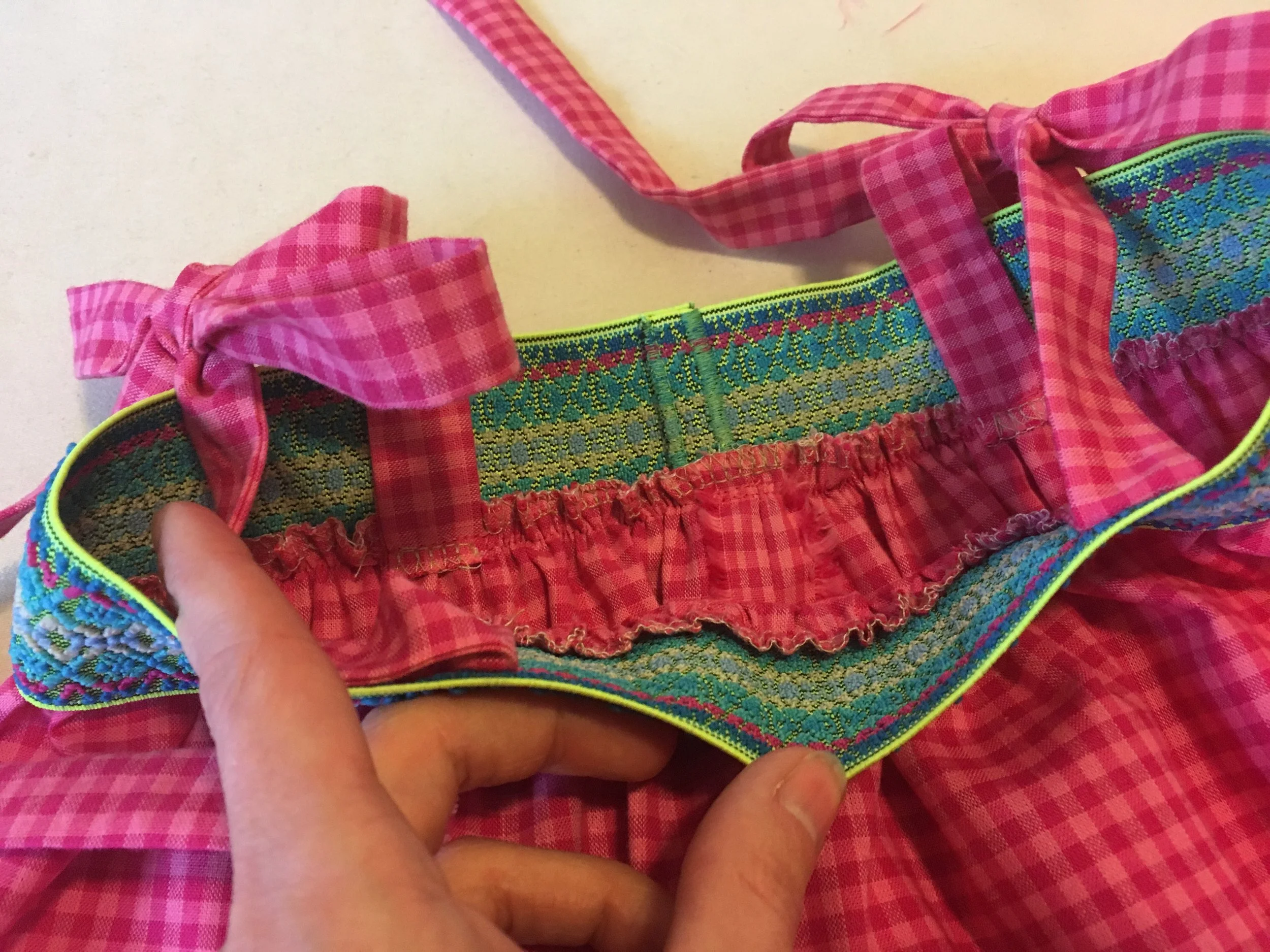 Once you pull it all the way through give it a good steamy press of the iron. I chose to leave the neatly provided selvages exposed, all I did was run a line of stitching close to the selvages just to help keep the ties flat. You can finish them however you prefer. Next, overlap the elastic and stitch together with a dense zigzag stitch on both raw ends. Take your 44" fabric piece and fold it like it was when it was on the bolt, stitch along selvage edges using a 5/8" seam allowance, press seam open and then hem the dress. Now, go ahead and finish the raw edge (that which will be attached to the elastic) with a over-lock stitch of some sort to prevent future fraying.