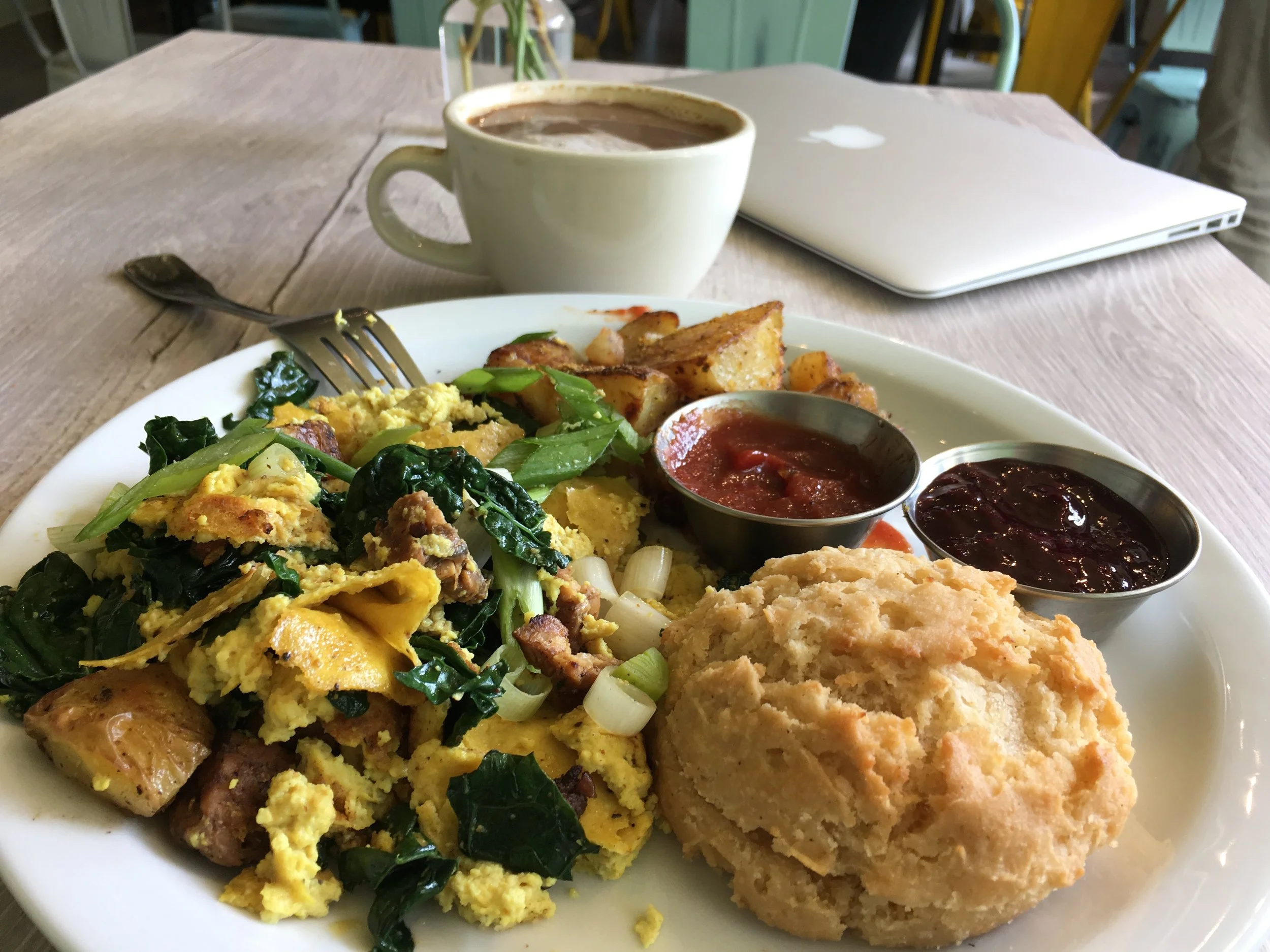 For those of you who don't know, Back to Eden started out as a sweet little vegan and gluten-free bakery that is now know as Back to Eden Dessert Bar and offers beautiful cupcakes, all sorts of amazing sweet pastries as well as interesting flavors of soft serve ice-cream. And well, they have expanded into a full-on restaurant right next door. I went there recently for my favorite first meal of the day. The atmosphere was clean and comforting and the food was scrumptious and satisfying. I had the tofu scrambler with fried potatoes and scratch ketchup accompanied by a fluffy biscuit with house-made jam.