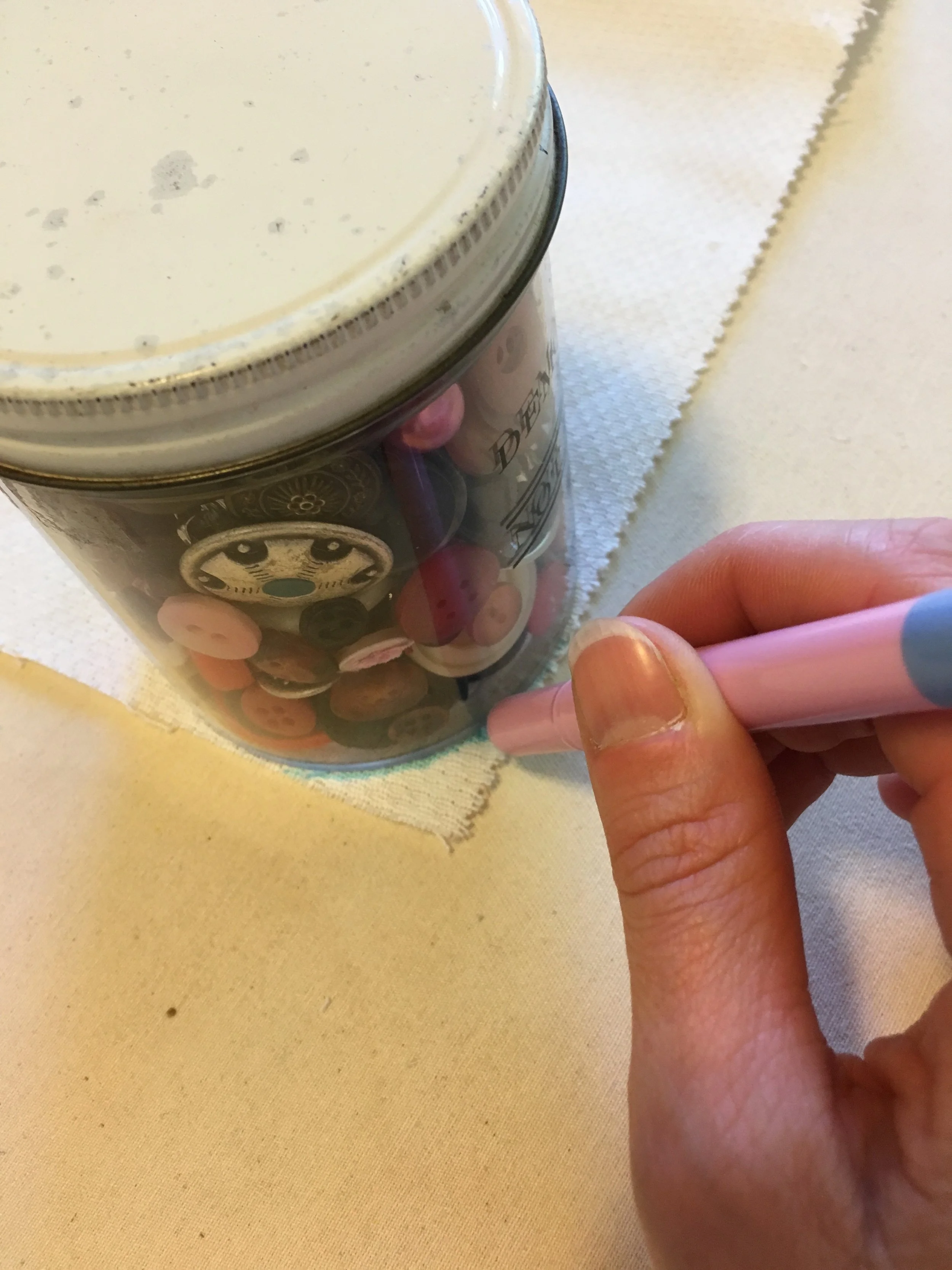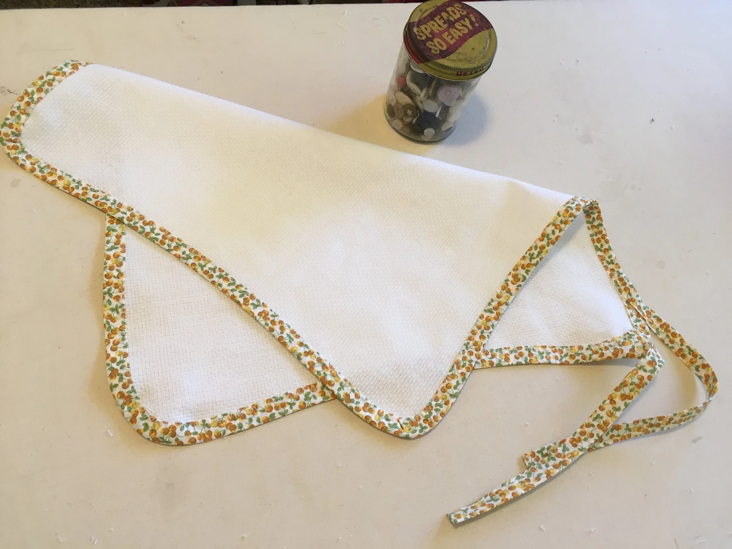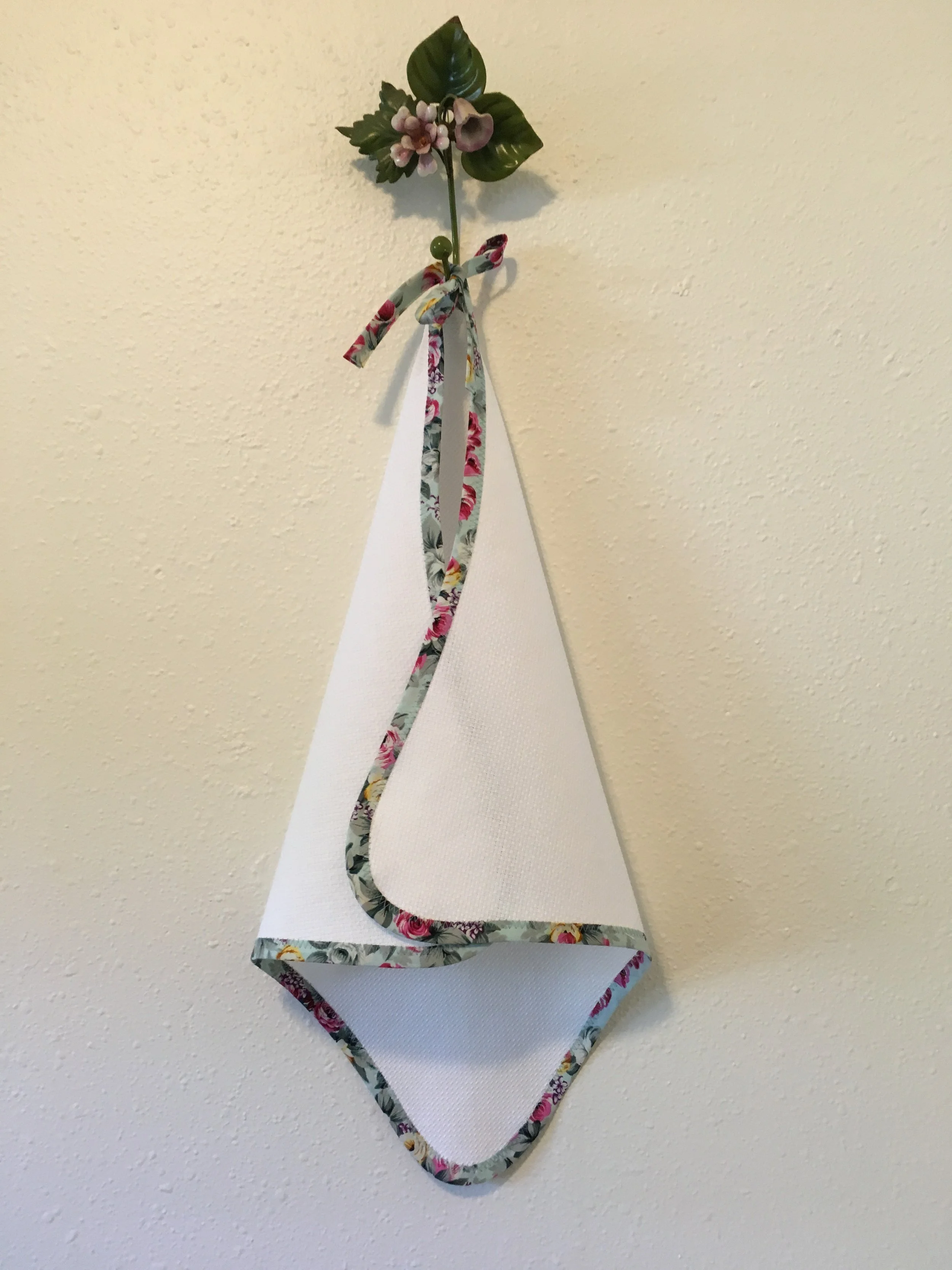 Huck toweling is fairly inexpensive and sometimes comes with nice finished selvages so that all you need to do is hem both raw ends. The type we currently have in the shop has pinked selvages instead of finished, so it's perfect for these bias tape trimmed towels. A half yard of huck toweling will make one square sized towel and of the bias tape, you will need about 2 5/8 yards.