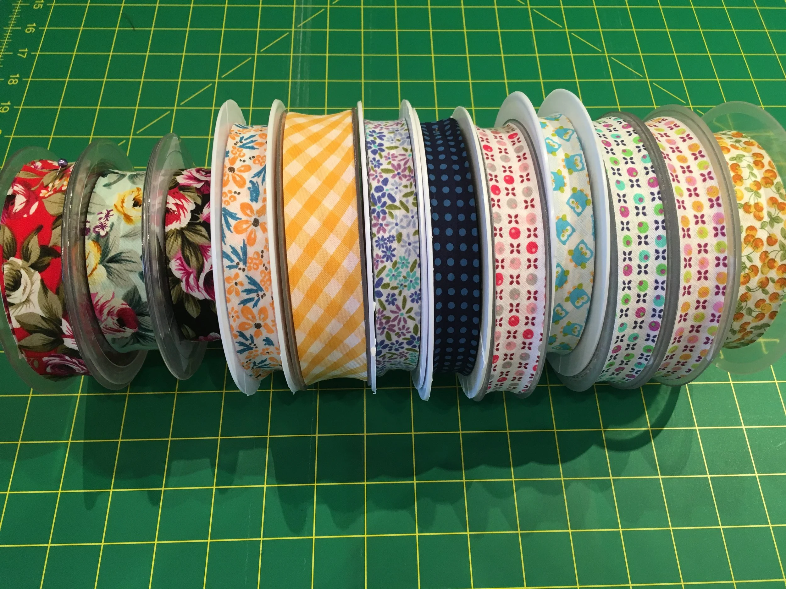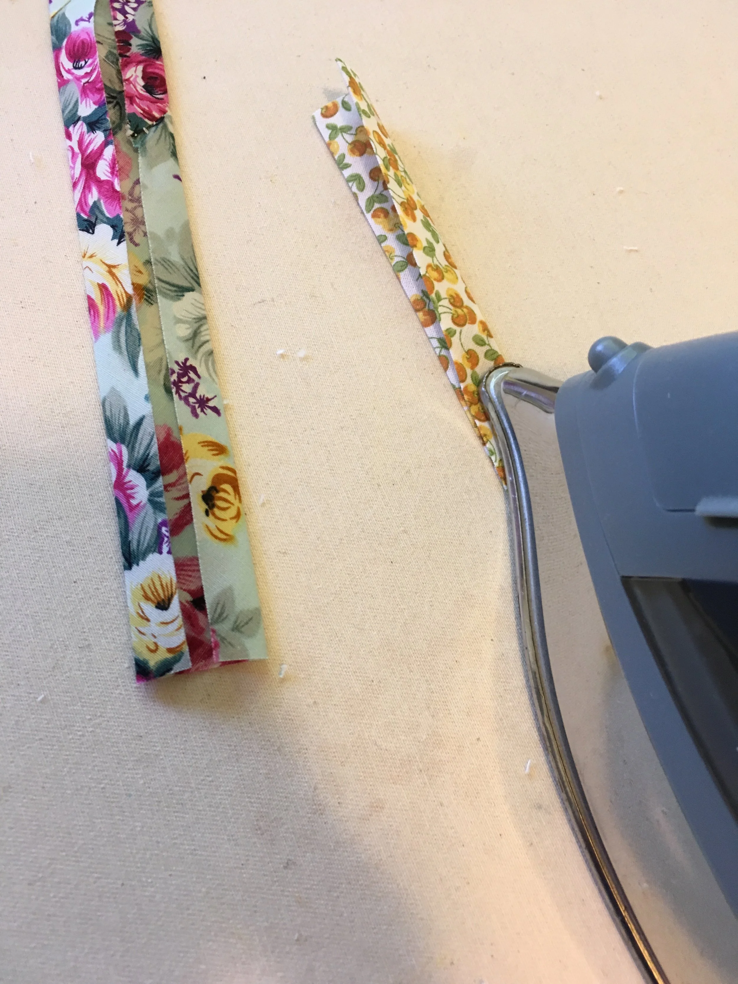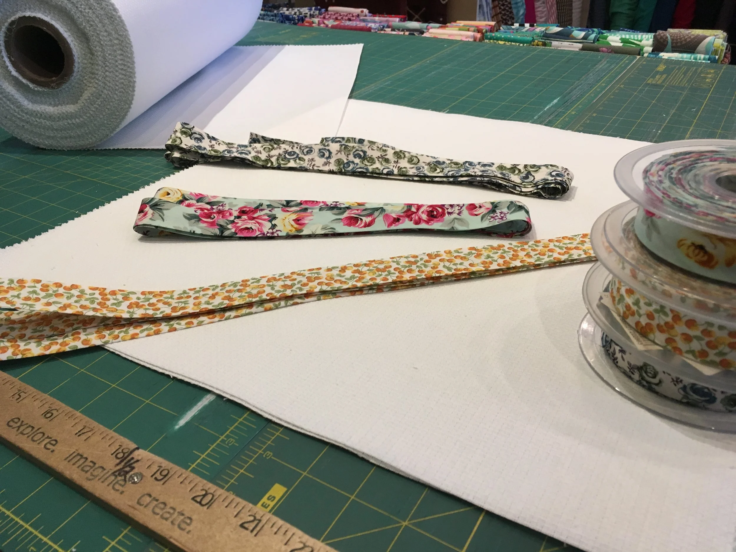 The floral bias tape on the left is how it is sold off the roll and the gold cherry tape on the right shows it being folded and pressed, which will make it much easier to sew around the toweling.