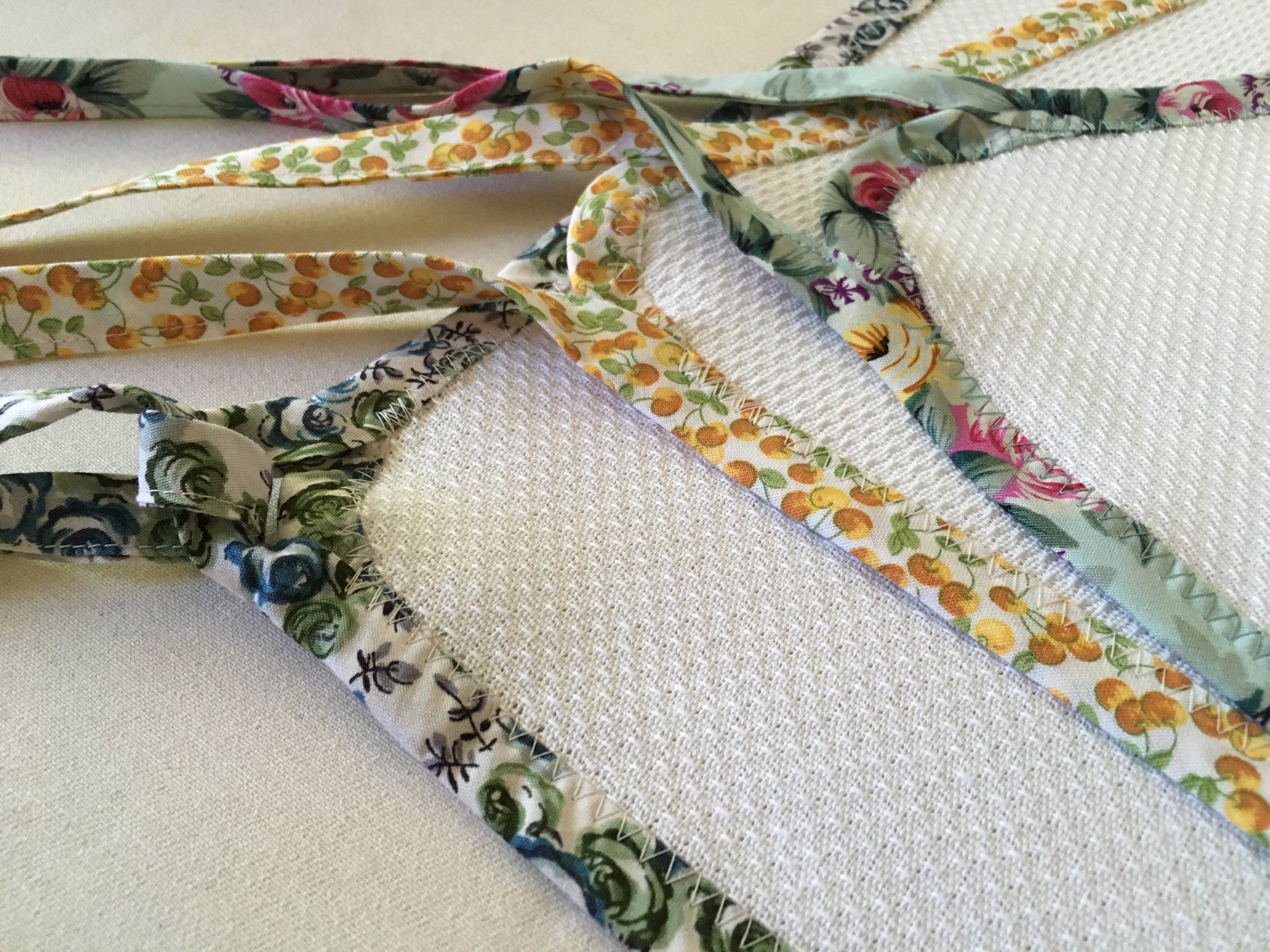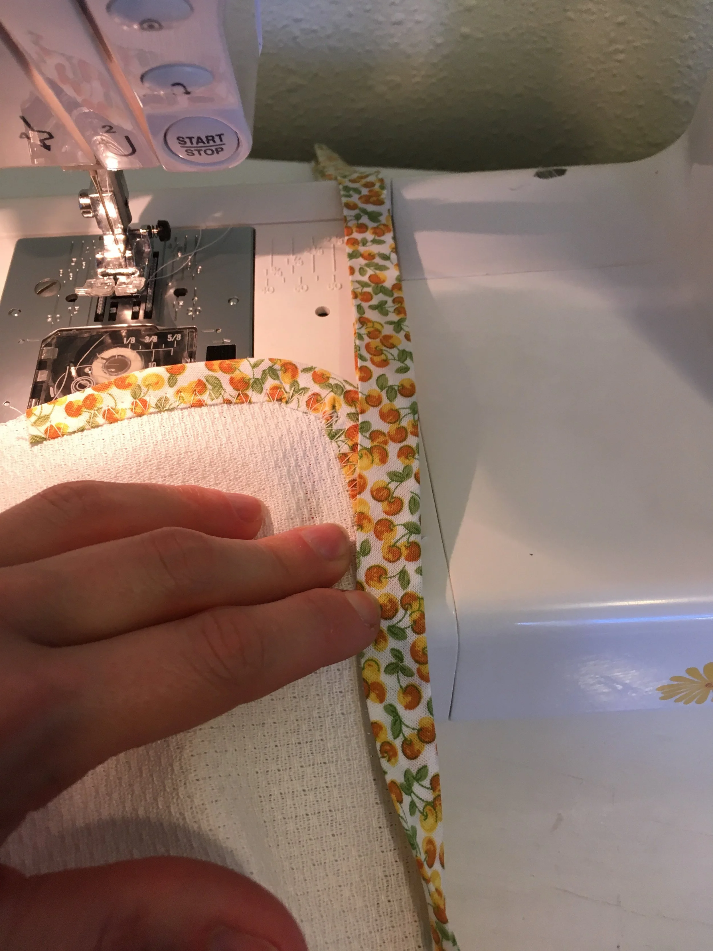 Then, with some length hanging off past the corner, about 10" or so, overlap the bias tape and start stitching all the way around. Once you zigzag stitch all the way around then you will fold the ends of the ties in and with a straight stitch finish the ties. The ties will enable them to be hung from a hook or tied onto the handle of an oven or refrigerator.