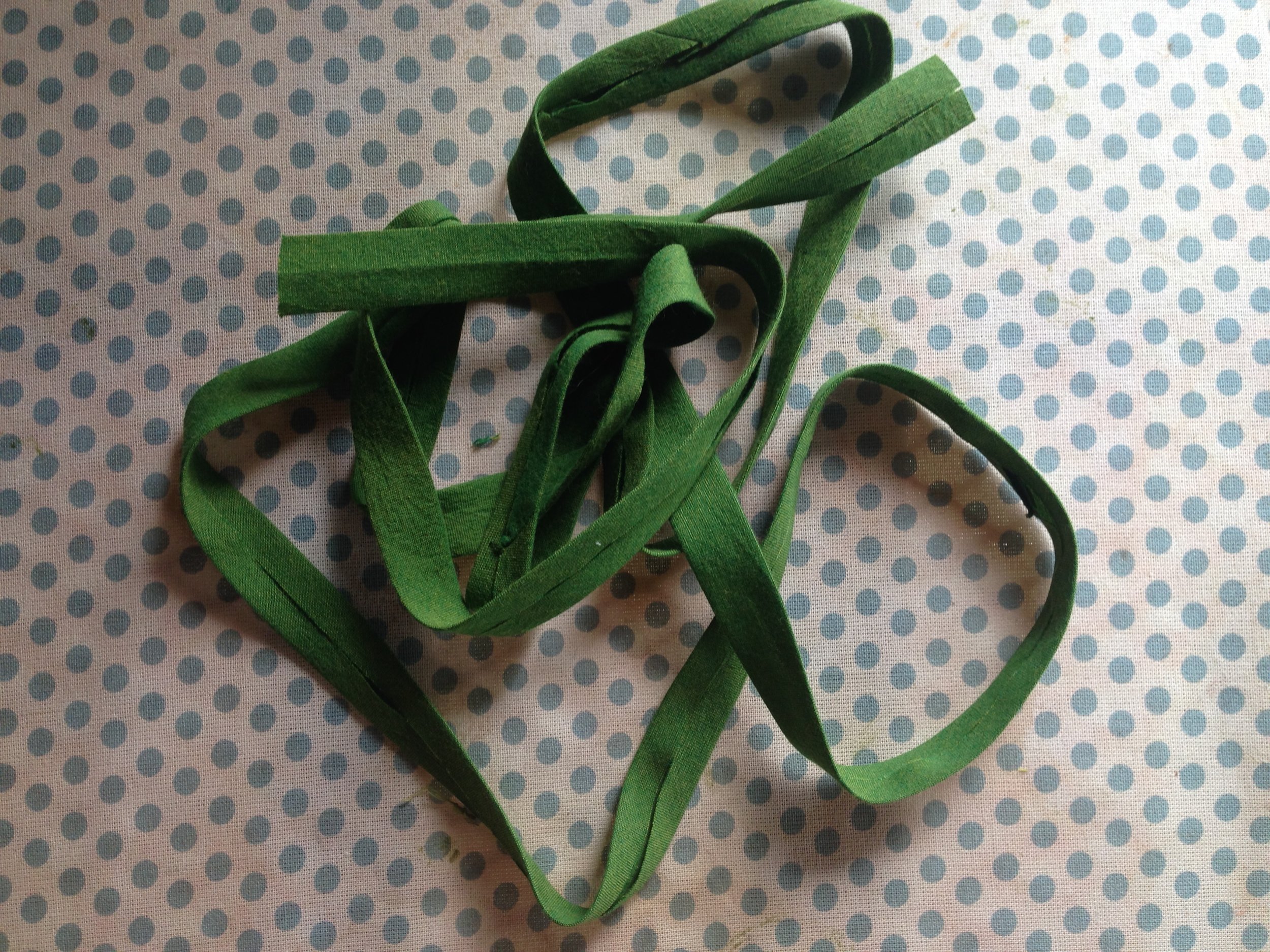 Voila! Bias tape in almost any size with out burnt fingers or extra notions. This is a great way to use up scrap fabric. I like to use shot cottons (seen here in my current favorite color, moss) for bias tape because they're soft and come in a wide variety of colors.
